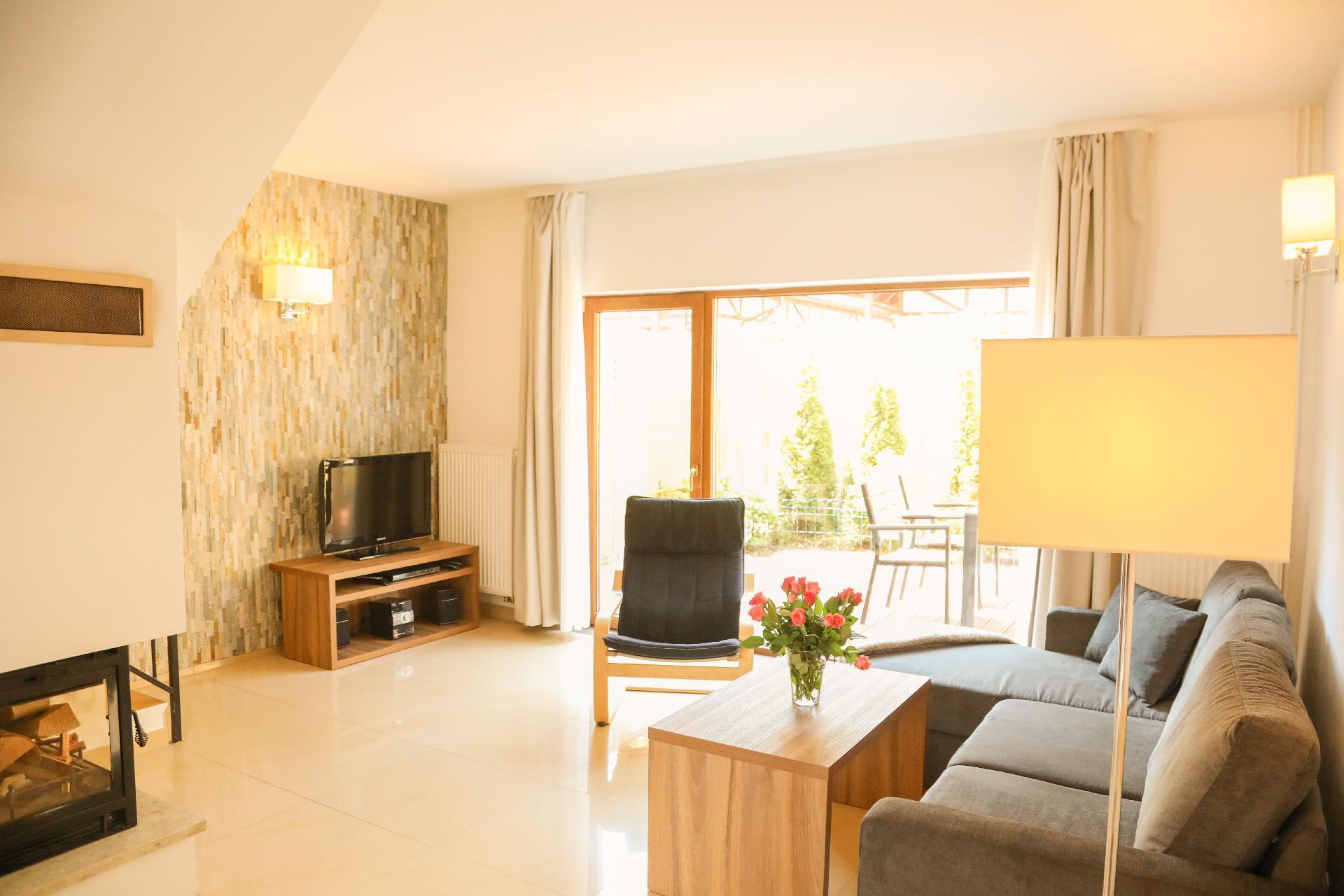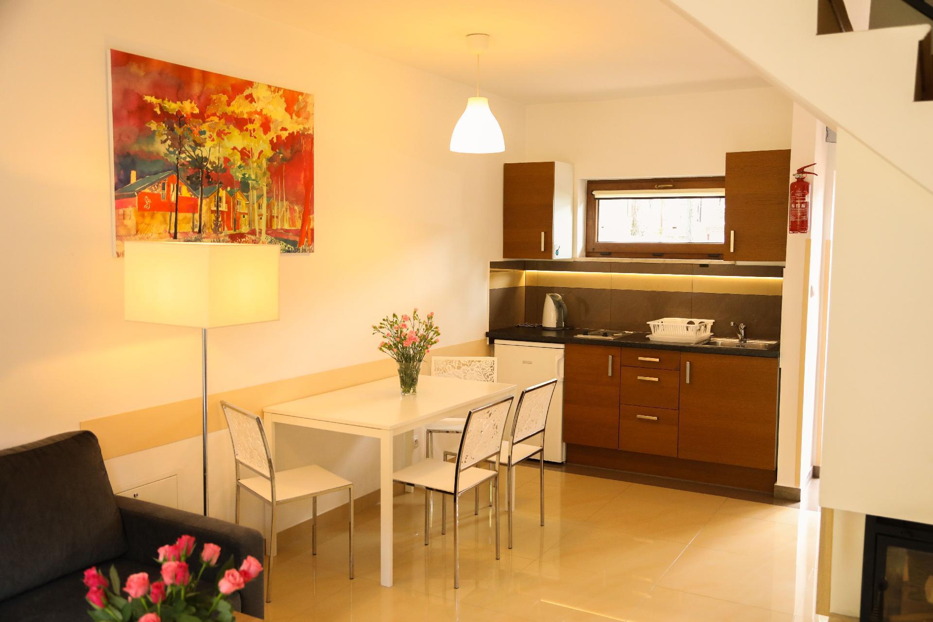 Das Premium-Ferienhaus mit einer Fläche von 65 m2 befindet sich auf dem Gelände des Pelikan Resort Dzwirzyno und ist in zwei Bereiche aufgeteilt - einen Freizeitbereich und einen privaten Bereich.Das Ferienhaus ist für vier Gäste ausgelegt (zwei Doppelzimmer). Es besteht jedoch die Möglichkeit, zwei Personen unterzubringen - in diesem Fall wird das Wohnzimmer in einen Schlafbereich umgewandelt (bitte besprechen Sie die Anzahl der Personen im Voraus mit dem Personal des Resorts).Das Erdgeschoss besteht aus einer Küchenzeile, einem Wohnzimmer mit Kamin, einem Ausgang zur Terrasse und einem Badezimmer. Im ersten Stock befinden sich zwei Doppelschlafzimmer und ein geräumiger Kleiderschrank.Heizung in den Wintermonaten durch einen Kamin.WOHNZIMMERDas gemütliche Wohnzimmer von 26 m2 ist mit einer Sofagarnitur - einem Ecksofa mit Schlaffunktion (für zwei Personen), einem bequemen Sessel und einem Couchtisch ausgestattet. Das Wohnzimmer hat auch eine Unterhaltungsecke - 32" TV und Musikanlage. Die Hauptattraktion des Ferienhauses ist der Eckkamin, der vor allem an Herbst- und Winterabenden für eine einzigartige, gemütliche Atmosphäre sorgt. - KÜCHE MIT ESSZIMMERDie Küchenzeile ist mit dem Wohnzimmer durch einen Essbereich mit einem Tisch für vier Personen verbunden. Die Küche besteht aus einem gut ausgestatteten Bereich für die Zubereitung von Mahlzeiten (Töpfe, Pfannen, Elektroherd). Jedes Haus verfügt über komplettes Geschirr für 6 Personen, Gläser und einen Weinöffner. - GARTENDurch ein großes Panoramafenster im Wohnzimmer gelangt man direkt in den Garten, der in eine elegante Terrasse integriert ist, die mit Tisch und Stühlen und einem Grillplatz ausgestattet ist (zu mieten beim Personal der Unterkunft). - BADEZIMMERDer letzte Raum im Erdgeschoss ist das 3 m2 große Badezimmer. Jedes Badezimmer ist mit einer Dusche mit hoher Duschwanne (was das Baden von Kindern noch einfacher macht), einer Toilette und einem großen Waschbecken mit Unterschrank ausgestattet. Die Einrichtung der Zimmer ist in natürlichen, warmen Farben (Braun- und Beigetöne) gehalten, die nach einem aufregenden und abenteuerlichen Tag zum Entspannen einladen. Handtücher können gemietet werden - bitte fragen Sie das Personal des Resorts nach Einzelheiten. - SCHLAFZIMMER 1Das Doppelzimmer ist mit zwei Einzelbetten mit Nachttischen und Lampen ausgestattet. Darüber hinaus verfügt das Zimmer über einen geräumigen Kleiderschrank und eine geräumige Kommode. Die Hauptattraktion des Zimmers ist ein großes Panoramafenster - SCHLAFZIMMER 2Das Schlafzimmer ist mit einem QUEEN SIZE-Doppelbett, Nachttischen mit Lampen sowie einem geräumigen Kleiderschrank und einer Kommode ausgestattet. Zusätzlich gibt es einen Schminktisch mit einem Stuhl. Das Zimmer hat Zugang zu einer privaten Terrasse von 6m2, auf der Loungemöbel zur Verfügung stehen.BESONDERE BEDÜRFNISSE UND DIENSTLEISTUNGENETOSTER - es besteht die Möglichkeit, einen Toaster kostenlos zu mieten. Bitte melden Sie Ihre Anfrage an das Personal des Resorts.PARAVANTS UND LEGGES - sind auf Anfrage erhältlich. Bitte wenden Sie sich an das Personal des Resorts.BBQ - Grillausrüstung ist vorhanden. Bitte kontaktieren Sie das Personal. Die Anlage stellt keine Kohle zur Verfügung.BRIKETTE/CHIMMERHOLZ - Brennholz kann erworben werden. WASCHMASCHINE - auf dem Gelände der Ferienanlage befindet sich eine Waschmaschine, die nach vorheriger Absprache mit dem Personal der Ferienanlage benutzt werden kann.