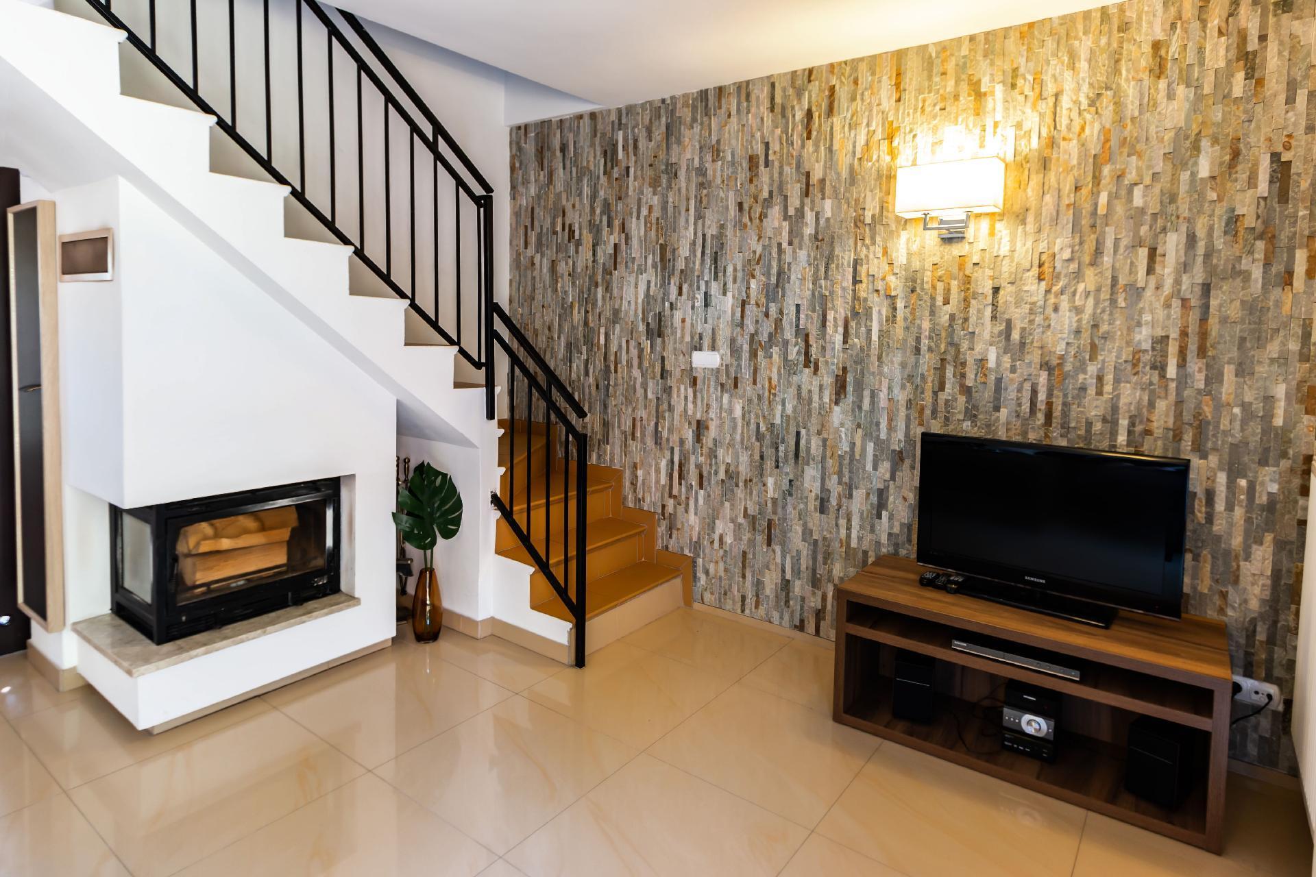 WOHNZIMMER Das komfortable Wohnzimmer von 26 m2 ist mit einer Sofagarnitur ausgestattet - einem Ecksofa mit Schlaffunktion (für zwei Personen), einem bequemen Sessel und einem Couchtisch. Das Wohnzimmer hat auch eine Unterhaltungsecke - 32" TV und Musikanlage. Die Hauptattraktion des Ferienhauses ist der Eckkamin, der vor allem an Herbst- und Winterabenden für eine einzigartige, gemütliche Atmosphäre sorgt.