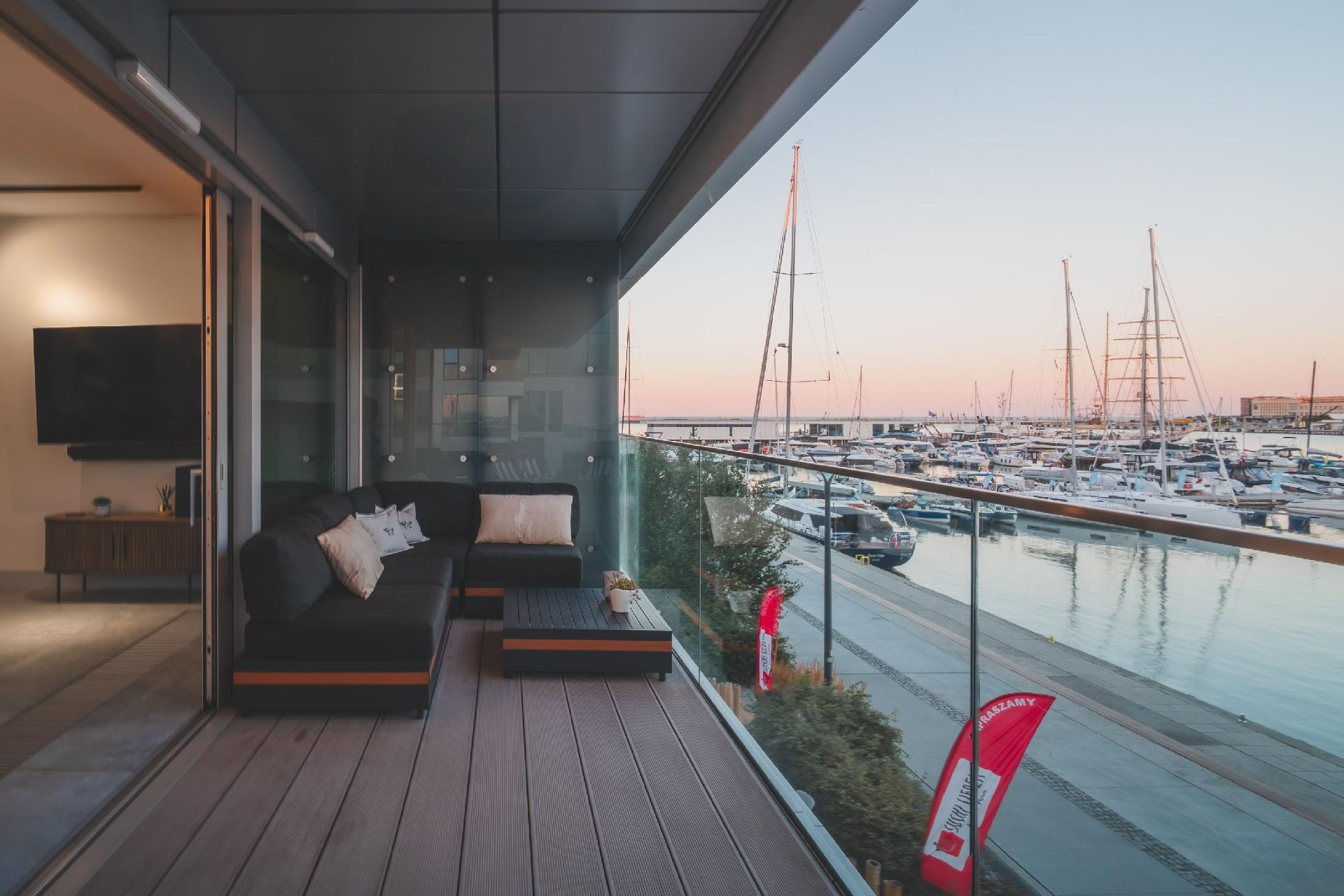 Große Balkonschiebetüren machen das Yachtbecken zu einer natürlichen Erweiterung der Wohnung.