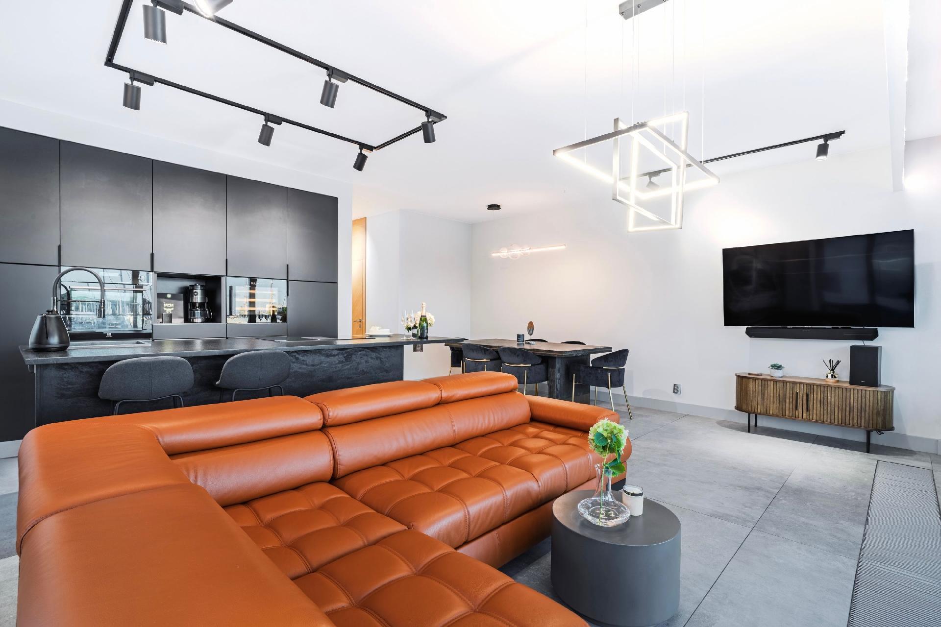 Modern eingerichtet mit einem großen Wohnzimmer und Zugang zur Terrasse mit Blick auf den Yachthafen, offener Küche, zwei Schlafzimmern und zwei Bädern.