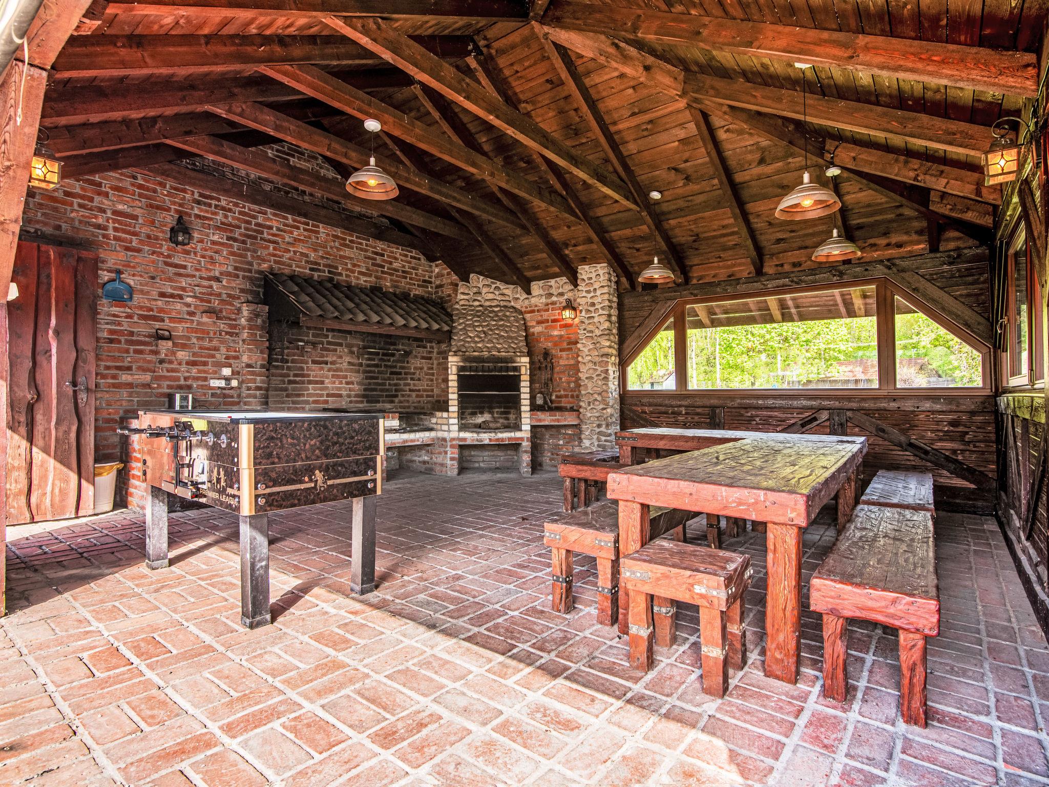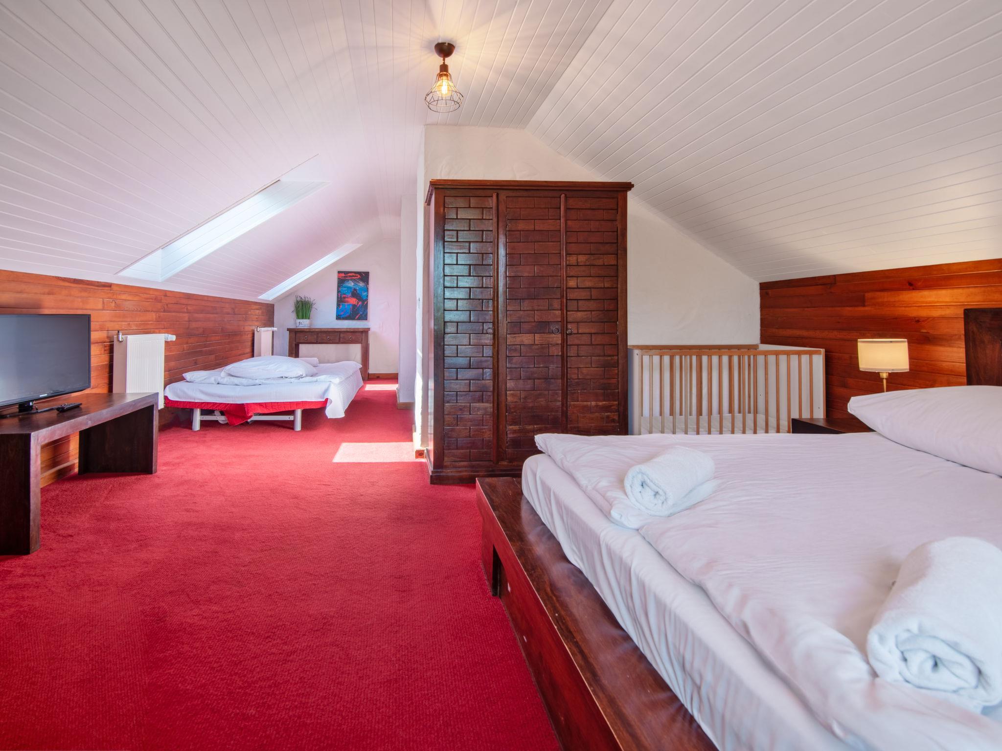 8-Zimmer-Haus 400 m2 auf 3 Stockwerken. Wohnzimmer 50 m2 mit TV (Flachbildschirm), Video, Radio, Stereoanlage und DVD. Esszimmer 27 m2. Ausgang zum Garten, zur Terrasse. Küche 12 m2 (Backofen, Geschirrspüler, 4 Glaskeramikplatten, Mikrowelle, Tiefkühler). Sep. WC. Obergeschoss: 2 Zimmer 20 m2, jedes Zimmer mit 3 Betten (90 cm, Länge 200 cm), Waschbecken, Dusche/WC, TV und Video. 1 Zimmer 22 m2 mit 1 franz. Bett (160 cm, Länge 200 cm), offenem Kamin, Waschbecken, Dusche/WC, TV und DVD. 1 Zimmer 19 m2 mit 1 franz. Bett (160 cm, Länge 200 cm), offenem Kamin, Waschbecken, Dusche/WC und TV. 1 Kinderzimmer 15 m2 mit 1 Bett (70 cm, Länge 170 cm), 1 x 2 Etagenbetten (80 cm, Länge 180 cm). Dachgeschoss: 1 abgeschrägtes Zimmer 30 m2 mit 1 Diwanbett (120 cm, Länge 190 cm), 1 franz. Bett (160 cm, Länge 200 cm), Dusche/WC, mit Eckbadewanne, TV und DVD. Holzheizung, Ölheizung, Boiler (300 Liter). Terrasse 60 m2. Terrassenmöbel, Liegestühle (3), Abstellkammer. Schöne Sicht auf den See und die Landschaft. Zur Verfügung: Waschmaschine, Wäschetrockner, Babybett bis 3 Jahre. Internet (WLAN, gratis). Parkplatz beim Haus. Bitte beachten: Nichtraucher-Haus. Private Bootsanlegestelle. Maximal 2 Haustiere/Hunde erlaubt. Im Haus können max. 13 Erwachsene, 3 Kinder und 3 Babies eingemietet werden. Ein Spielfeld (Fläche 36 x 18 m) zum Basketball, Volleyball, Handball, auch als Tennisplatz und ein Platz zum Skaten.