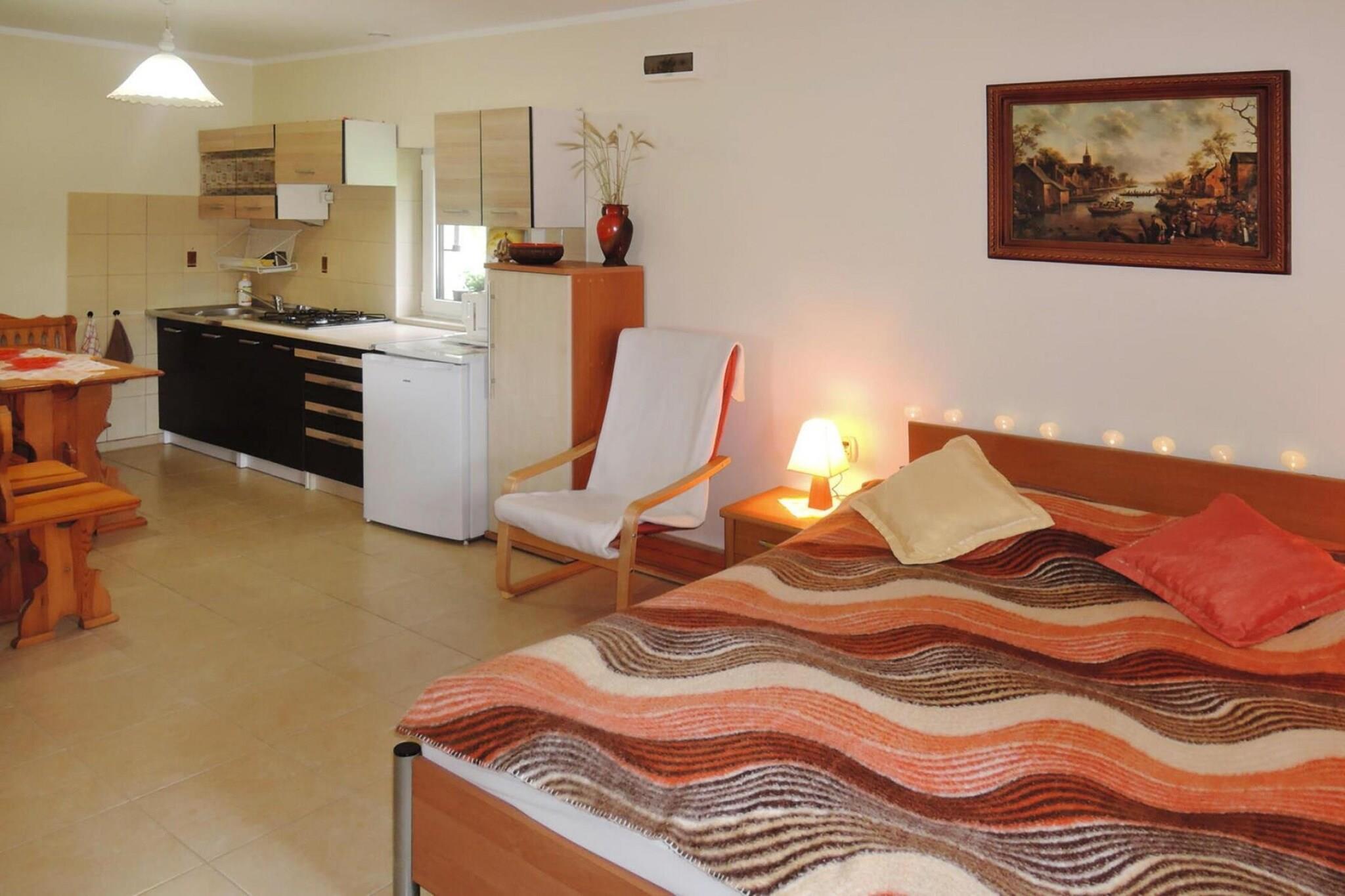 Kleines, gepflegtes Ferienhaus - ideal für einen ruhigen, naturnahen Urlaub zu zweit. Das Ferienhaus liegt abseits des Massentourismus inmitten herrlicher Natur - ein Paradies für Wanderer, Angler, Pilzsammler und alle, die sich gern an frischer Luft aufhalten und verschiedenen Outdooraktivitäten nachgehen. Aber auch Strandvergnügen und Badeurlaub steht nichts im Wege, denn die schönen Ostseestrände sind nur drei Kilometer entfernt. Das kleine Dorf Kolczewo liegt in der Mitte der Insel Wollin direkt am Kolzower See und nur eine kurze Fahrt von den Ostseestränden entfernt. Hier genießen Sie die Ruhe der Natur, sind aber trotzdem schnell in den lebhaften Badeorten der Ostsee. LInienbusse befürdern Sie darüber hinaus bequem in die Städte Kolberg oder Swinemünde und im Sommer fahren diese sogar recht häufig. HighLights : Kurtaxe Aktivitäten in der Nähe : Ein großer Teil der Insel Wolin ist als Nationalpark unter Schutz gestellt. Hier können Sie wunderbare Spaziergänge und Radtouren unternehmen. Strandnixen und Badefans finden Ihr Glück im Ostseebad Misdroy, das zu den schönsten Seebädern an der polnischen Küste gehört. Dort befindet sich auch das Nationalpark-Museum. Spannend für die ganze Familie ist ein Besuch des Wisentgeheges Mobilität : Nicht geeignet für Personen mit eingeschränkter Mobilität