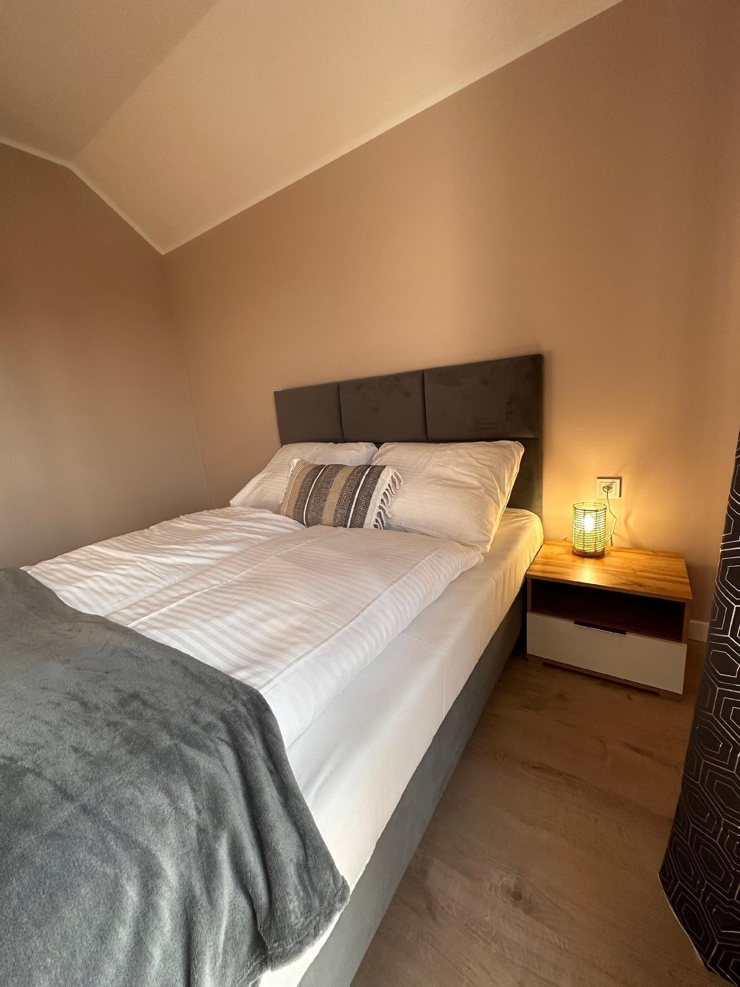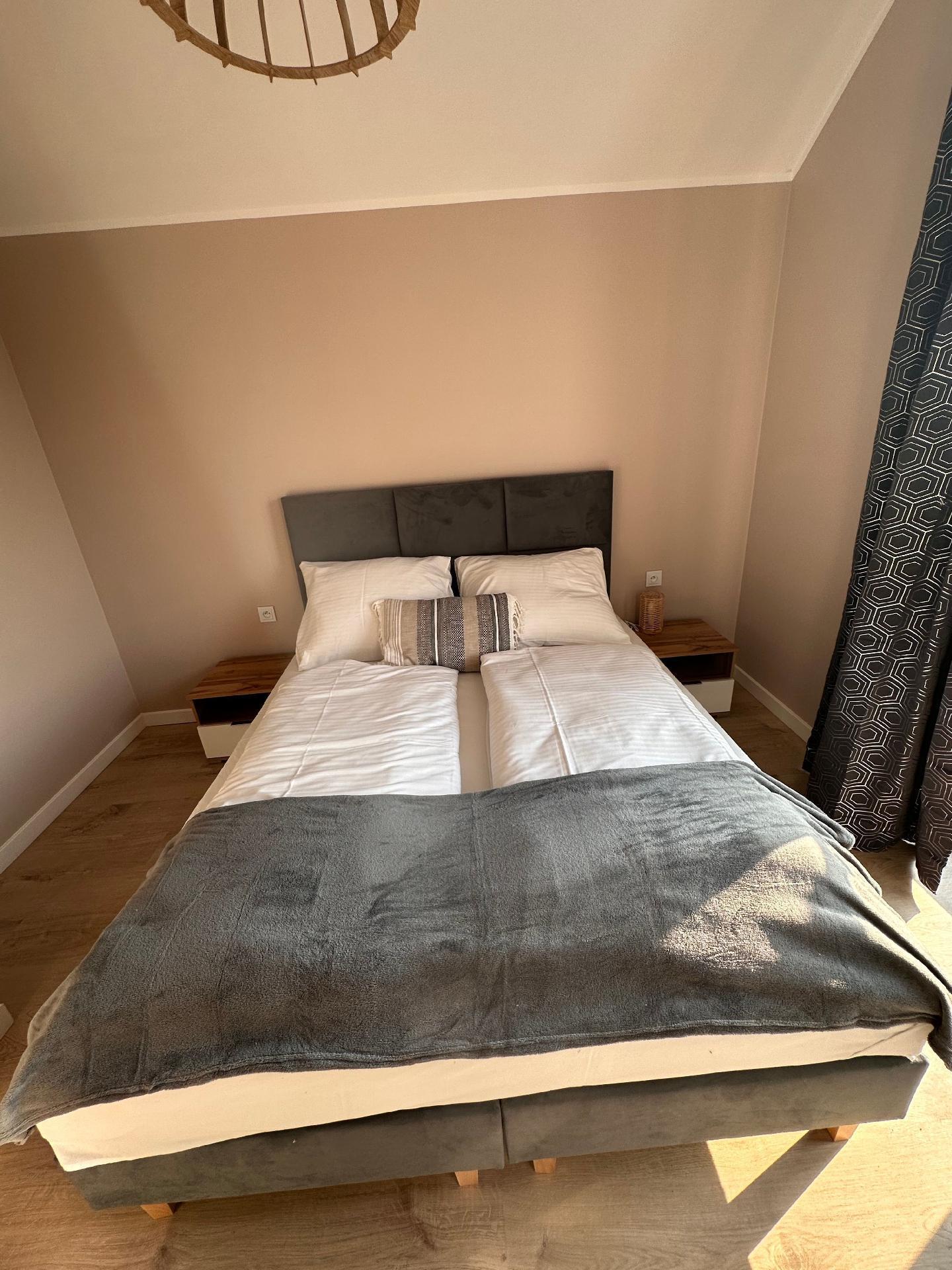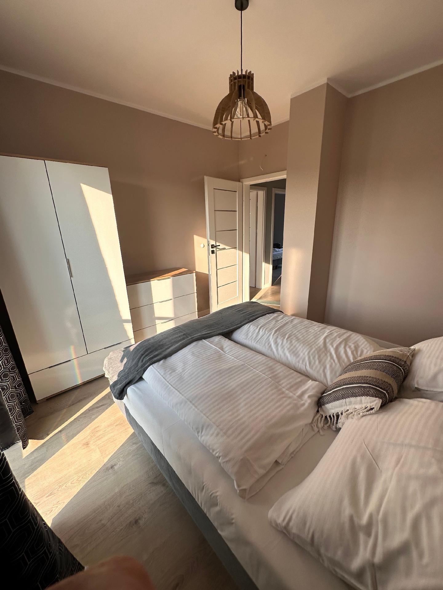 Die Zimmer haben große, bequeme 2-Personen-Betten, Kleiderschrank, Kommode, Nachttische, Lampen. Im Wohnzimmer gibt es ein großes Ecksofa, das ausgeklappt werden kann.