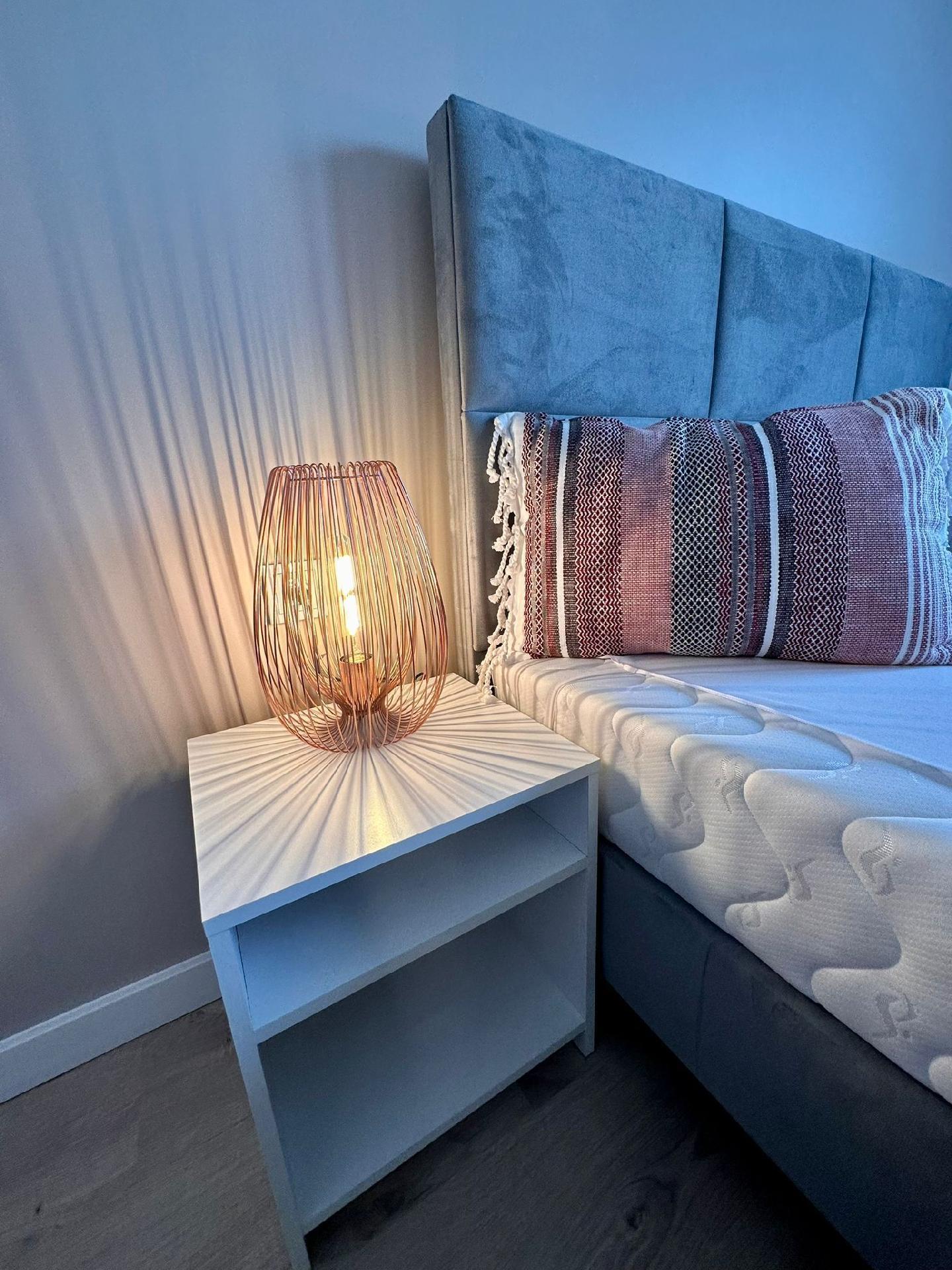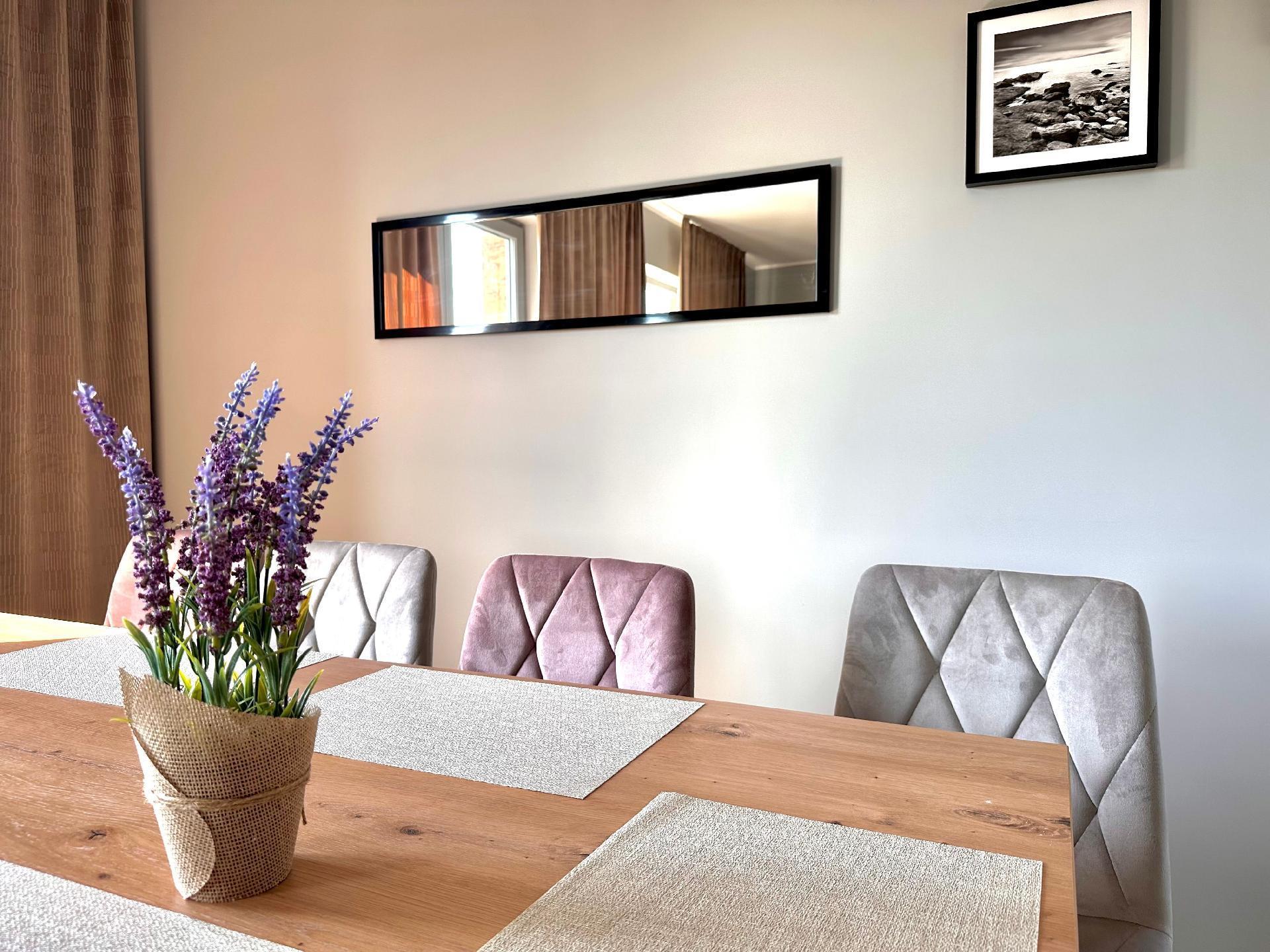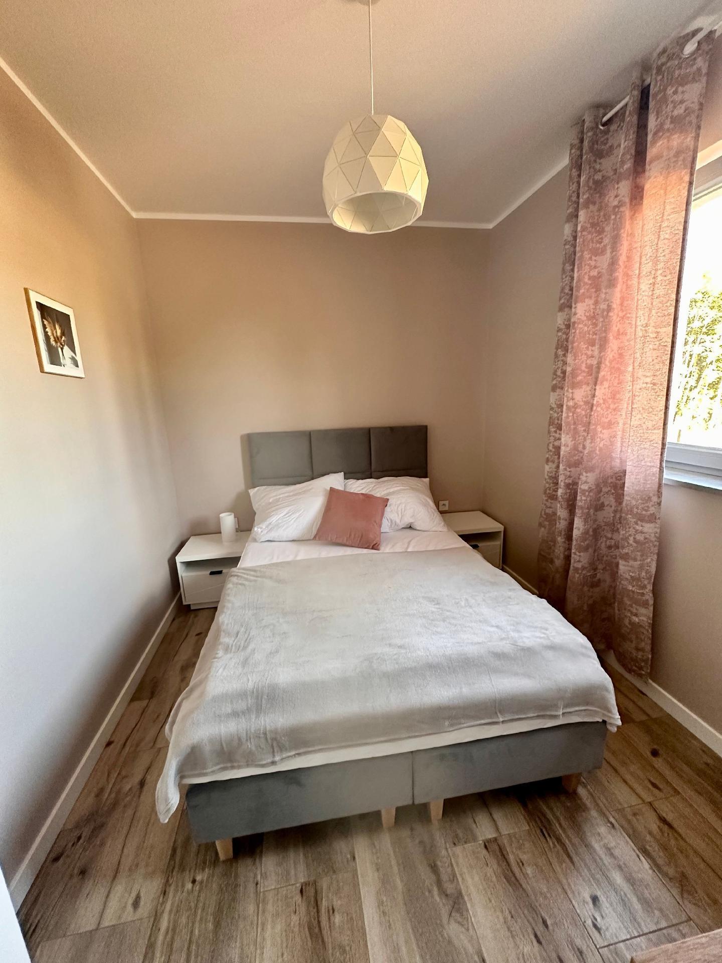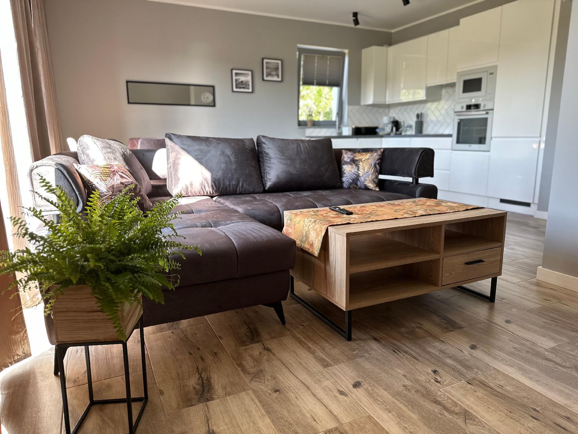 Die Zimmer haben große, bequeme 2-Personen-Betten, Kleiderschrank, Kommode, Nachttische, Lampen. Im Wohnzimmer gibt es ein großes Ecksofa, das ausgeklappt werden kann.