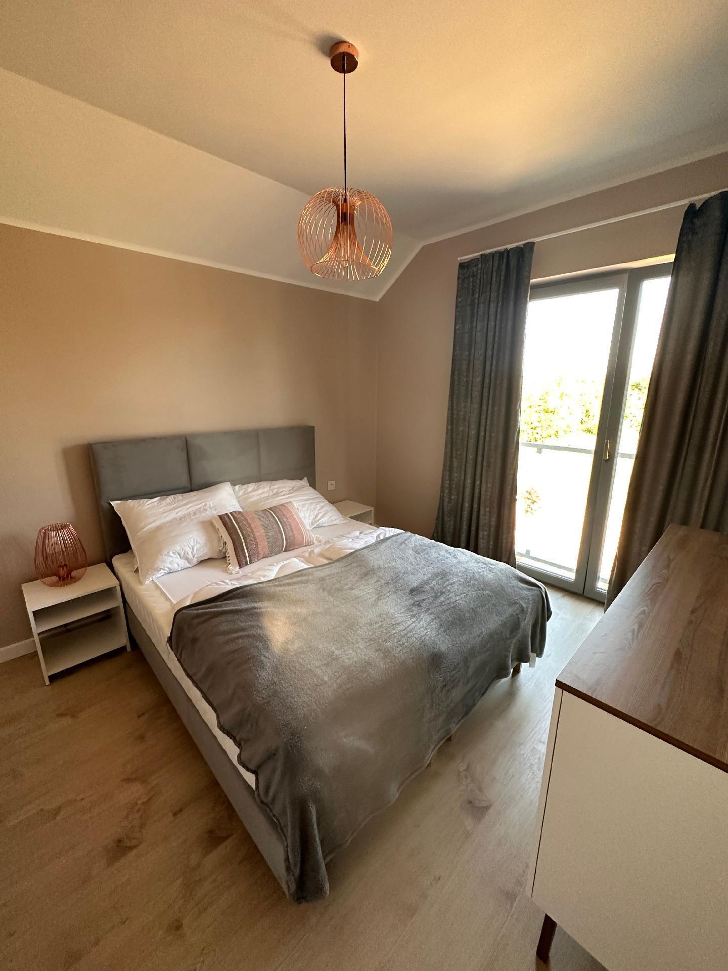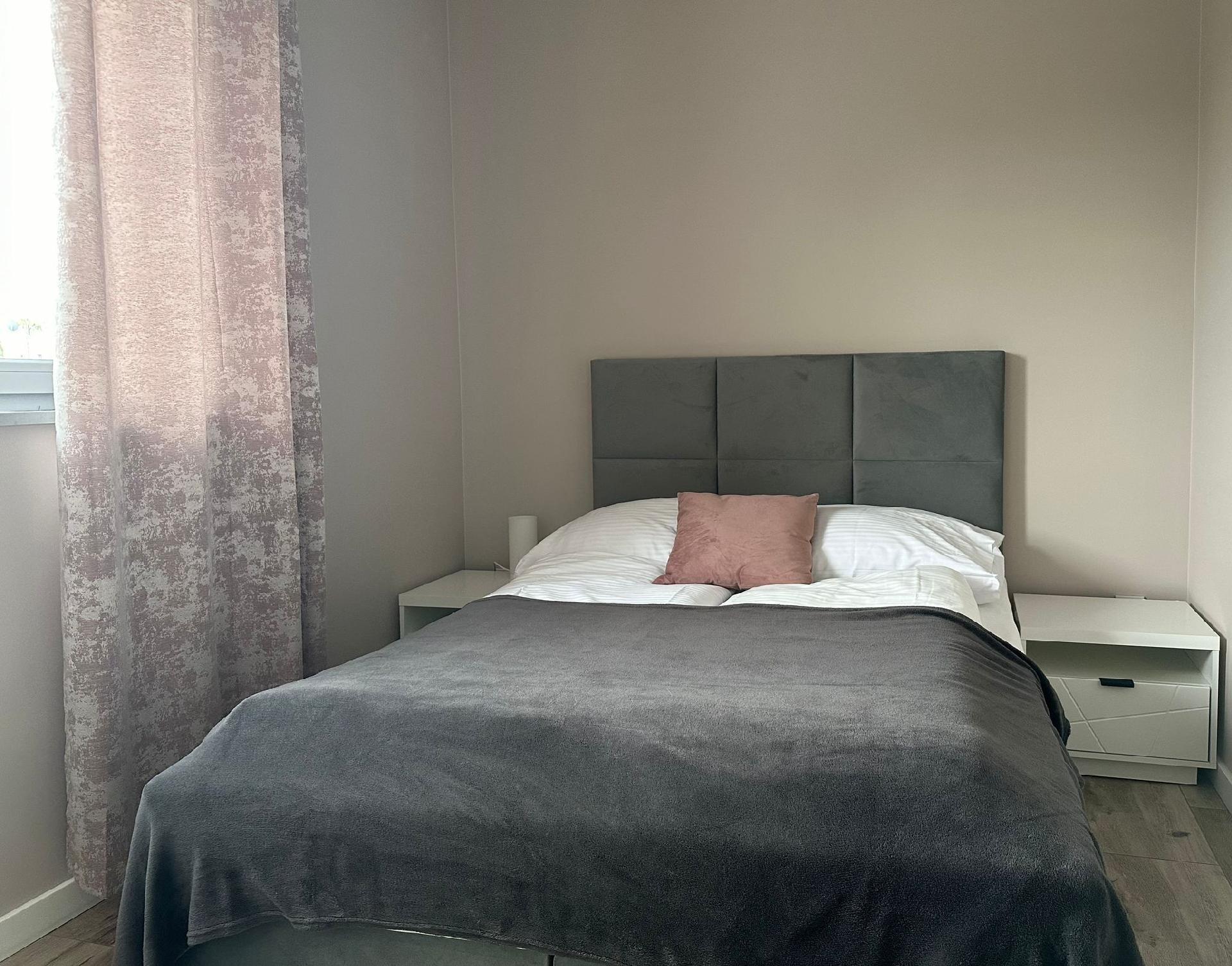 Die Zimmer haben große, bequeme 2-Personen-Betten, Kleiderschrank, Kommode, Nachttische, Lampen. Im Wohnzimmer gibt es ein großes Ecksofa, das ausgeklappt werden kann.