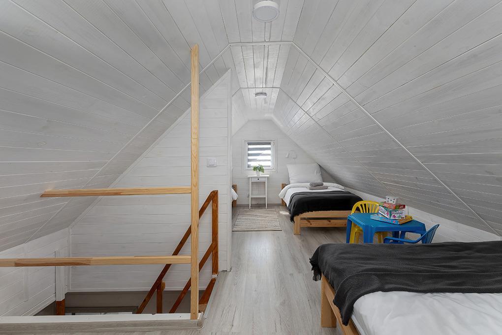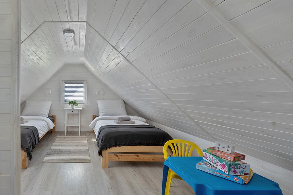 PL 12.60 Ferienhaus 2-6 Pers.: Niveauvolles 3-Zimmerhaus mit 65 qm Wohnfläche über 2 Etagen. Parterre: Schöner Wohn-/Essraum mit Sofa (Klappcouch 2 Pers.), Flachbild Sat-TV (deutsche Programme), Esstisch, Küchenzeile (2 Platten-Induktionsherd, Mikrowelle, Tiefkühlfach 15 l). Doppelzimmer. Bad: Du, Wb, WC. Steile Holztreppe ins Dachgeschoss mit Schrägen: offenes Vierbettzimmer mit Doppelbett und Einzelbetten, Blick auf den wunderschön angelegten Garten und Pool.