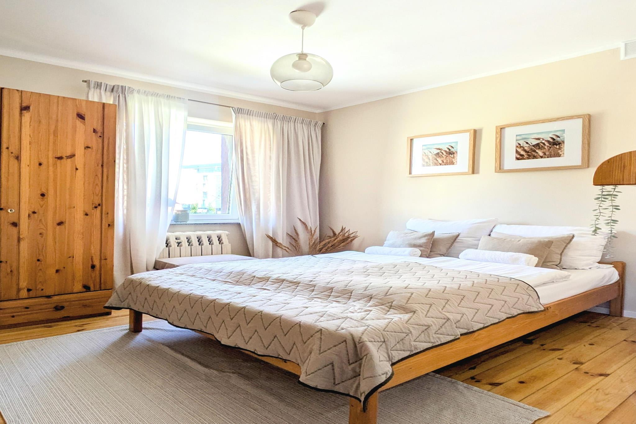 Ein gemütliches Feriendomizil direkt am Fluss Parseta. Die Gegend ist ruhig und nur wenige Schritte vom Ortszentrum entfernt. Der Strand ist 650 Meter entfernt. In der Nähe befindet sich der Fischmarkt, wo Sie fangfrischen Fisch direkt vom Boot kaufen können. Dieses komfortable und sehr geräumige Apartment (1. Stock) bietet Platz für bis zu 8 Personen. Es besteht aus einem Wohnzimmer (TV, Doppelschlafsofa, Tisch und Stühle), 2 separaten Schlafzimmern, einer voll ausgestatteten Küche und 2 Badezimmern mit Dusche. Zentralheizung und WLAN sind vorhanden. Auf dem umzäunten Grundstück befinden sich ein Holzhäuschen mit Sauna (im Preis inbegriffen), Whirlpool und Dusche. Sichere Parkplätze stehen ebenso zur Verfügung wie eine Sommerküche mit Grill und ein großer Gartenpavillon. Für Kinder gibt es einen attraktiven Spielplatz mit Trampolin. Eine Terrasse mit Gartenmöbeln steht allen Gästen zur Verfügung. Vom Apartment aus haben Sie direkten Zugang zum Flussufer, wo Sie auf Liegestühlen entspannen oder angeln können. Ein Ruderboot steht allen Gästen kostenlos zur gemeinsamen Nutzung zur Verfügung. Frühstück kann vor Ort erworben werden. Im Preis inbegriffen sind: Bettwäsche, Handtücher, Strom- und Wasserverbrauch, Sauna, Heizung, Endreinigung, Internet, Parkplatz, ein Kinderbett und ein Hochstuhl (Reservierung erforderlich) sowie ein Ruderboot. Die größte Attraktion von Kolobrzeg ist der breite Sandstrand. Zahlreiche Spazierwege laden im Küstenpark, entlang der Strandpromenade, am historischen Pier und in der Altstadt zum Verweilen ein. Der Leuchtturm, das Ozeanarium, der Hafen und die Kathedrale sind ebenfalls einen Besuch wert. Familien mit Kindern empfehlen wir den Pommerschen Vergnügungspark. Dieser ganzjährig geöffnete Park befindet sich im Dorf Dygowo (ca. 15 km von Kolobrzeg entfernt).