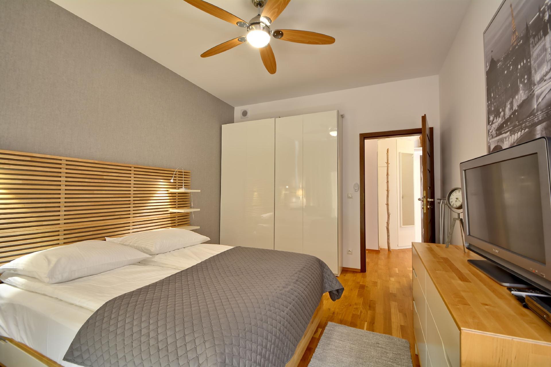 - ein Schlafzimmer mit einem großen Doppelbett (160cmx200cm) mit professioneller Hotel-Damast-Bettwäsche, einer Kommode, einem Kleiderschrank, einem Schreibtisch, einem LCD-Fernseher; im Schlafzimmer befindet sich ein ferngesteuerter Deckenventilator;