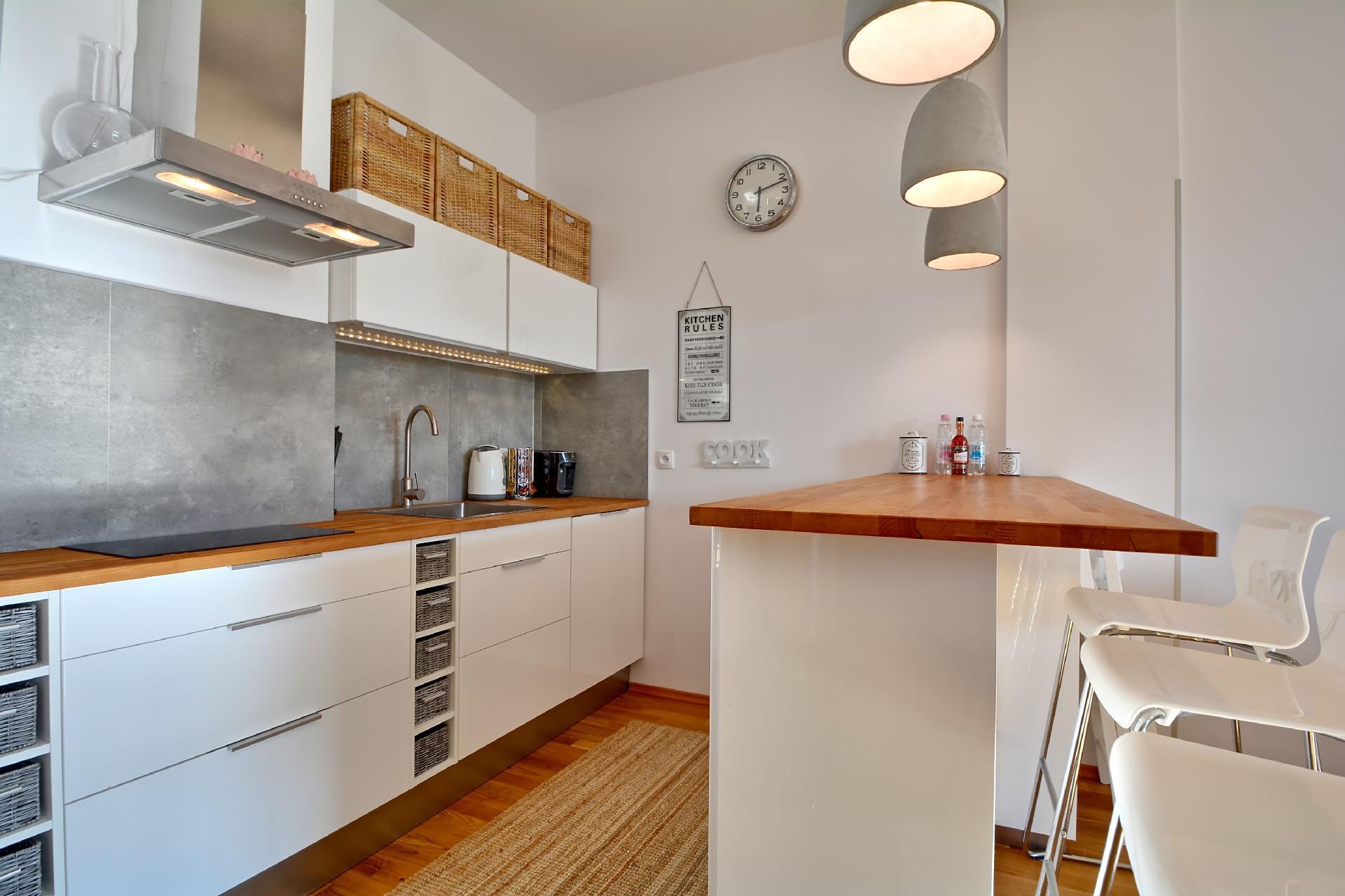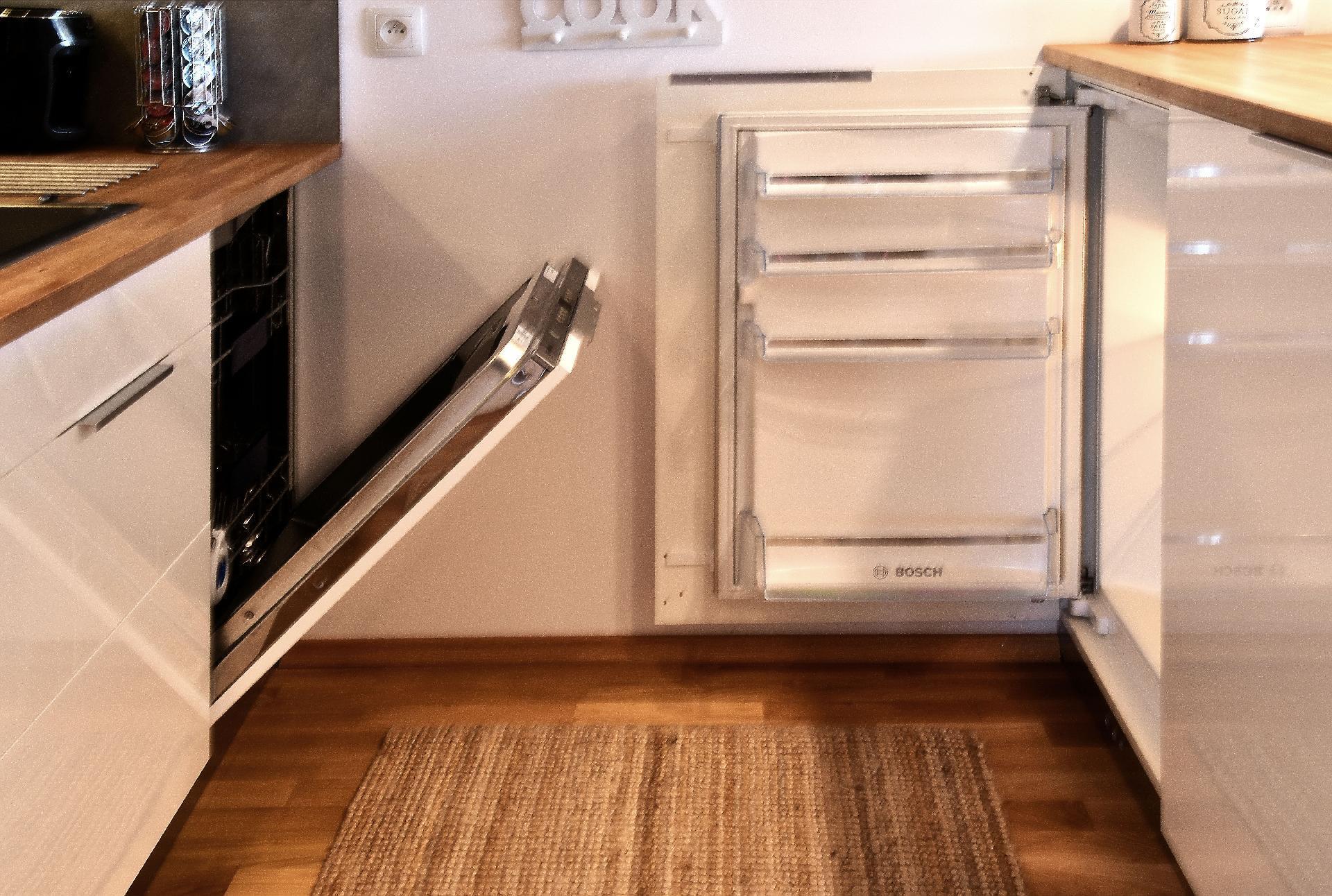 - eine Küchenzeile mit Ceran-Kochfeld, Kühlschrank, Geschirrspüler, Toaster, Tchibo-Kaffeemaschine (15 bar), Geschirr, Töpfe, Besteck, etc. Zwischen dem Wohnzimmer und der Küchenzeile befindet sich eine Bar mit 3 Barstühlen;