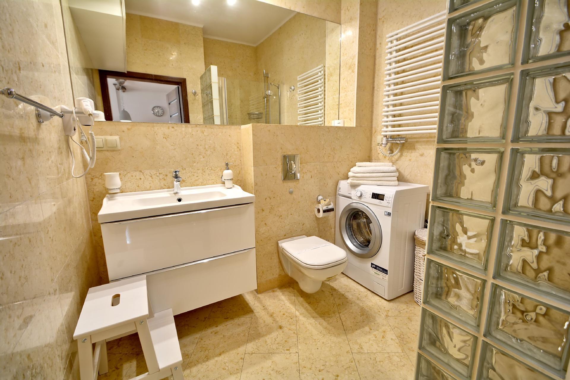- das Badezimmer mit Duschkabine, Waschbecken, Toilette, Haartrockner, Baumwollhandtüchern und Waschmaschine;
