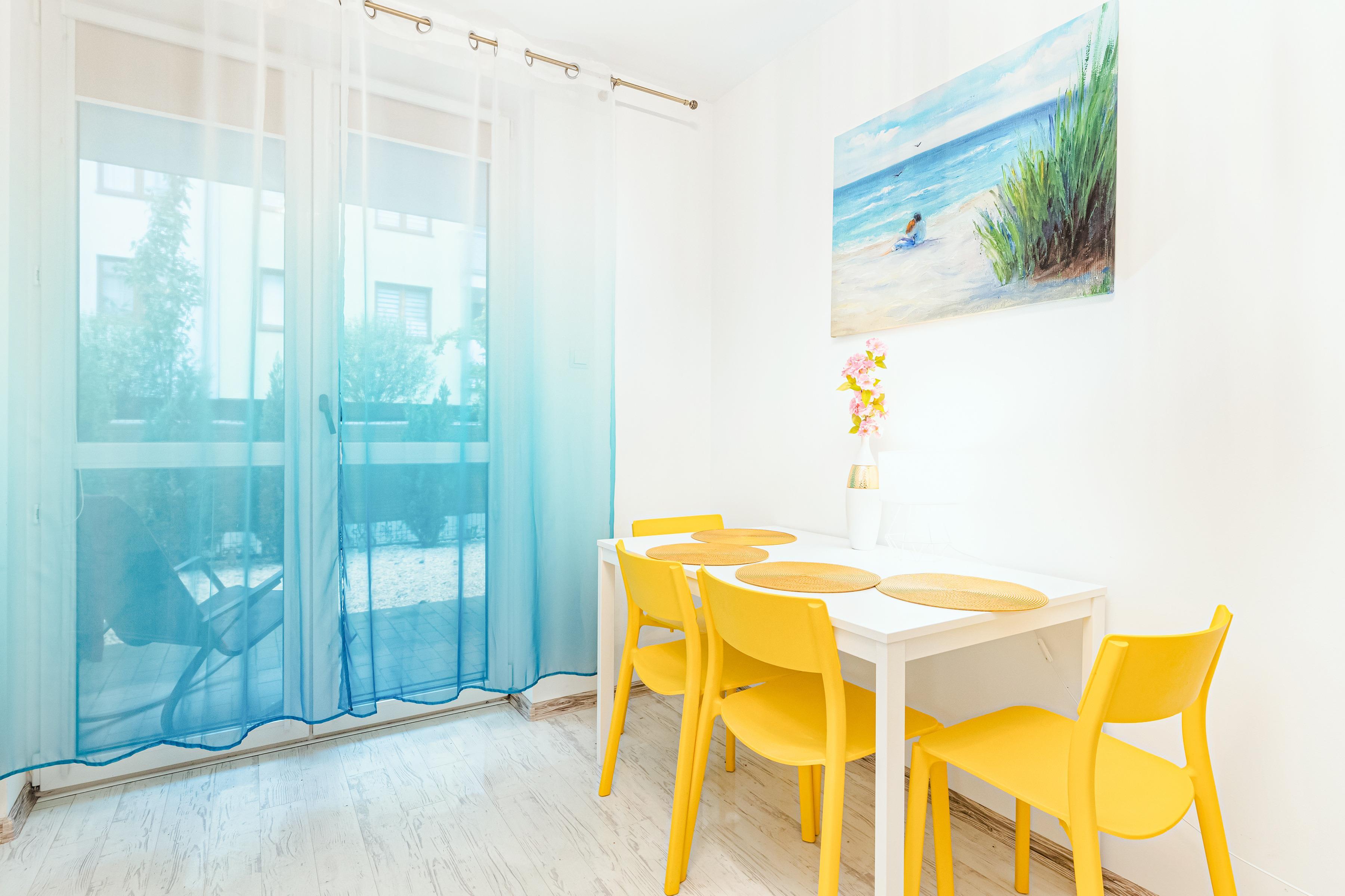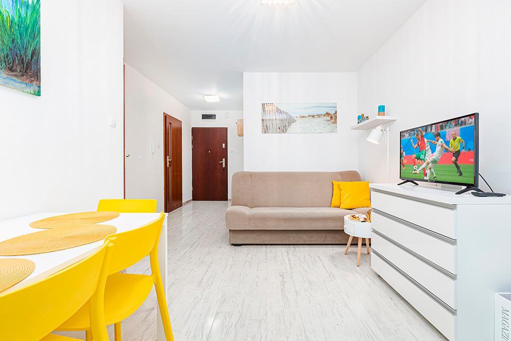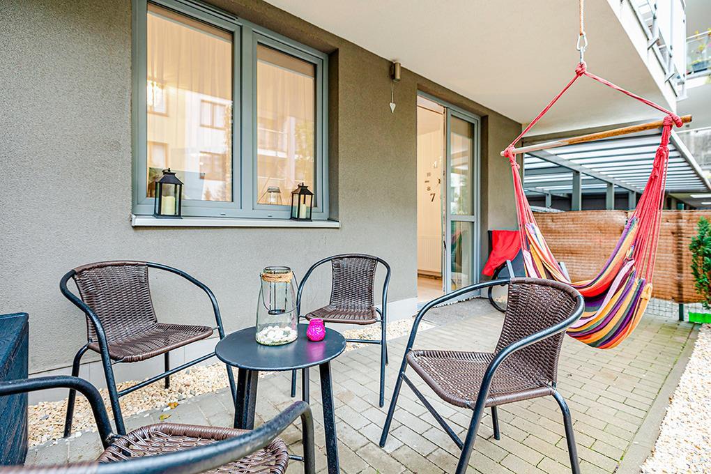 PL 40.31 Wohnung 2-4 Pers.: Geschmackvoll eingerichtete 2-Zimmerwohnung mit 35 qm Wohnfläche, Parterre. Wohn-/Essraum mit bodentiefen Fenstern, Couchgarnitur (Klappcouch 2 Pers.), SMART-TV, Internet (WLAN), Esstisch. Offener Zugang zur gut ausgestatteten Küche mit moderner Küchenzeile (4 E-Platten Ceranfeld, Backofen, Mikrowelle). Doppelzimmer. Bad: Du, Wb, WC, Waschmaschine. Teilüberdachte Terrasse mit Sitzmöbeln.