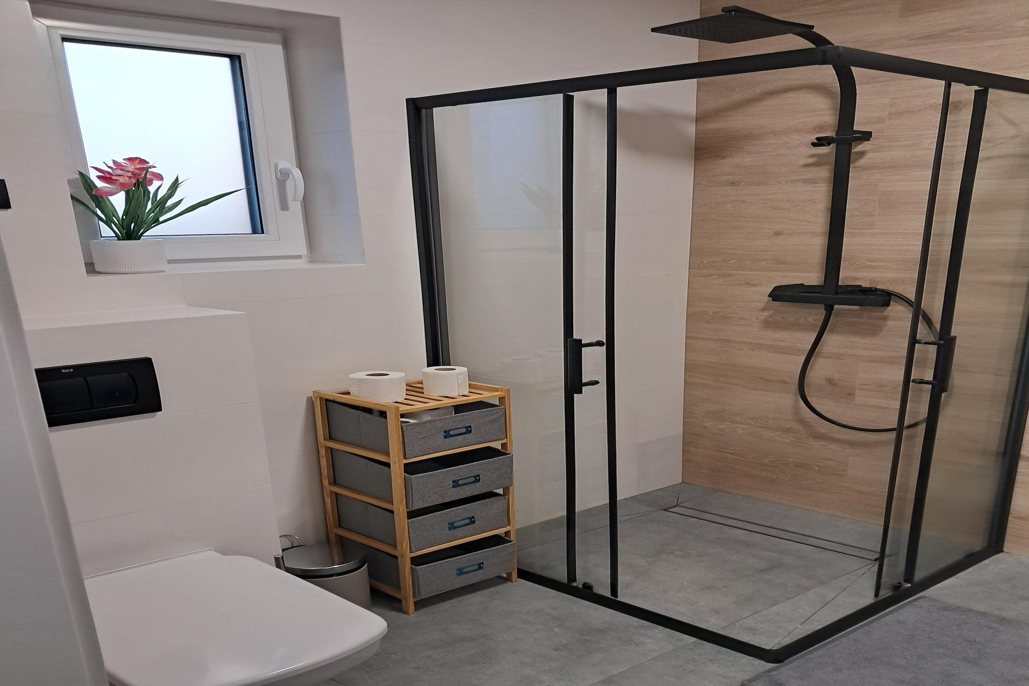 Parterre: (Wohnküche(Esstisch, Kaffeemaschine, Backofen, Mikrowelle, Spülmaschine, Kühl-/Gefrierkombination, elektrische Kochplatten), Wohn-/Schlafzimmer(Doppelschlafcouch, TV, Kaminofen), Badezimmer(Dusche, Waschbecken, Toilette, Waschmaschine)) In der 1. Etage: (Schlafzimmer(Doppelbett, Babybett), Schlafzimmer(Einzelbett, Einzelbett)) Terrasse, Garten, Gartenmöbel, Grill, Parkplatz, Trampolin, Teich, Rutsche, Hochstuhl, Spielzeug, Schaukel