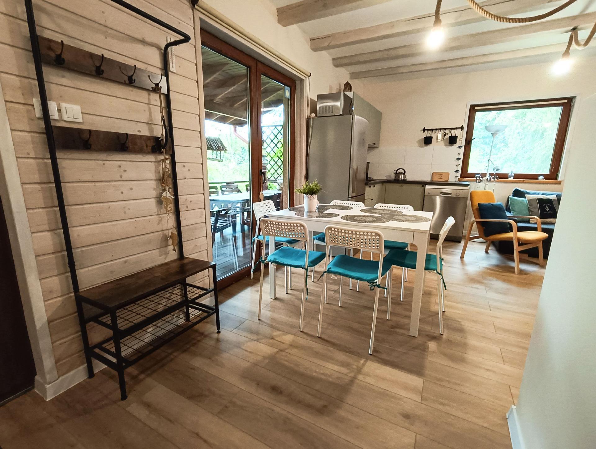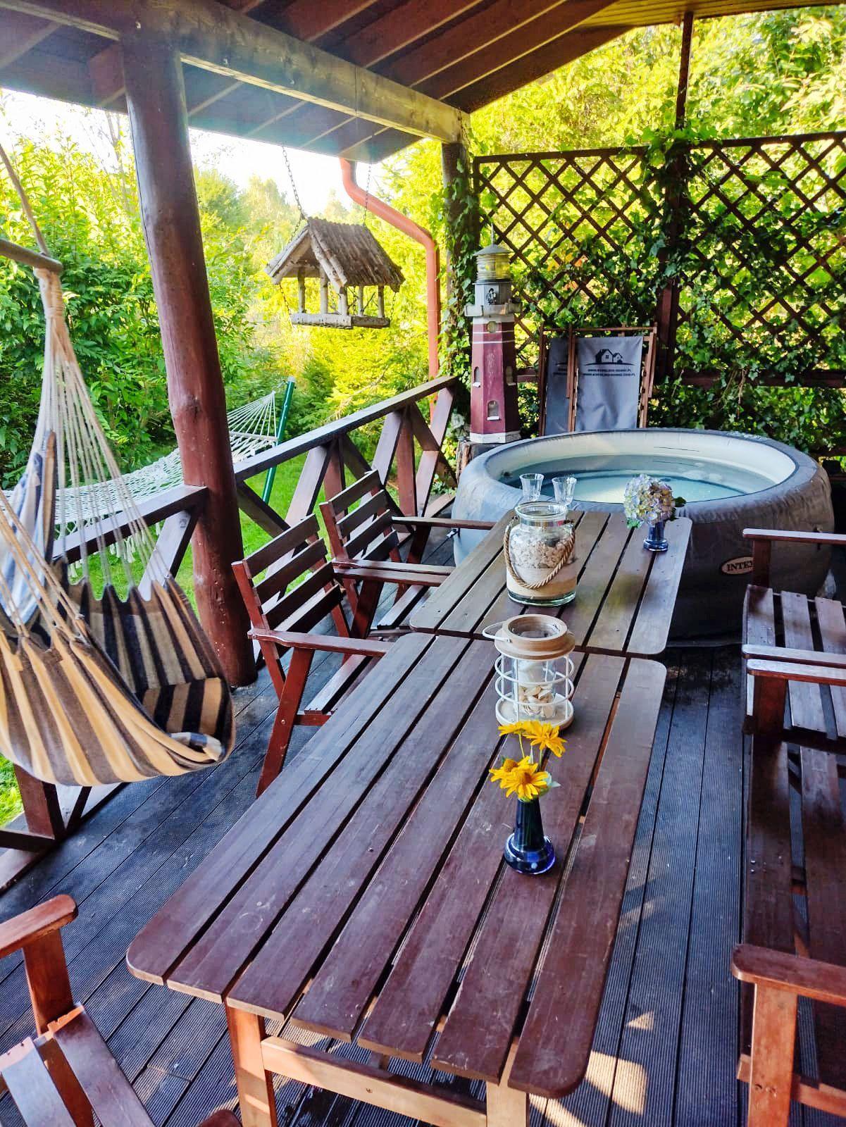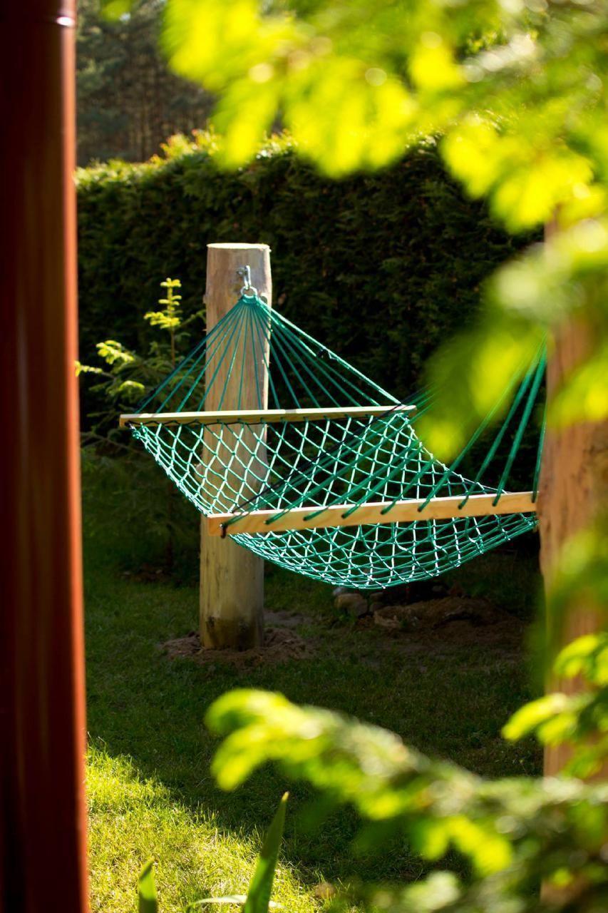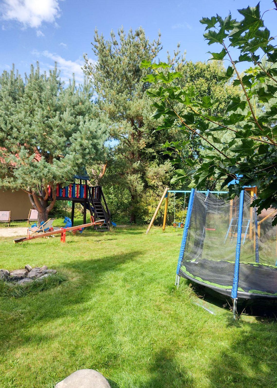 Es gibt viel Grün, vor der Terrasse gibt es einen Betongrill und eine Hängematte, und hinter dem Haus gibt es einen Spielplatz für die Kleinen - ein Trampolin, Schaukeln, einen Sandkasten und ein Baumhaus und einen Platz für ein Lagerfeuer.