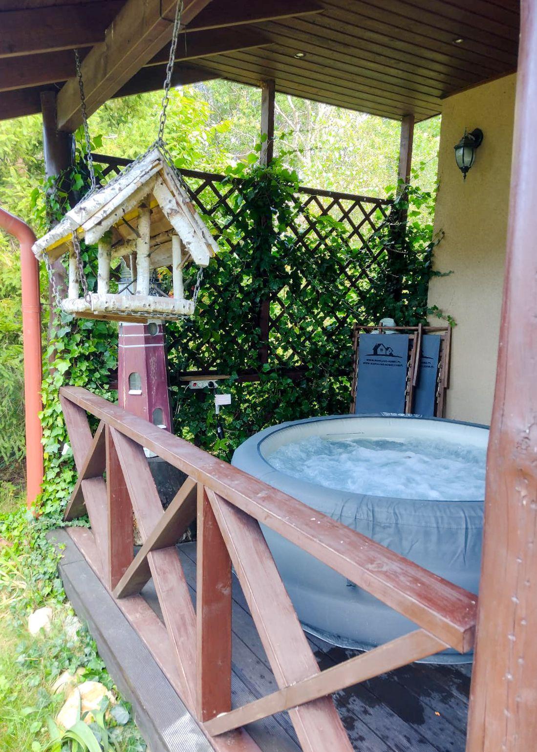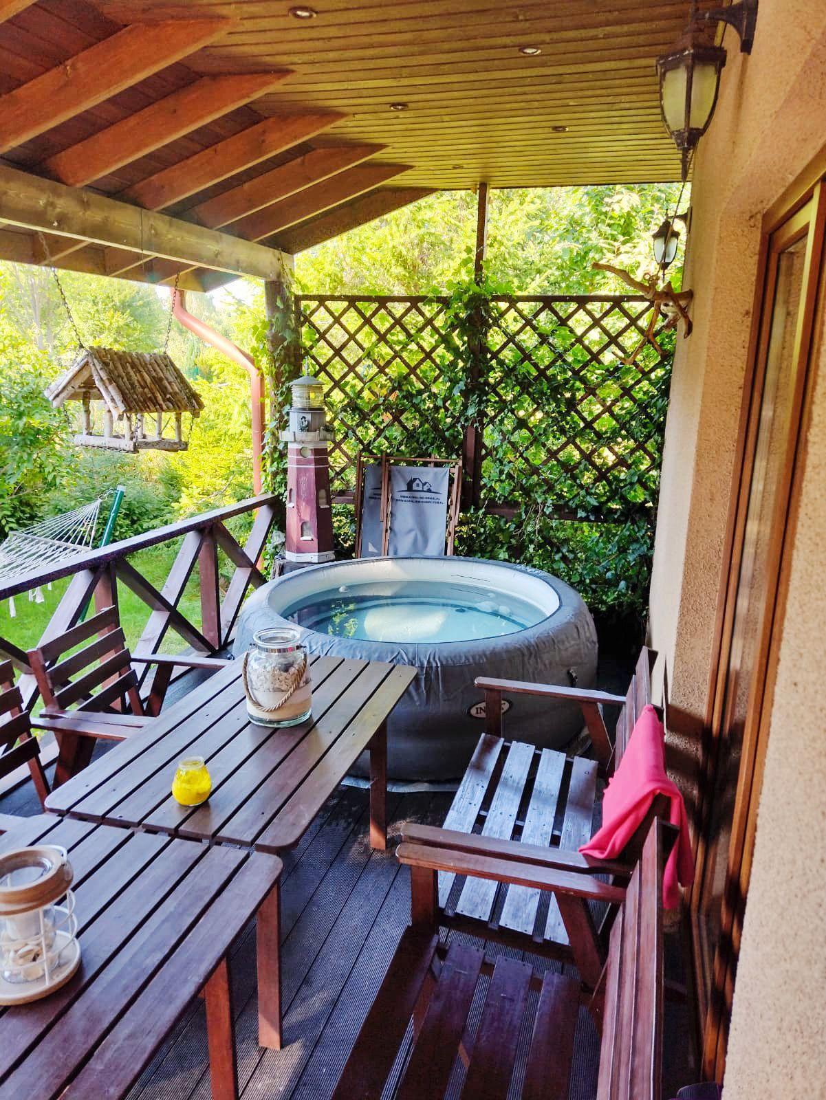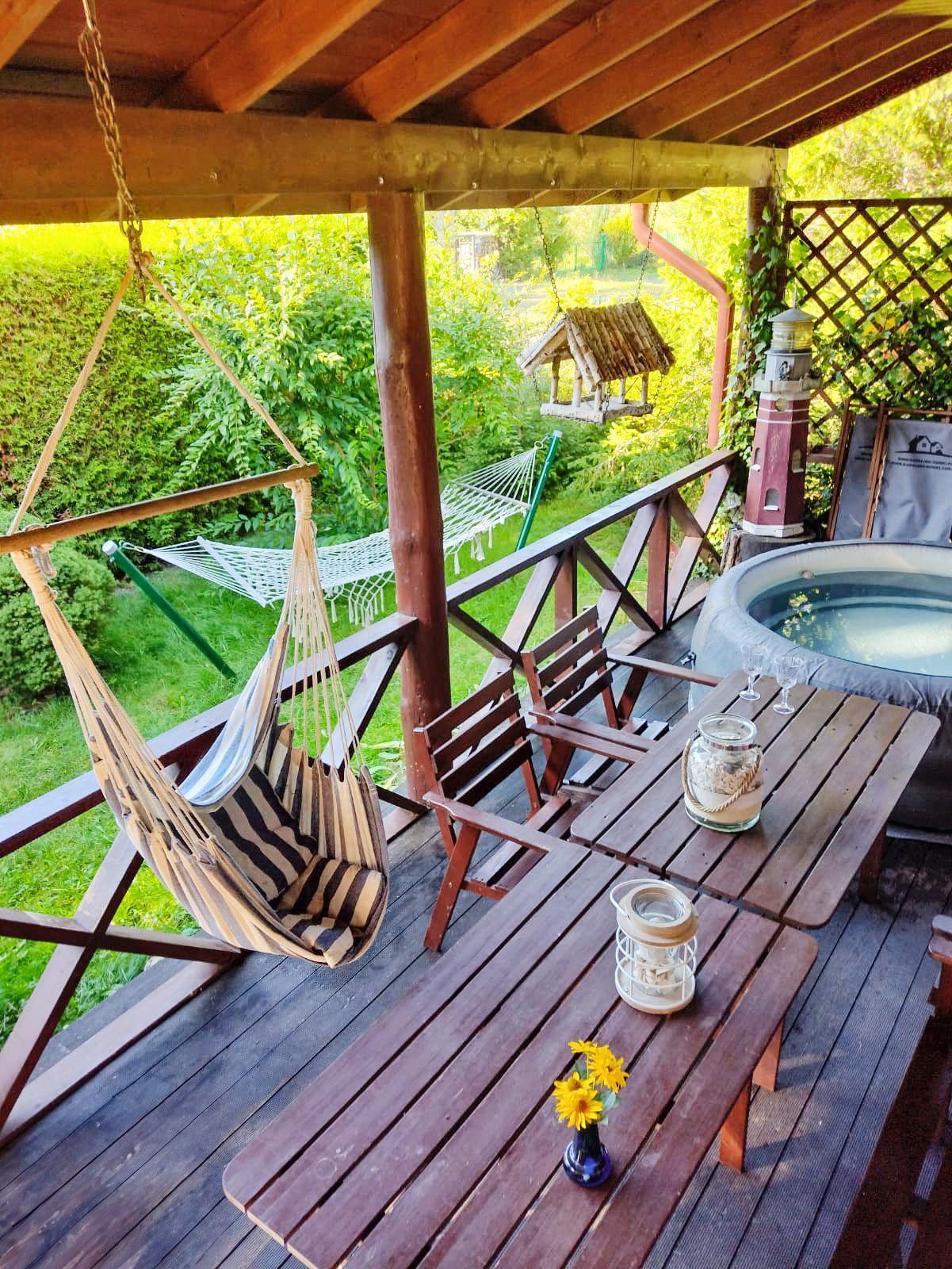 Es gibt viel Grün, vor der Terrasse gibt es einen Betongrill und eine Hängematte, und hinter dem Haus gibt es einen Spielplatz für die Kleinen - ein Trampolin, Schaukeln, einen Sandkasten und ein Baumhaus und einen Platz für ein Lagerfeuer.