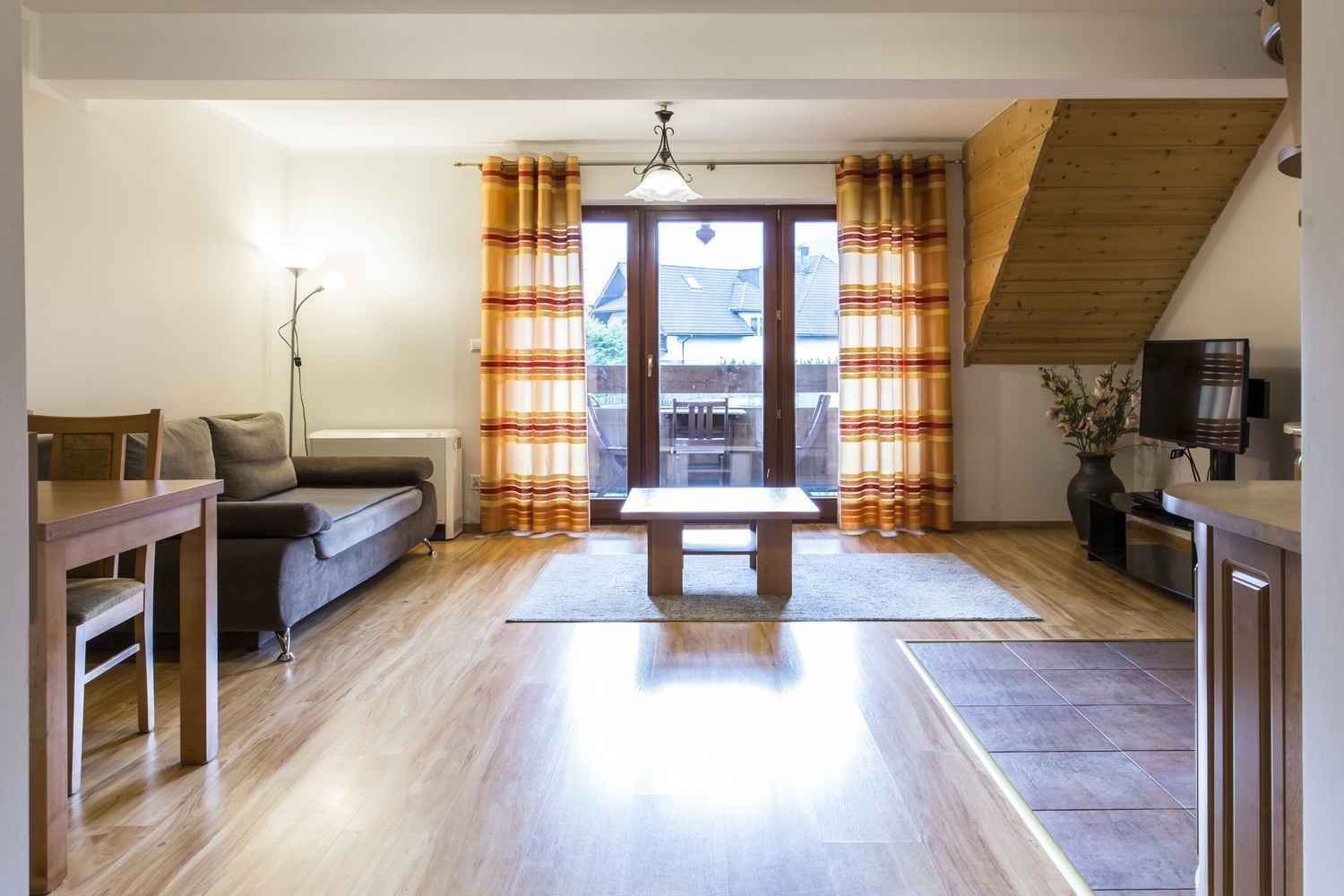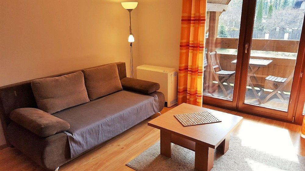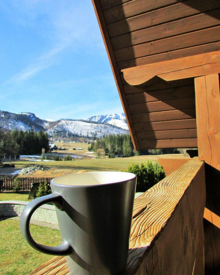 - ein privater, überdachter Balkon, der vom Wohnzimmer aus zugänglich ist, mit einem Couchtisch und einem Blick auf die Tatra,