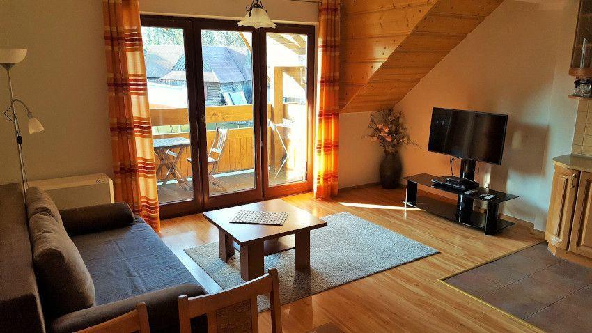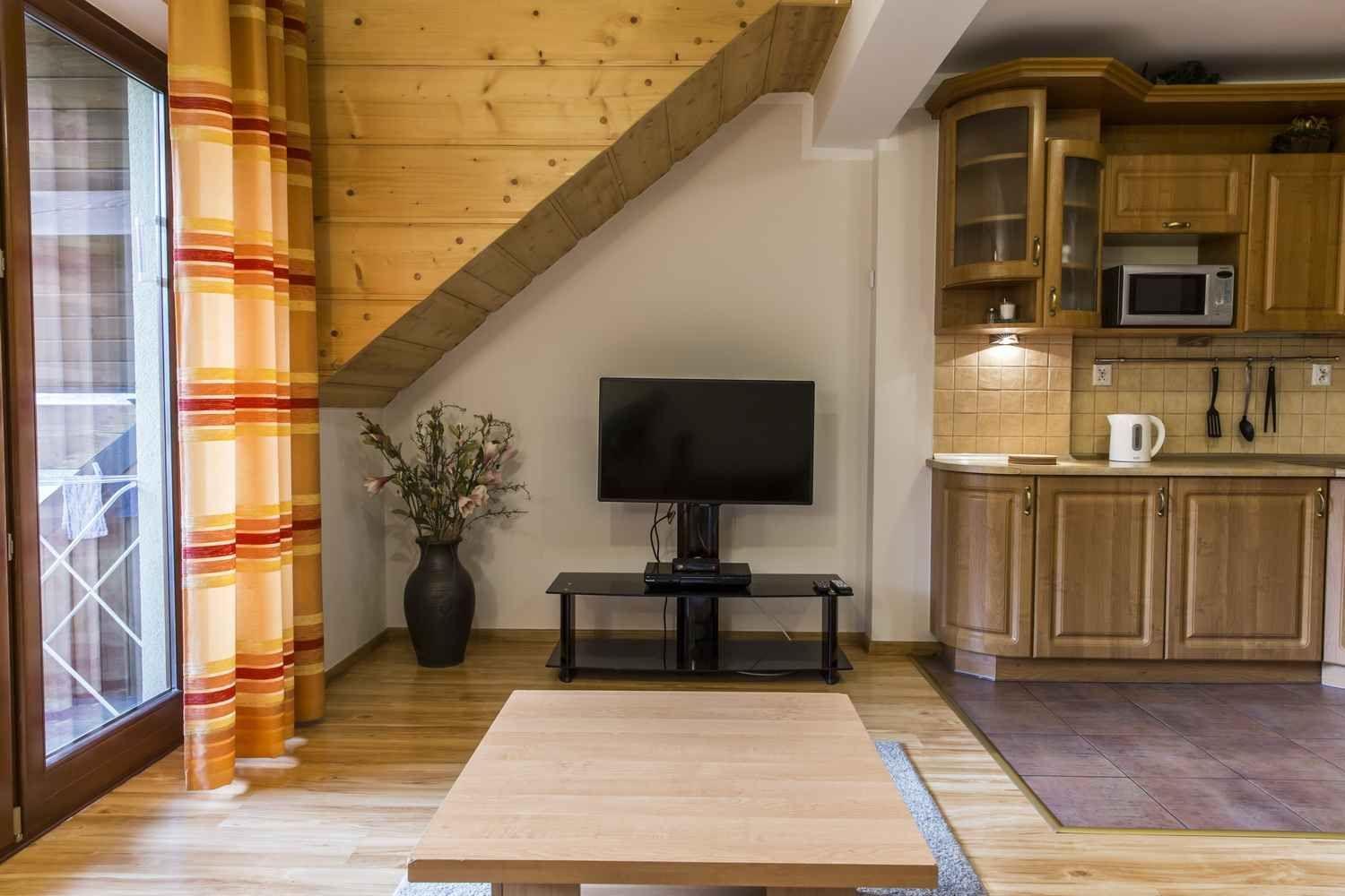 - Wohnzimmer mit 2-sitziger Schlafcouch, Kochnische, TV, mit Blick auf die Tatra,