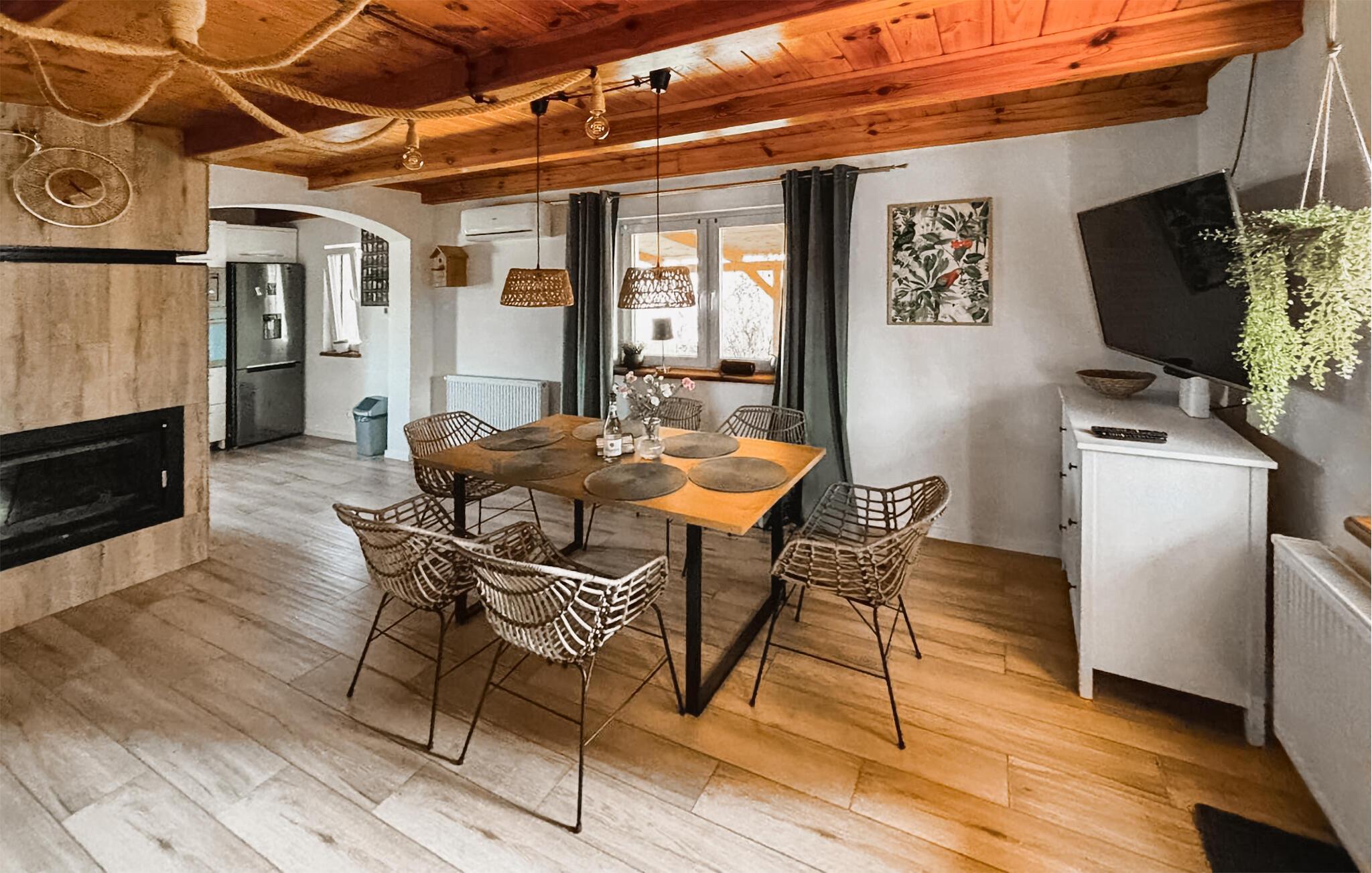 Herzlich willkommen am See Jezioro Kucki, auf Deutsch bekannt als Kauziger See, zu einem traumhaften Urlaub mit der ganzen Familie. In diesem komfortablen Ferienhaus können Sie sich erholen und zahlreiche Naturerlebnisse genießen. Machen Sie es sich morgens beim Frühstück am Esstisch bequem und genießen Sie die behagliche Atmosphäre des Holzambientes und der liebevollen Deko-Details. Auch die Sofaecke strahlt Gemütlichkeit aus und lädt zum Kartenspielen oder Bücherlesen ein. Nutzen Sie die Möglichkeit, den Tag entspannt zu starten und sich auf die bevorstehenden Urlaubsaktivitäten vorzubereiten.