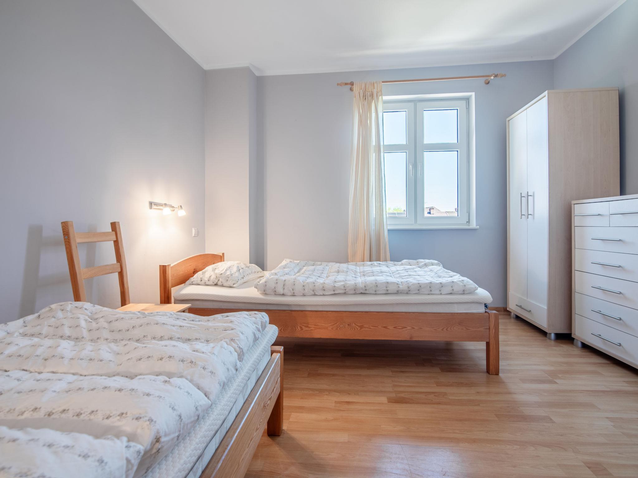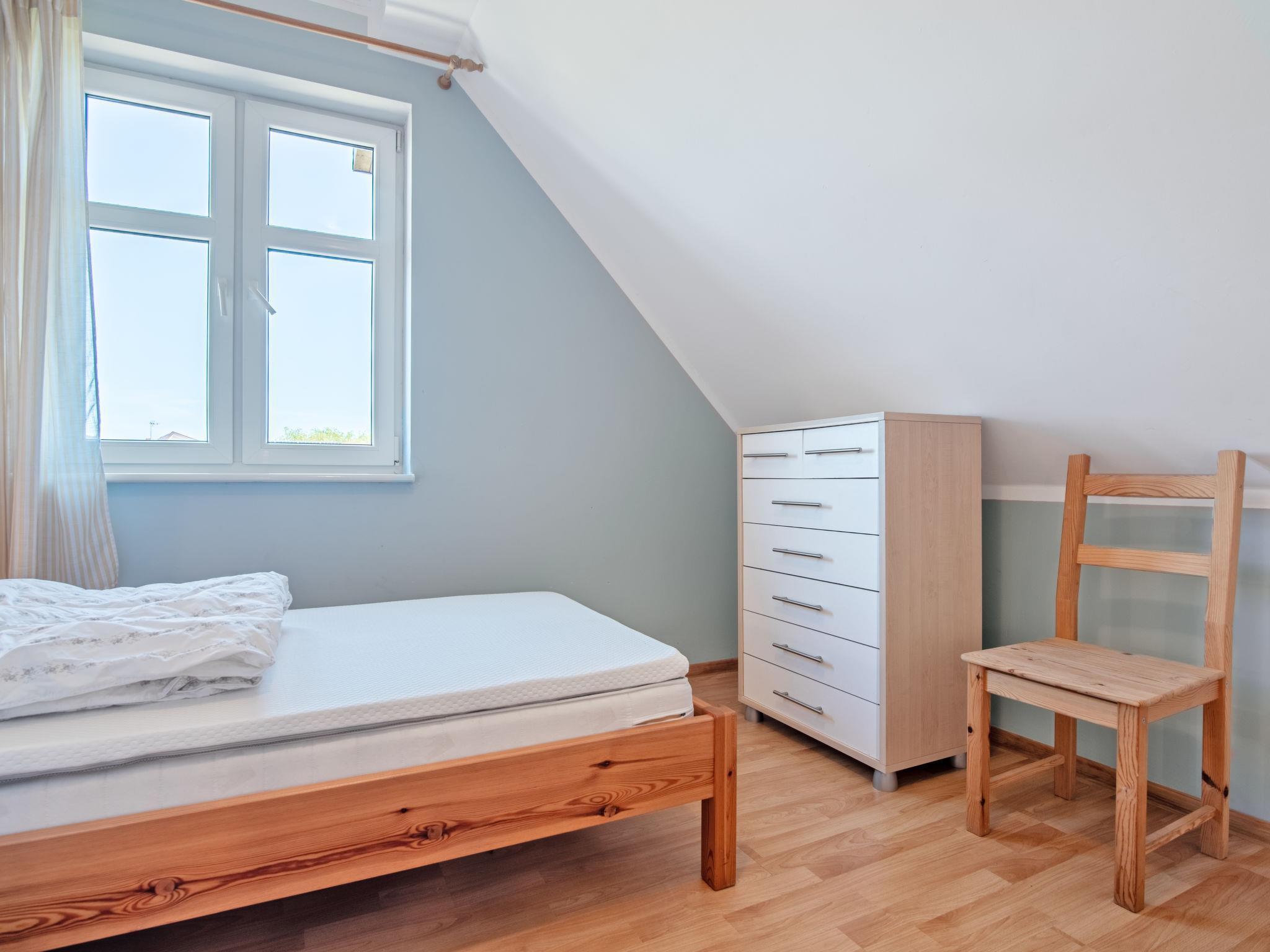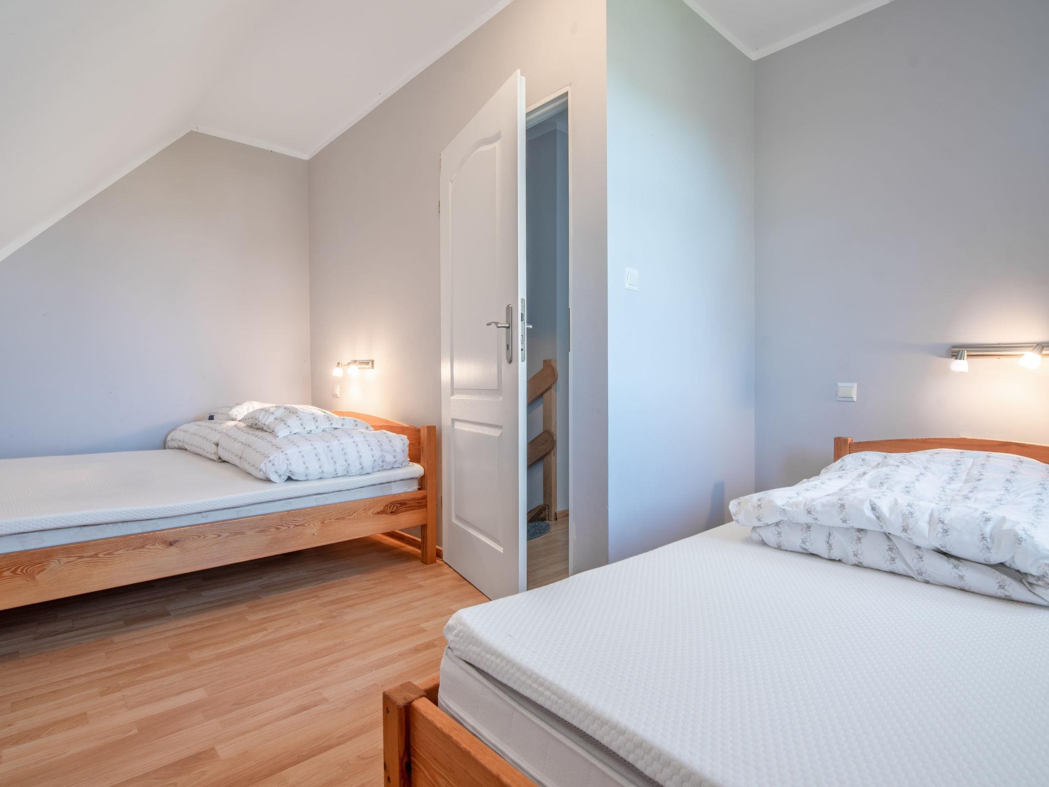 3-Zimmer-Reihenhaus 50 m2. Offenes Wohn-/Esszimmer 18 m2 mit 1 Diwanbett (50 cm, Länge 200 cm), Flachbildschirm. Ausgang zum Garten. Offene Küche (2 Kochplatten). Dusche/WC. Boiler (60 Liter). Keine Heizmöglichkeit. Dachgeschoss: 1 abgeschrägtes Zimmer 12 m2 mit 2 Betten (90 cm, Länge 200 cm). 1 Zimmer 12 m2 mit 1 Bett (90 cm, Länge 200 cm), 1 franz. Bett (180 cm, Länge 200 cm). Gartensitzplatz 4 m2. Liegestühle (5). Zur Verfügung: Babybett bis 2 Jahre. Parkplatz. Bitte beachten: Maximal 1 Haustier/Hund erlaubt. TV nur PL. Rauchmelder.