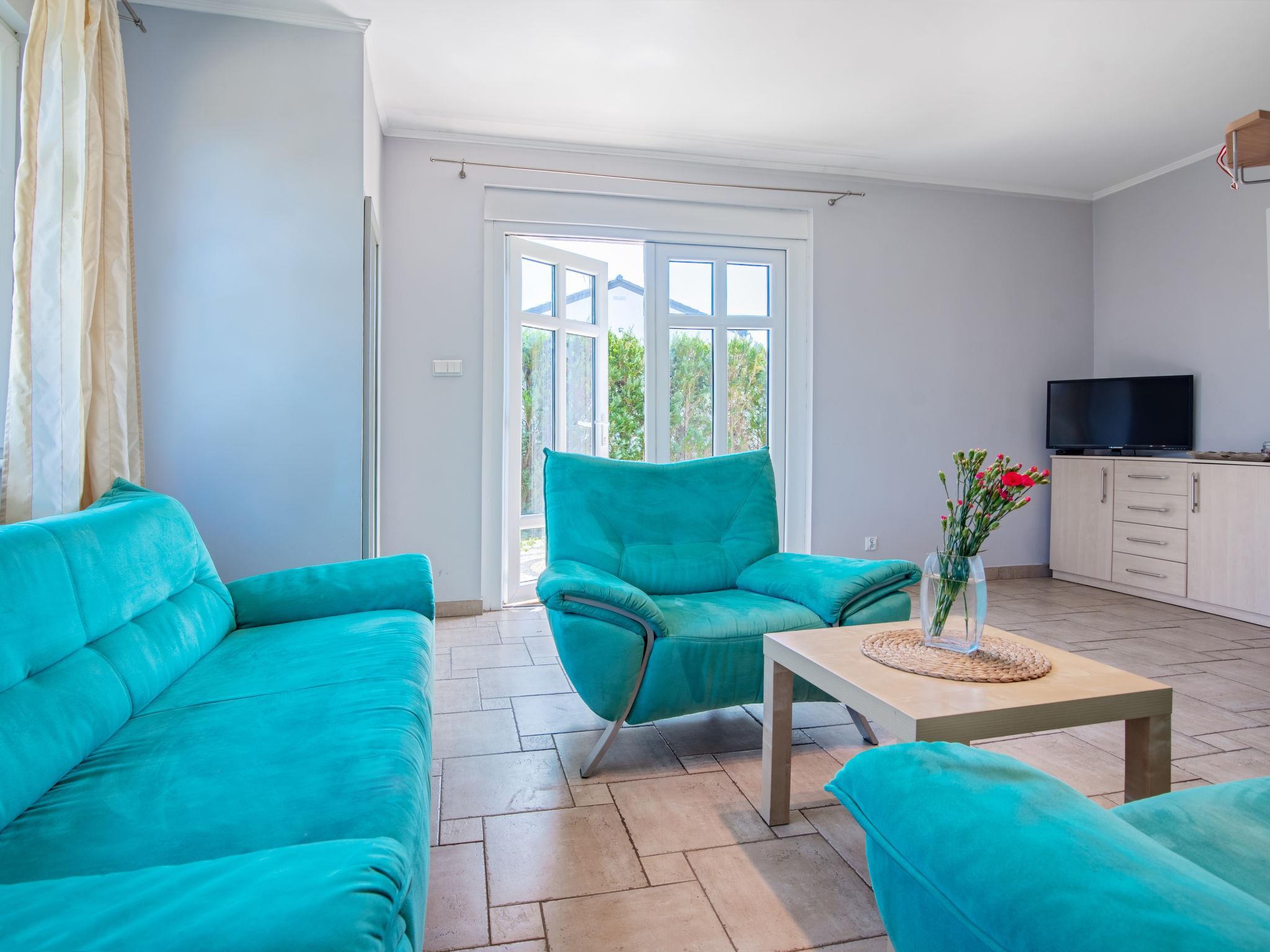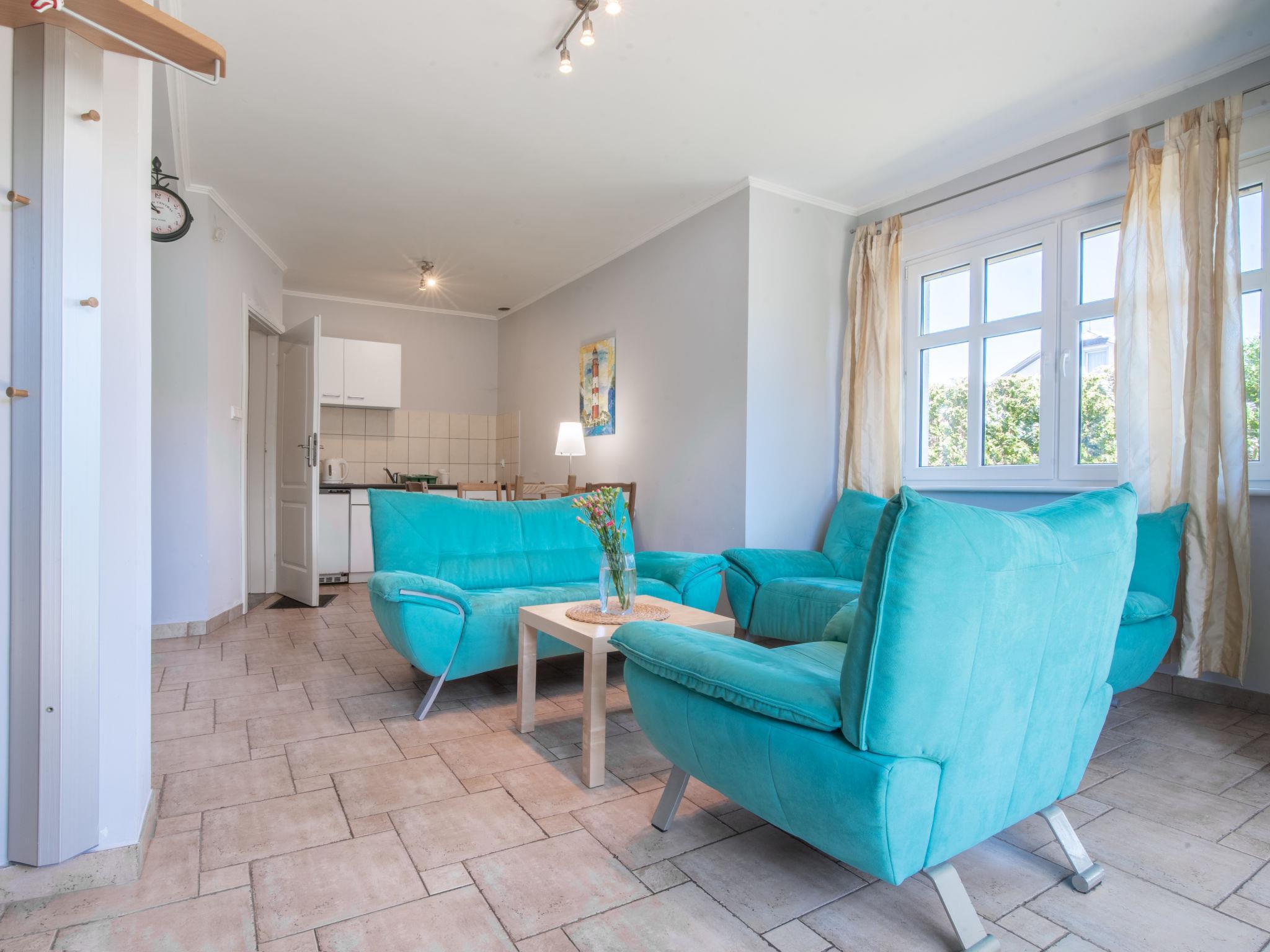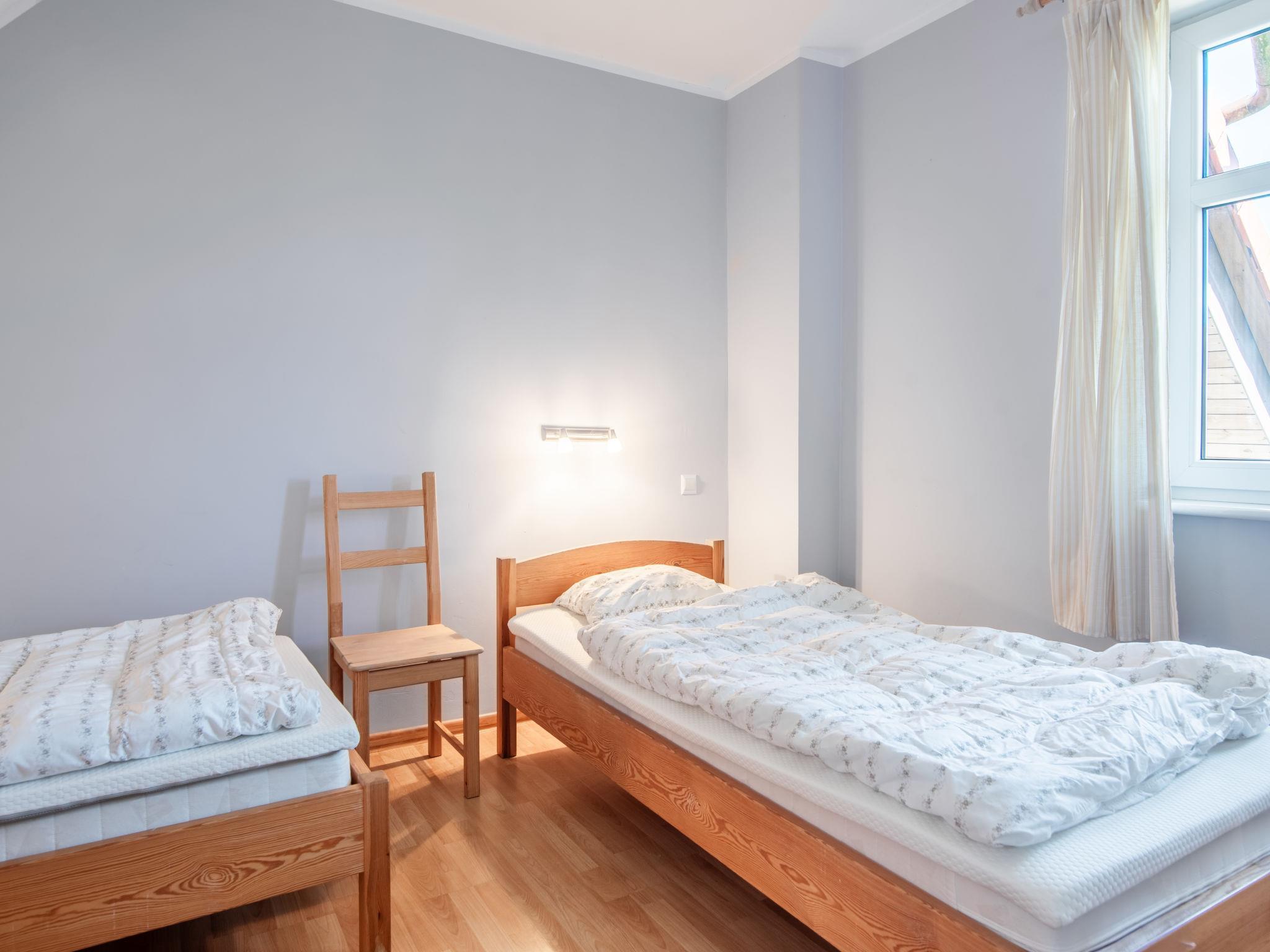 3-Zimmer-Reihenhaus 50 m2. Offenes Wohn-/Esszimmer 18 m2 mit 1 Diwanbett (50 cm, Länge 200 cm), Flachbildschirm. Ausgang zum Garten. Offene Küche (2 Kochplatten). Dusche/WC. Boiler (60 Liter). Keine Heizmöglichkeit. Dachgeschoss: 1 abgeschrägtes Zimmer 12 m2 mit 2 Betten (90 cm, Länge 200 cm). 1 Zimmer 12 m2 mit 1 Bett (90 cm, Länge 200 cm), 1 franz. Bett (180 cm, Länge 200 cm). Gartensitzplatz 4 m2. Liegestühle (5). Zur Verfügung: Babybett bis 2 Jahre. Parkplatz. Bitte beachten: Maximal 1 Haustier/Hund erlaubt. TV nur PL. Rauchmelder.