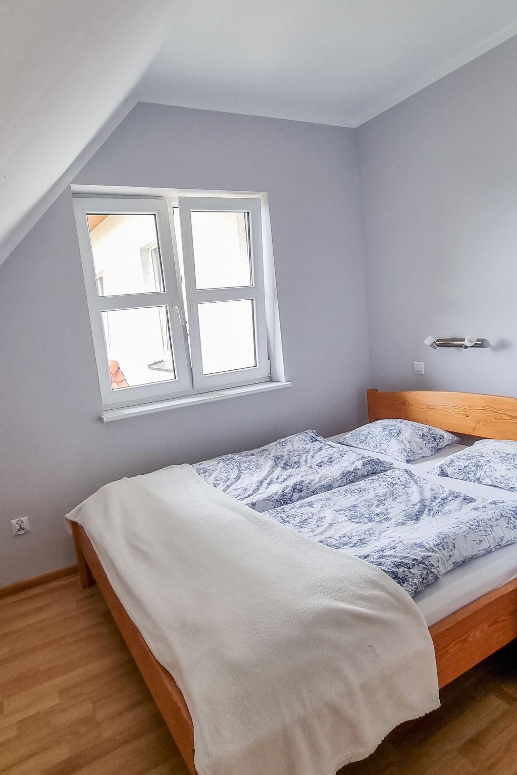 3-Zimmer-Doppelhaushälfte 50 m2. Offenes Wohn-/Esszimmer mit 1 Diwanbett (50 cm, Länge 200 cm), Flachbildschirm. Ausgang zum Garten. Offene Küche (2 Kochplatten). Dusche/WC. Boiler (60 Liter). Keine Heizmöglichkeit. Dachgeschoss: 1 abgeschrägtes Zimmer mit 2 Betten (90 cm, Länge 200 cm). 1 Zimmer mit 1 Bett (90 cm, Länge 200 cm), 1 franz. Bett (180 cm, Länge 200 cm). Gartensitzplatz 4 m2. Liegestühle (5). Zur Verfügung: Babybett bis 2 Jahre. Parkplatz. Bitte beachten: Maximal 1 Haustier/Hund erlaubt. TV nur PL. Rauchmelder.