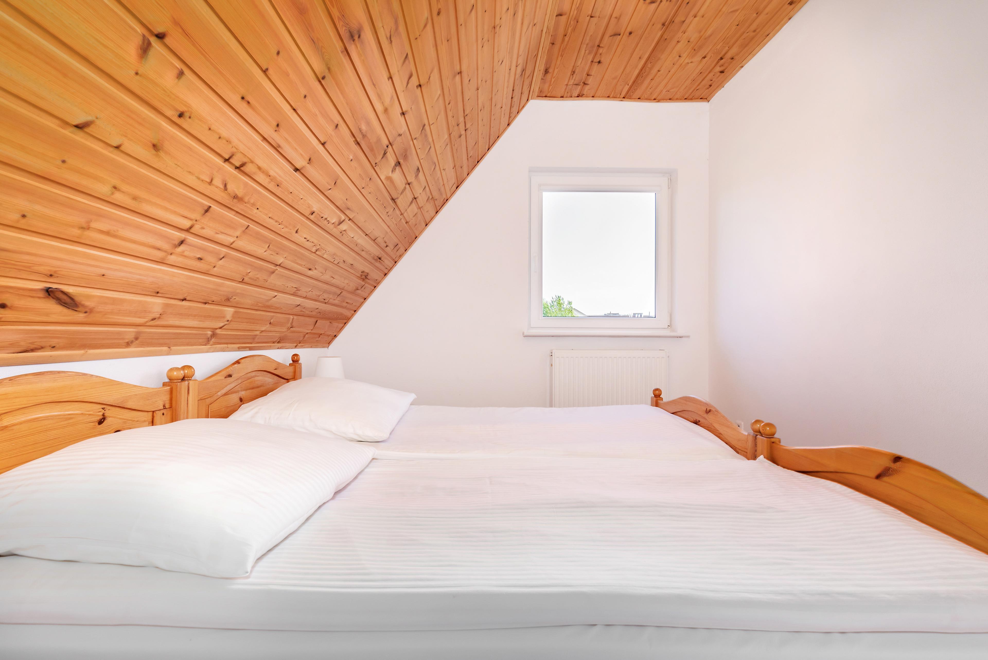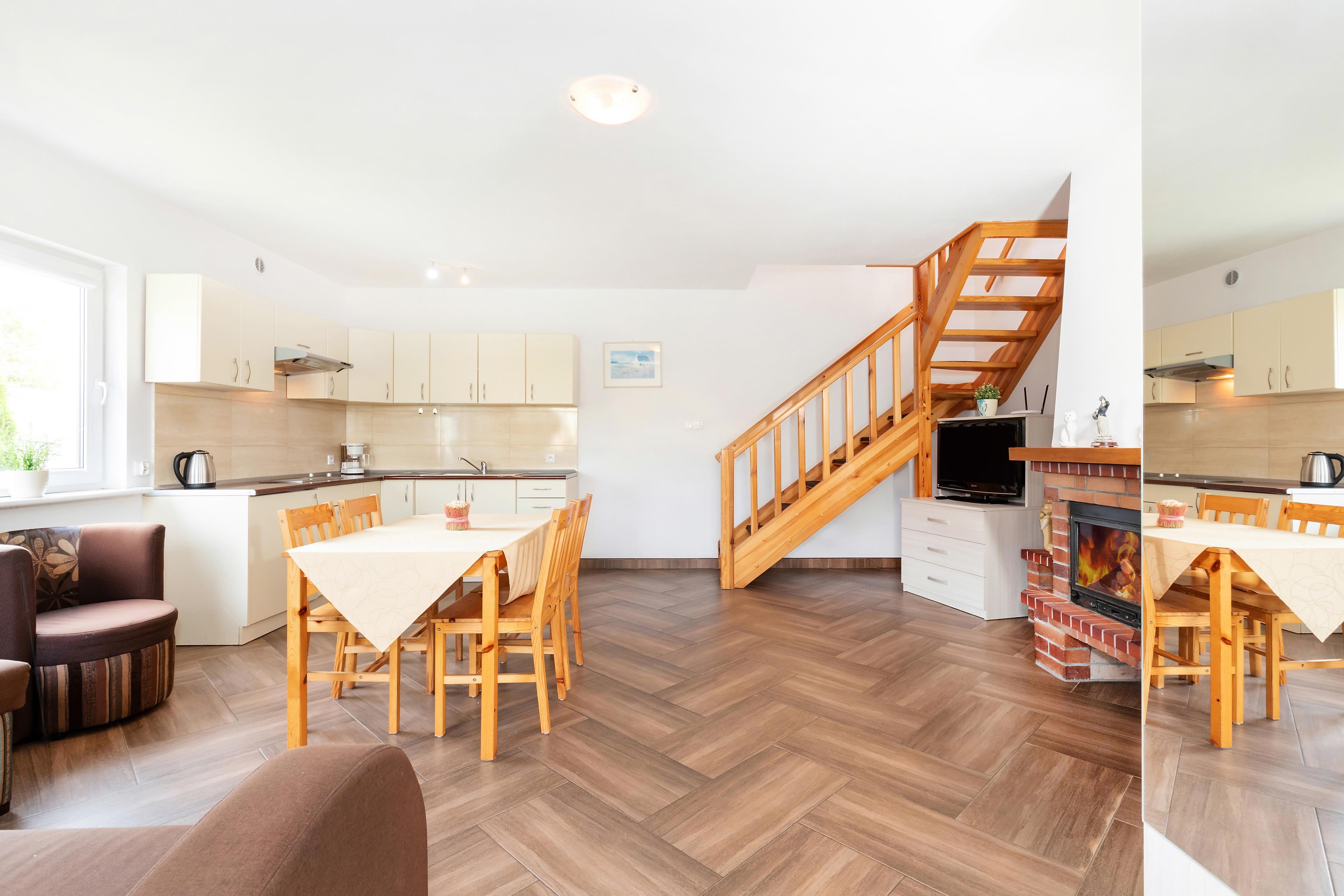 PL 80.9 Ferienhaus 2-6 Pers.: 3-Zimmerhaushälfte mit ca. 44 qm Wohnfläche über 2 Etagen. Parterre: Wohn-/Essraum mit Kamin, Couchgarnitur (Ausziehsofa 2 Pers.), Flachbild Sat-TV, Esstisch, Küchenzeile (2 E-Platten, Abzugshaube). Bad/WC. Dachgeschoss mit Schrägen: Doppelzimmer. 2-Bettzimmer. Separates WC.