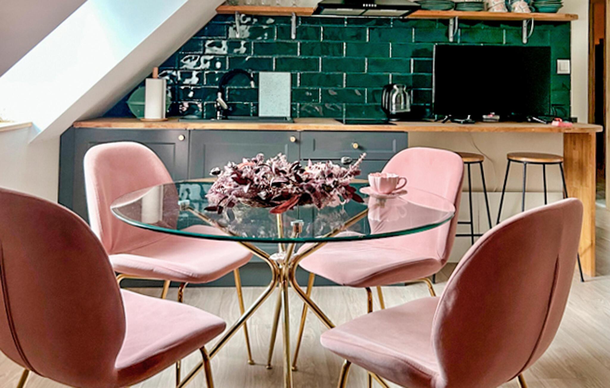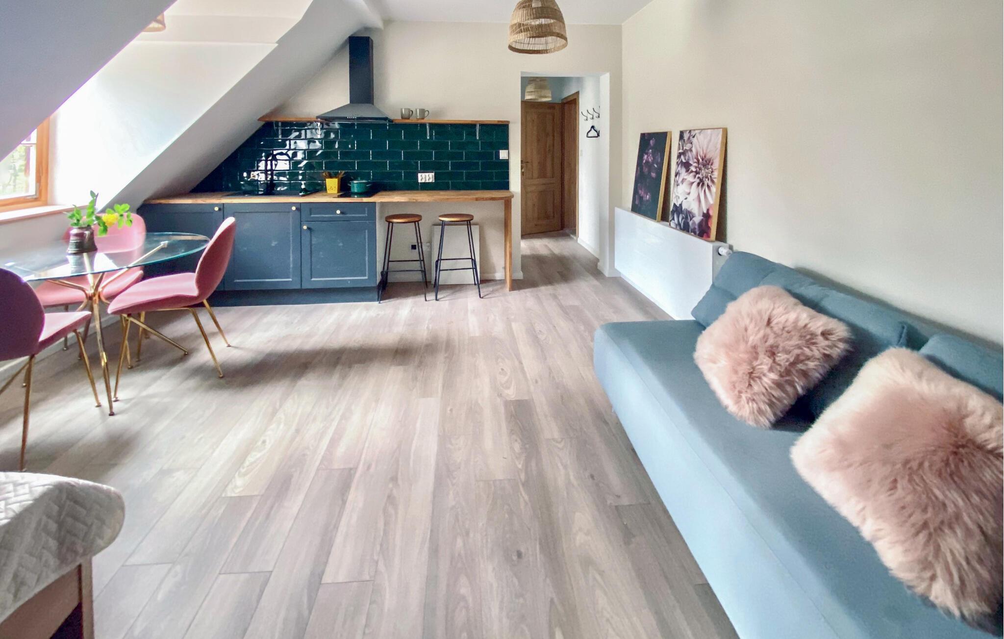 Ihre charmante Ferienwohnung eignet sich ideal für Paare oder kleine Familien, die Ruhe und Natur suchen. Genießen Sie den besonderen Charakter des Hauses, das von üppigem Grün und alten Bäumen umgeben ist. Entfliehen Sie dem Alltag und lassen Sie sich vom märchenhaften Ambiente dieses Ortes verzaubern. Im Inneren erwartet Sie eine stilvoll gestaltete Unterkunft mit viel Liebe zum Detail. Entspannen Sie auf dem gemütlichen Sofa oder genießen Sie gemeinsame Mahlzeiten am runden Esstisch mit eleganten Stühlen. Die offene Küche ist nicht nur funktional, sondern auch ein optisches Highlight.
