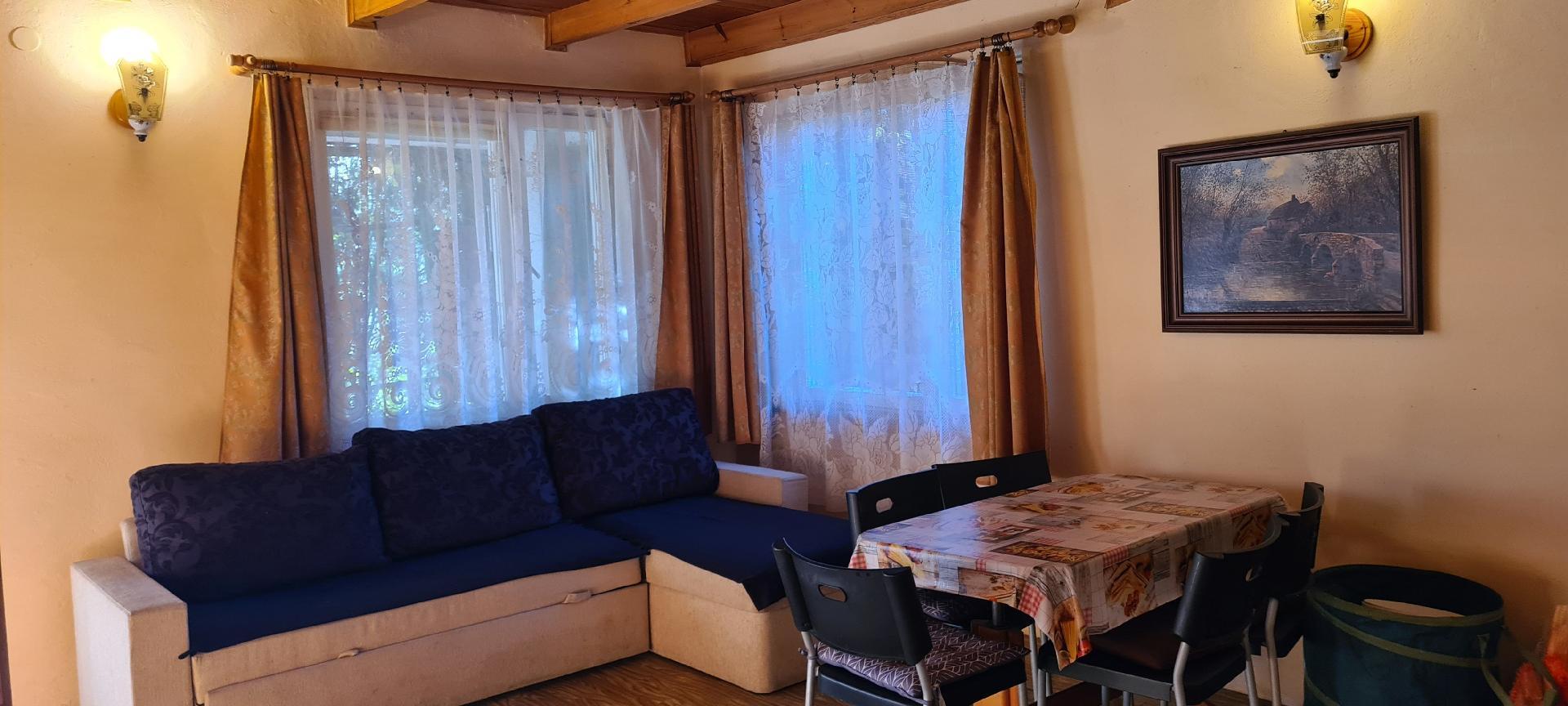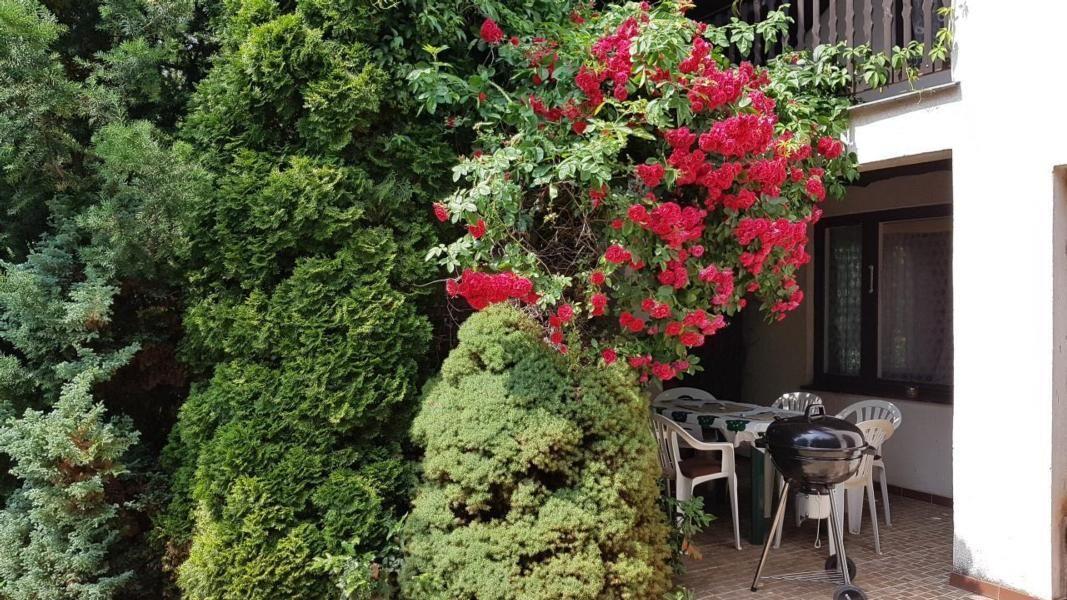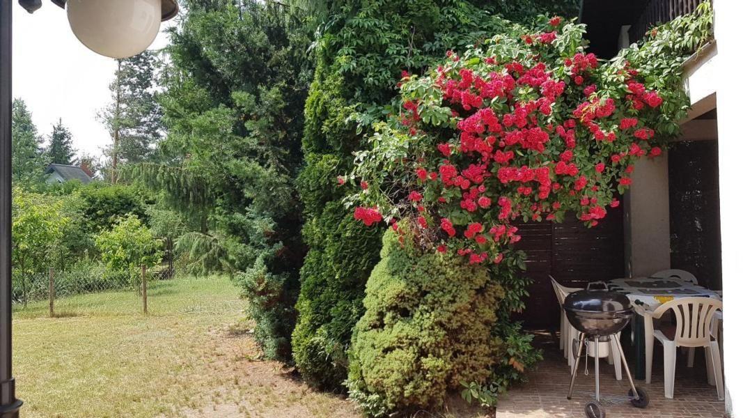 Draußen erwartet die Gäste eine gemütliche, von dichter Vegetation umgebene Terrasse, wo sie sich an einem Tisch mit Gartenstühlen und Kissen entspannen können. Der Garten lockt mit einer bequemen Schaukel, Liegestühlen und einem großen tragbaren Grill, ideal für Sommerabende. Wir empfehlen auch, den ganzen Tag in der Sonne zu faulenzen oder im schattigen Teil des Geländes aktiv zu sein und Ball zu spielen.