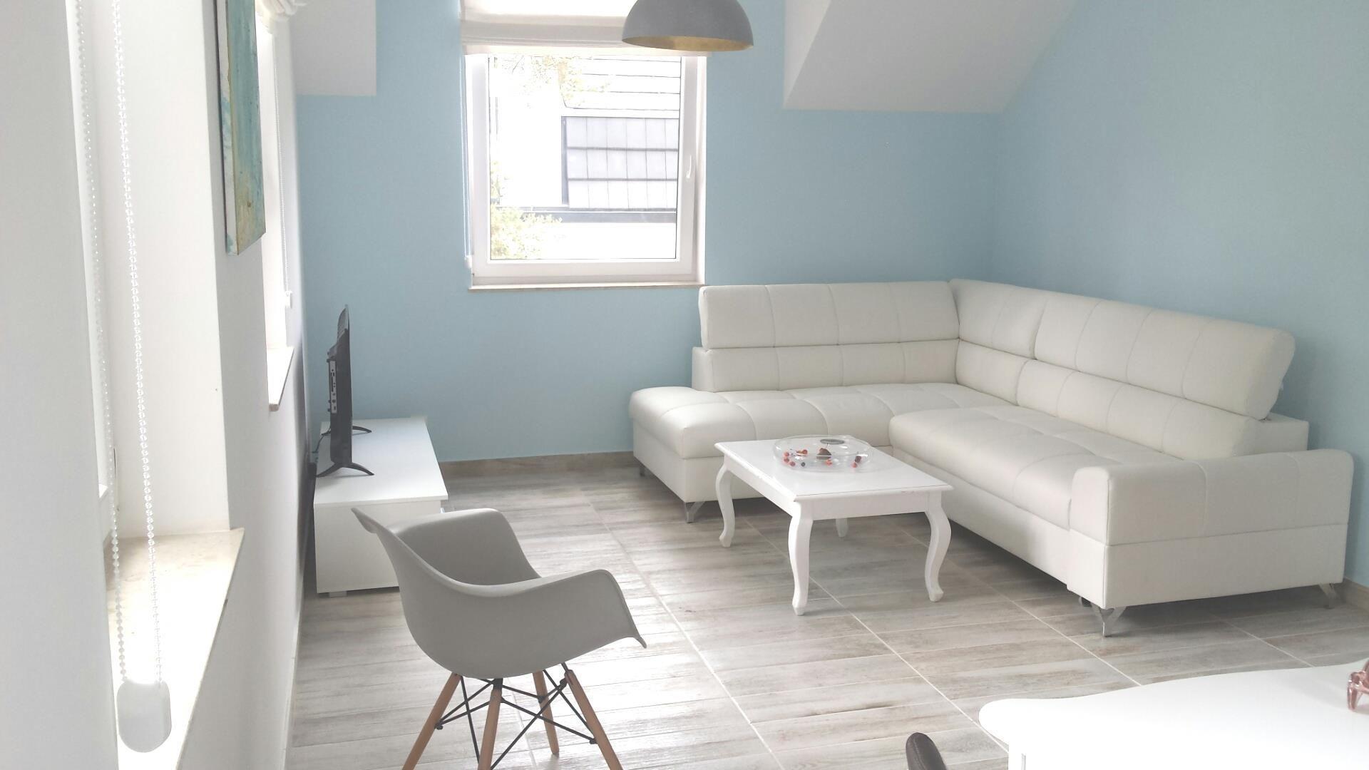Die Ferienwohnung erstreckt sich über das gesamte Obergeschoß, ist 55 qm groß und für 2-6 (ideal für 4) Personen geeignet. Sie besteht aus 2 Schlafzimmern (eins mit großem Doppelbett, eins mit Einzelbett mit ausziehbarem Unterbett), einem geräumigen Wohnzimmer mit Ecksofa mit Schlaffunktion für 2 Personen und einem Esstisch, einer voll ausgestatteten Küche (Kochplatten, Herd mit Grillfunktion, Spülmaschine, großer Kühlschrank mit Gefrierfach, Mikrowelle, Wasserkocher, Kaffeemaschine mit Thermoskanne, Toaster) und einem Bad mit Dusche und Waschmaschine. Auf der gesamten Fläche genießen Sie die Fußbodenheizung. In dem geräumigen Einbauschrank im großen Schlafzimmer ist für sehr viel Stauraum gesorgt. Sie haben einen kostenlosen schnurlosen Internetzugang (WLAN). Mehrere Dutzend deutsche Fernsehsender über Satellit. Zu Ihrer Verfügung stehen: 4 Fahrräder, 40-Zoll-LED-Smart-TV, Bügeleisen mit Bügelbrett, Fön, Wäscheständer, Staubsauger. 2025 wurde die Wohnung renoviert.