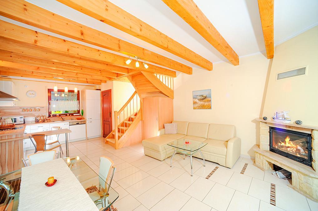 PL 36.7 Ferienhaus 1-6 Pers.: Niveauvolle, großzügige 4-Zimmerhaushälfte mit ca. 80 qm Wohnfläche über 2 Etagen. Parterre: Schöner, großzügiger Wohn-/Essraum mit rustikaler Holzbalkendecke, Kamin, Massage-Sessel, Sitzgarnitur, Sat-TV, Radio/CD, Esstisch, moderner, gut ausgestatteter Küchenzeile (Ceranfeld 4 Pl., Abzugshaube, Backofen, Mikrowelle, Tiefkühltruhe 30 l, Spülmaschine). Waschmaschine in Abstellkammer. Bad: Bw, Wb, WC. 1. Etage: 3 Doppelzimmer. Bad: Du, Wb, WC. 2. Etage: offenes Wohnzimmer mit Sitzcouch, Sesseln.
