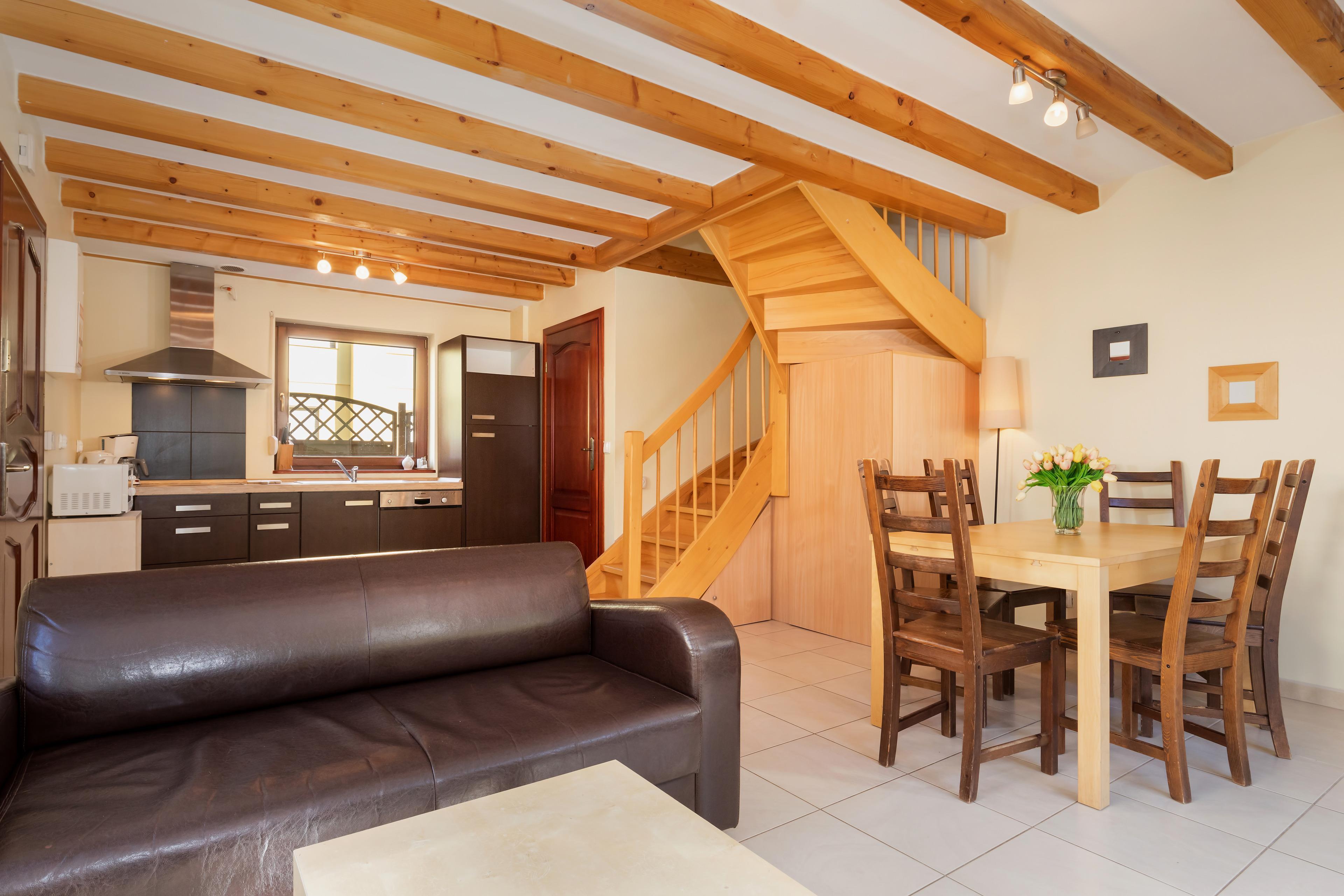 PL 36.5 Ferienhaus 2-6 Pers.: Niveauvolle 4-Zimmerhaushälfte mit ca. 64 qm Wohnfläche über 2 Etagen. Parterre: Schöner, großzügiger Wohn-/Essraum mit Kamin, Sitzgarnitur, Sat-TV, Radio/CD, Esstisch, moderner Küchenzeile (Backofen nur in PL 36.5), Spülmaschine, Mikrowelle). Bad/WC. 1. Etage: 2 Doppelzimmer mit franz. Bett. 2-Bettzimmer mit Etagenbett. Bad/WC.