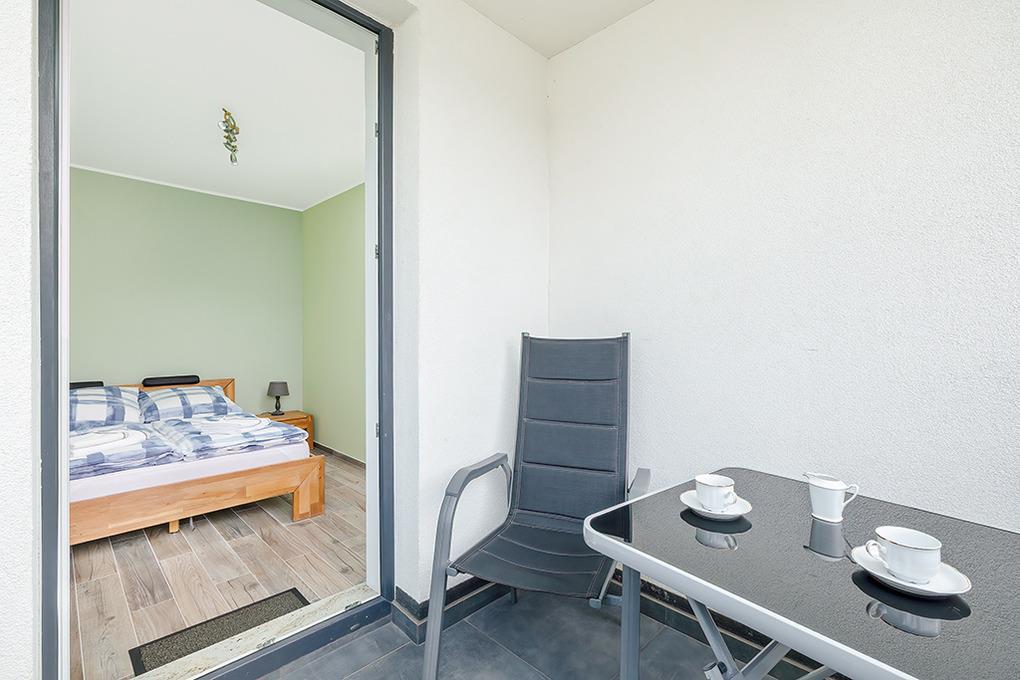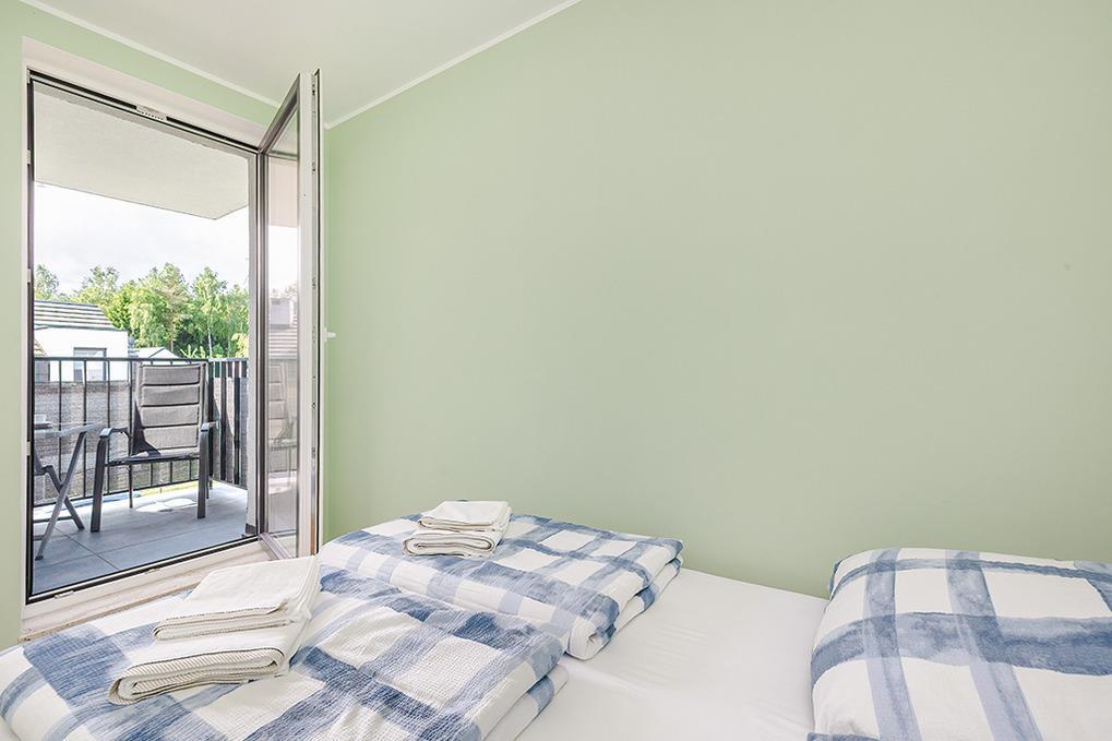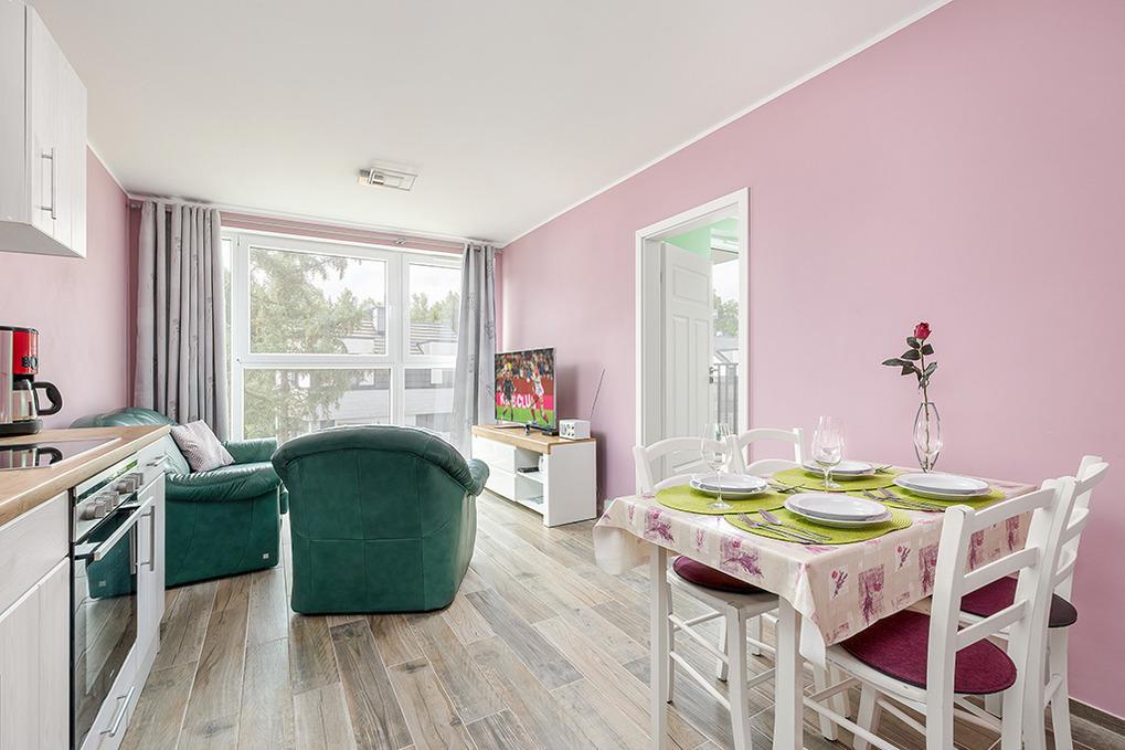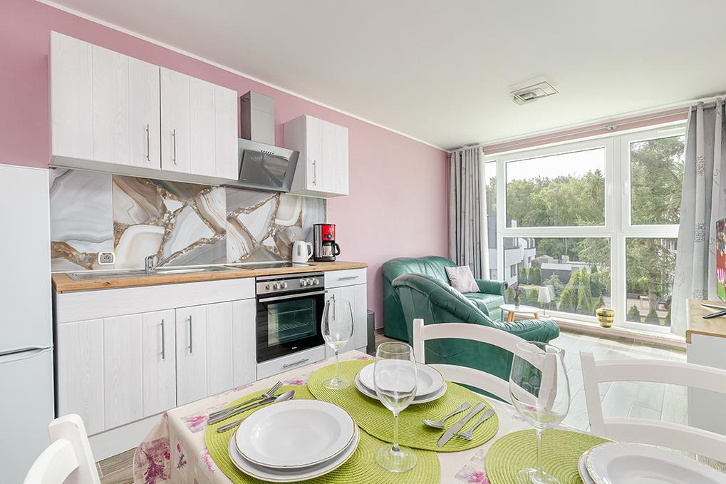 PL 36.22 Wohnung 1-4 Pers.: Geschmackvoll eingerichtete 2-Zimmerwohnung mit 35 qm Wohnfläche in der 1. Etage. Gemütlich möblierter, heller Wohn-/Essraum mit bodentiefer Fensterfront, Couchgarnitur (Schlafsofa 2 Pers.), SMART-TV, Esstisch, Küchenzeile (4 Pl.-Ceranfeld, Abzugshaube, Gefrierschrank 60 l, Backofen). Doppelzimmer. Modernes Bad mit Regendusche, Wb,WC. Balkon mit Sitzmöbeln.