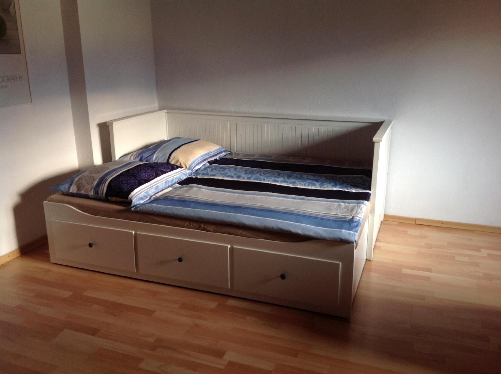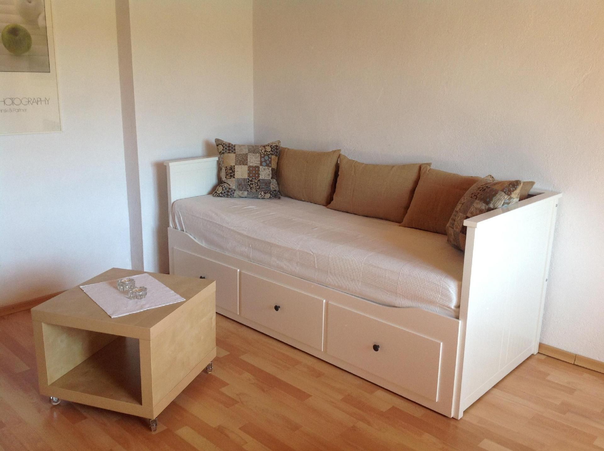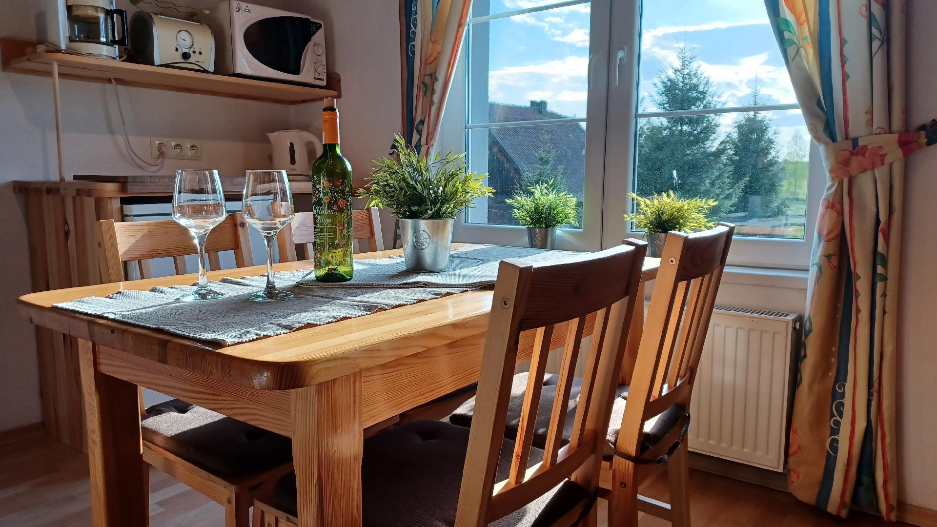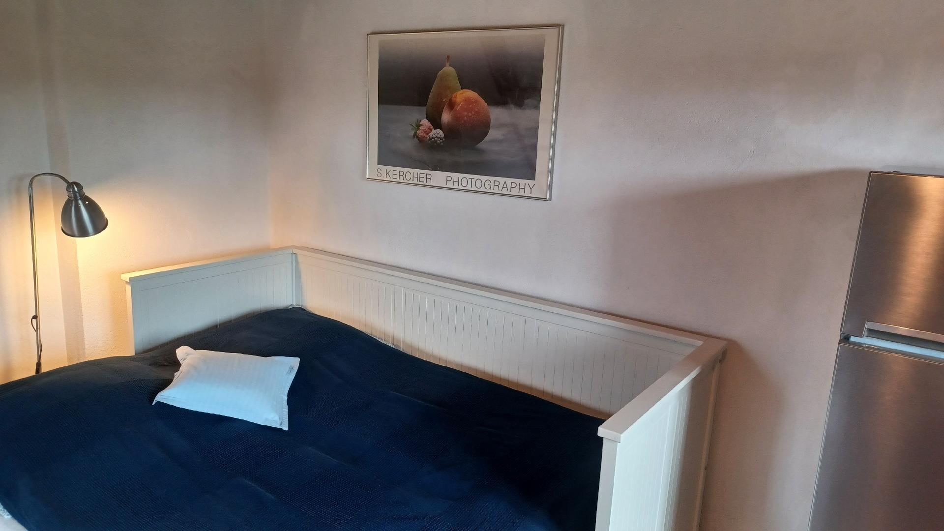 Die Ferienwohnung, 60 m², ist ideal für 4-5 Personen und verfügt über ein Tagesbettsofa im Wohnbereich, das mit wenigen Handgriffen ein großes, komfortables Doppelbett wird. Da die Decke sehr hoch ist, wurde eine Etage mit einem Schlafzimmer mit 2 Einzelbetten kreiert. Ein drittes Bett kann auf Anfrage dazugestellt werden. Der große, offene Wohnbereich mit Küchenzeile verfügt über einen Esstisch mit 5 Stühlen, Sat-TV und kostenloses Wlan. Das Badezimmer mit Fenster hat eine Dusche, eine Toilette und ein Waschbecken.