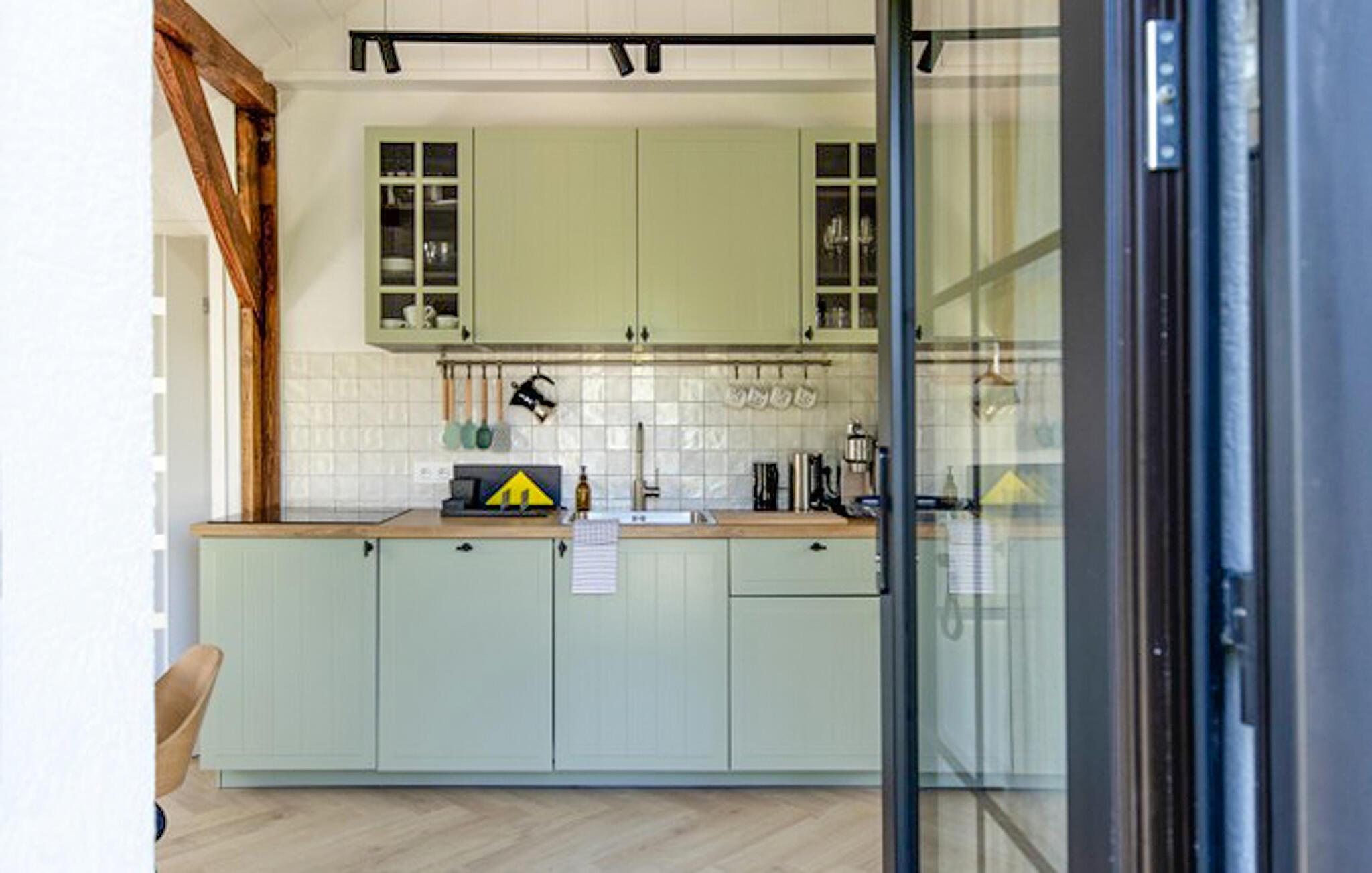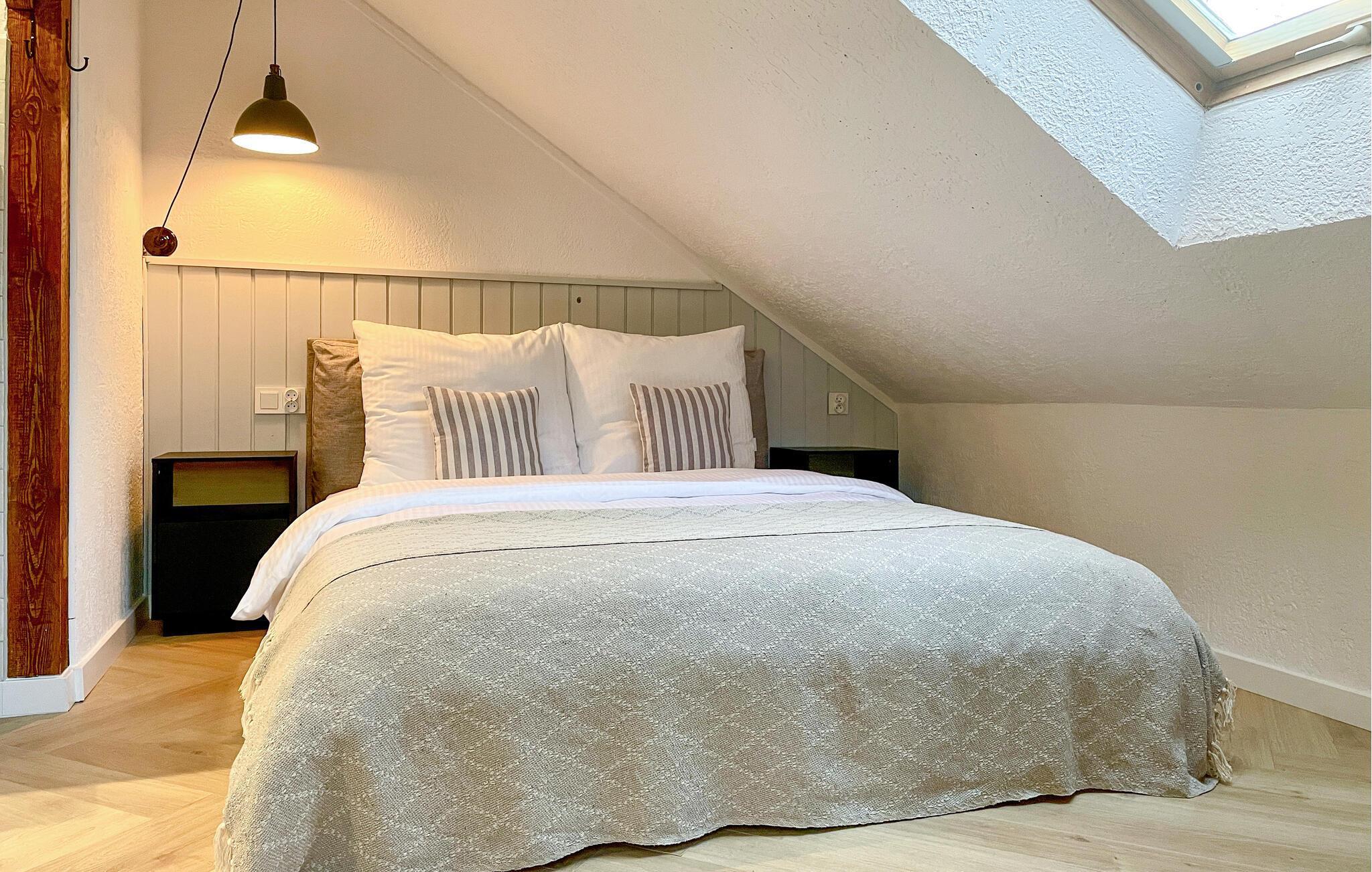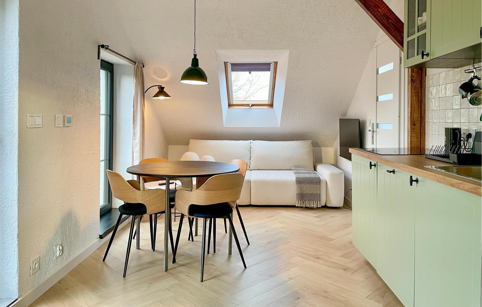 Erleben Sie Ruhe, Natur und ländlichen Charme in dieser liebevoll gestalteten Ferienwohnung. Im Wohnbereich schafft die Kombination aus warmem Holz, sanften Farben und rustikalen Balkenelementen eine harmonische Atmosphäre. Entspannen Sie auf dem bequemen Sofa, genießen Sie eine Mahlzeit am runden Esstisch oder bereiten Sie in der praktischen Küche Ihre Lieblingsgerichte zu.