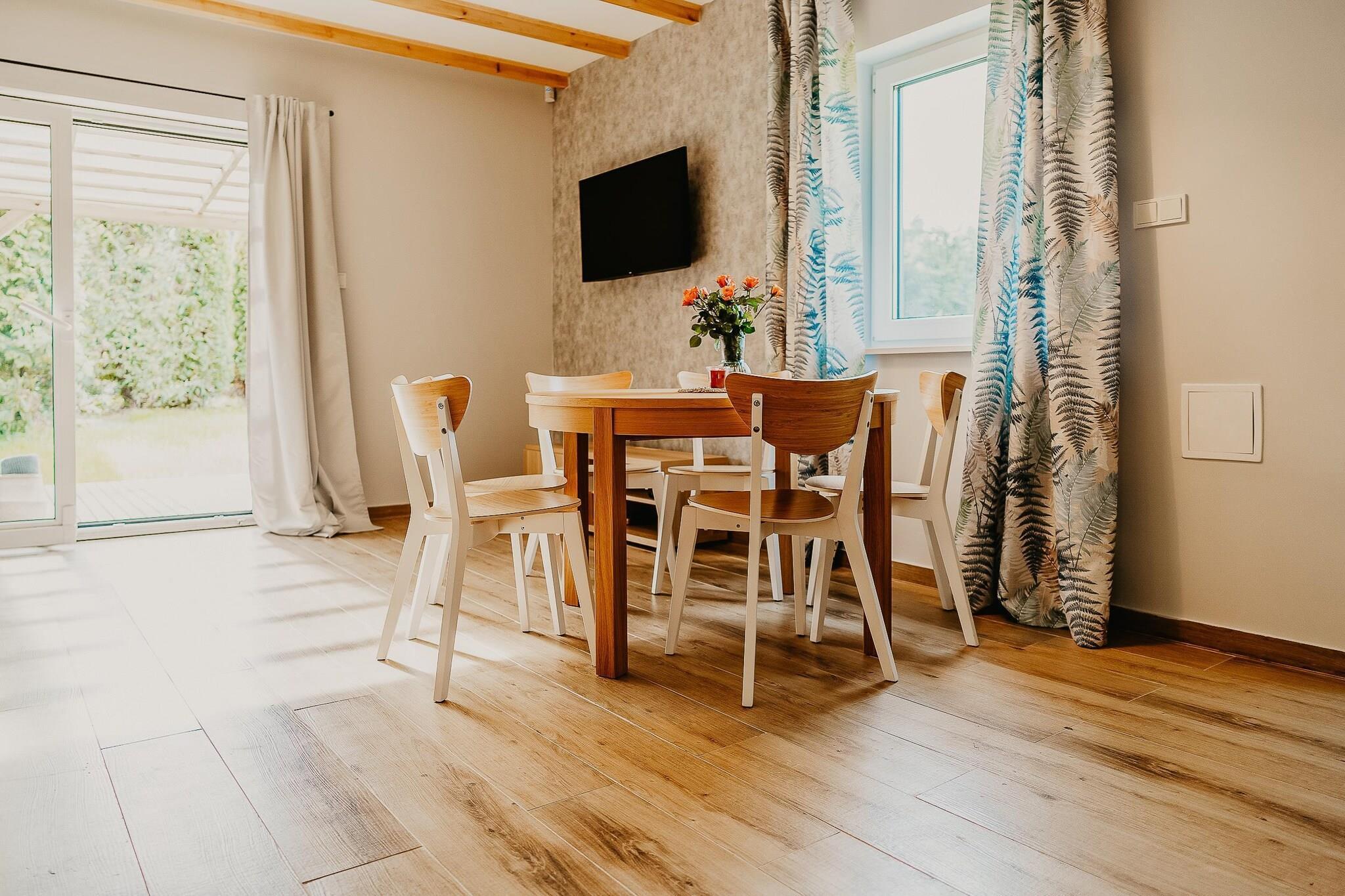 In der am Zarnowieckie-See gelegenen Stadt Nadole können sich die Gäste über drei neu gebaute Ganzjahreshäuser mit einer Fläche von jeweils 100 m² freuen. Unsere Häuser entsprechen den Standards ökologischer, energiesparender Gebäude. Ihre moderne Architektur und der großzügige Innenraum sorgen für Entspannung und komfortable Erholung. Von der Unterkunft aus haben Sie Zugang zu einem Privatstrand. Dank seiner großen Fläche bietet das Haus Platz für bis zu acht Personen. Im Erdgeschoss gibt es eine voll ausgestattete, moderne Küche, Toilette und ein geräumiges Wohnzimmer mit Zugang zur Terrasse. Im ersten Stock befinden sich zwei große Schlafzimmer und ein Badezimmer mit Dusche. Pro Ferienhaus stehen zwei Fahrräder sowie ein Kanu zur Verfügung. Die Ferienhäuser können das ganze Jahr über genutzt werden. Sie verfügen über eine Klimaanlage mit Heizmöglichkeit. Für unsere Gäste haben wir die Möglichkeit vorbereitet, einen beheizten Whirlpool zu buchen, der den Gästen das ganze Jahr über ohne Reservierungsgebühr zur Verfügung steht. Es fällt lediglich die Holzgebühr an. Das Schwimmbad steht in der Sommersaison zur Verfügung.