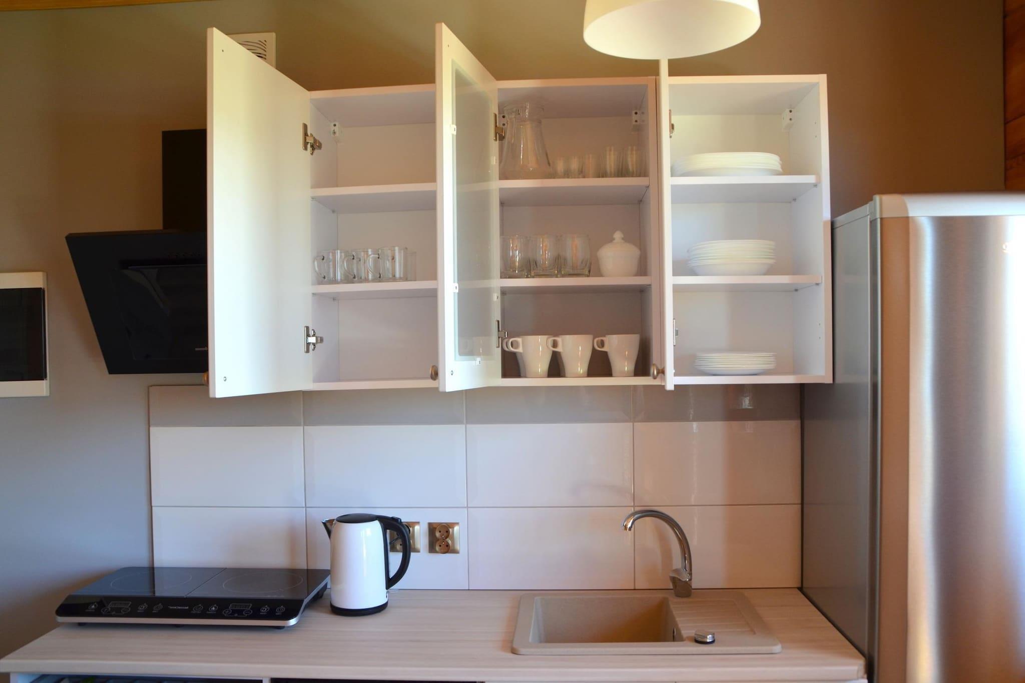 Parterre: (Kochnische(Kochplatte(2 Kochplatten, Induktion), Wasserkocher, Kaffeemaschine, Grill, Spülmaschine, Kühl-/Gefrierkombination), Wohn/Esszimmer(TV, Sitzecke), Badezimmer(Dusche, Waschbecken, Toilette)) In der 1. Etage: (Schlafzimmer(Einzelbett, Einzelbett), Schlafzimmer(Doppelbett), Schlafzimmer(Doppelbett), Toilette) Terrasse(überdacht), Gartenmöbel, Parkplatz, Hochstuhl, Außenkamin, Babybett (kostenlos)