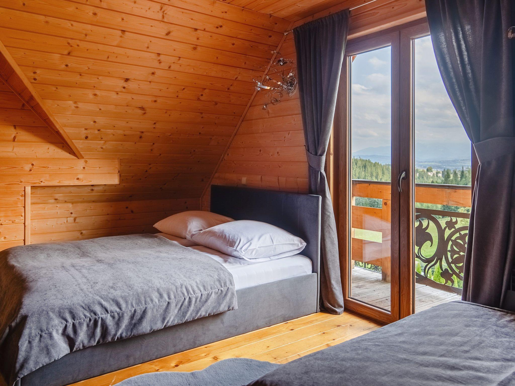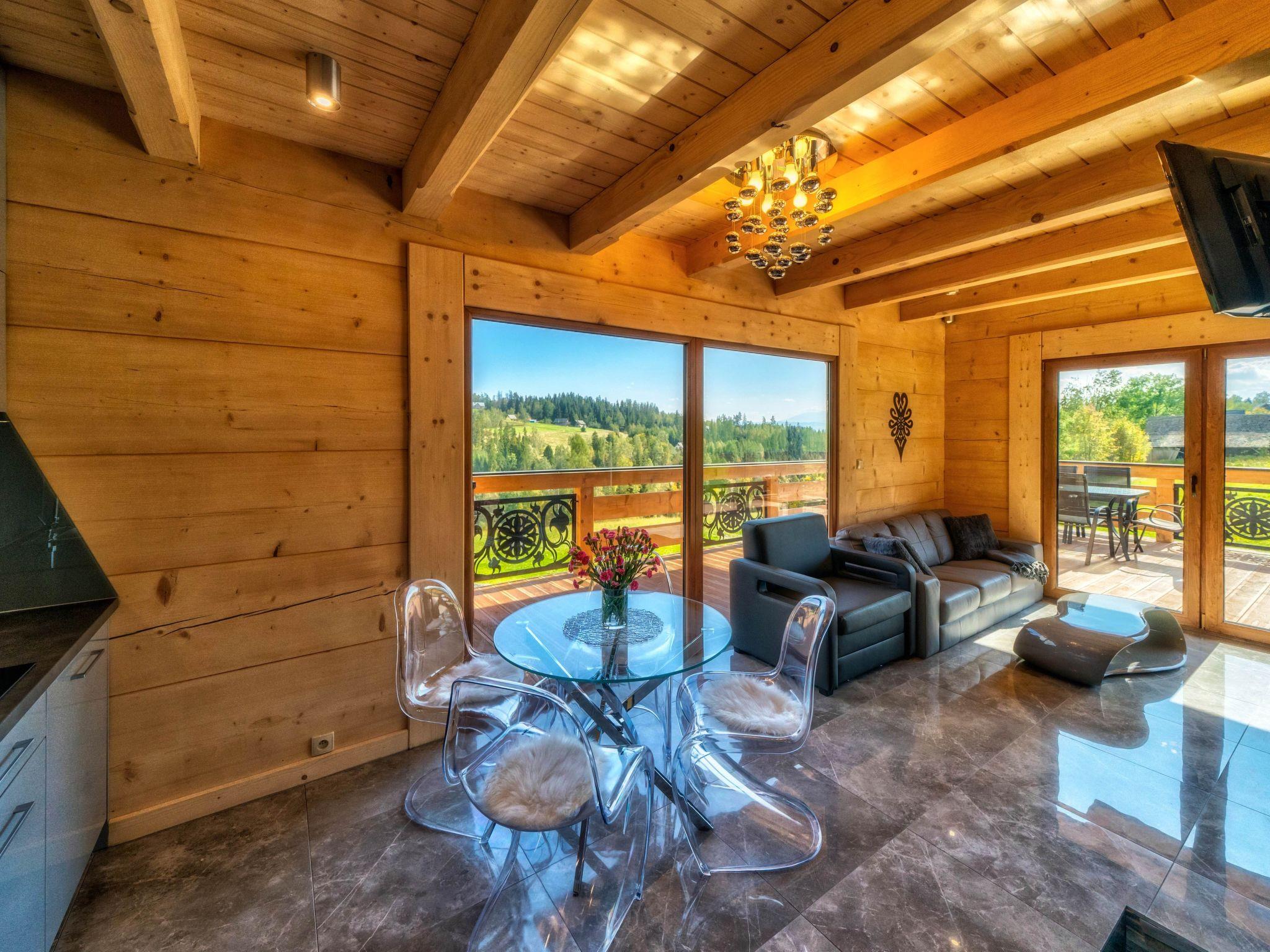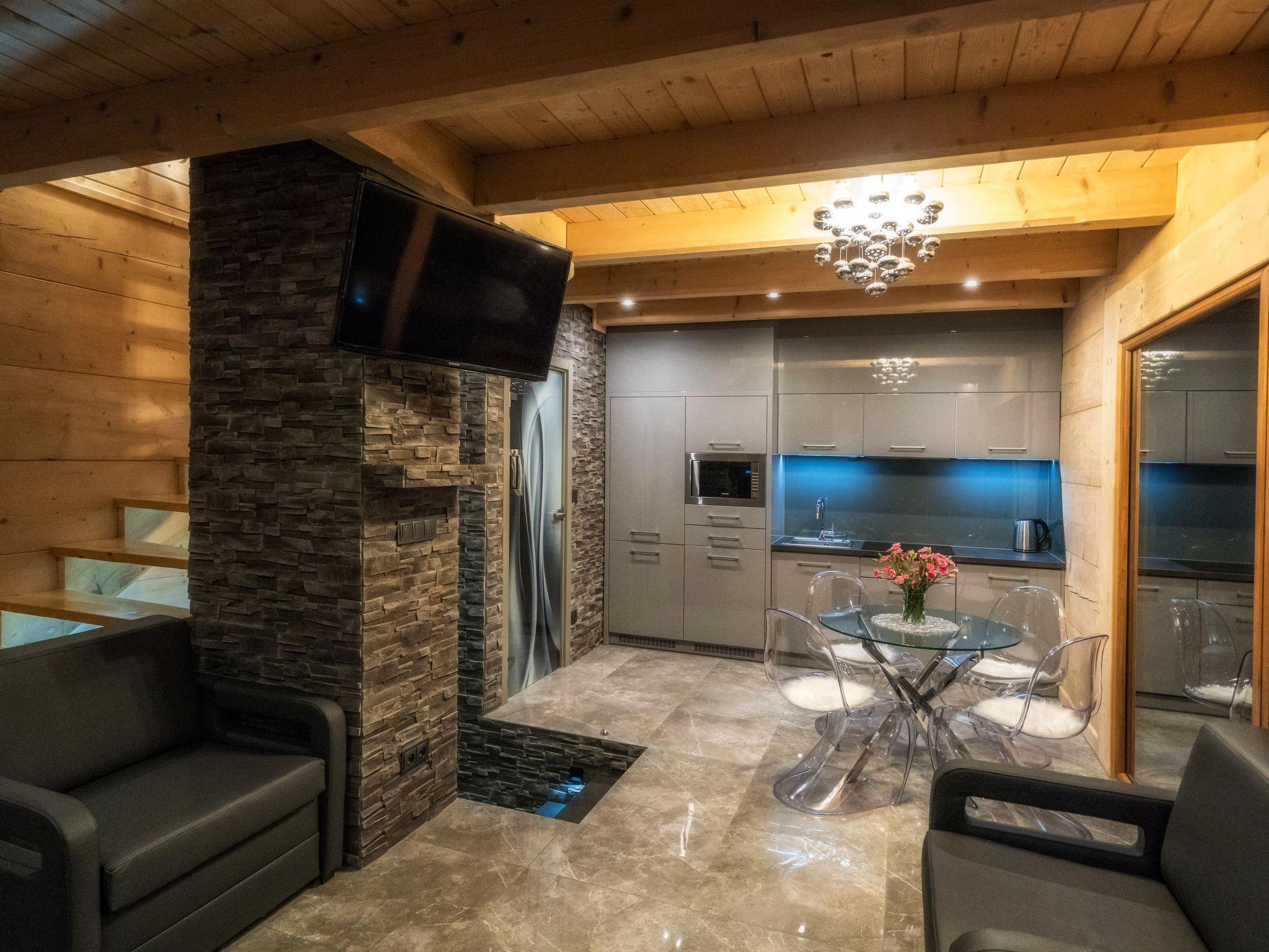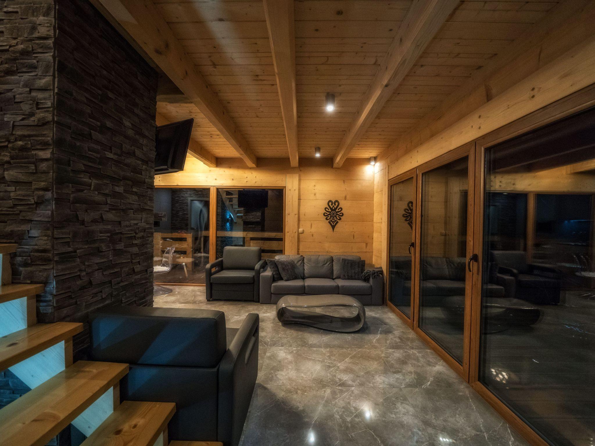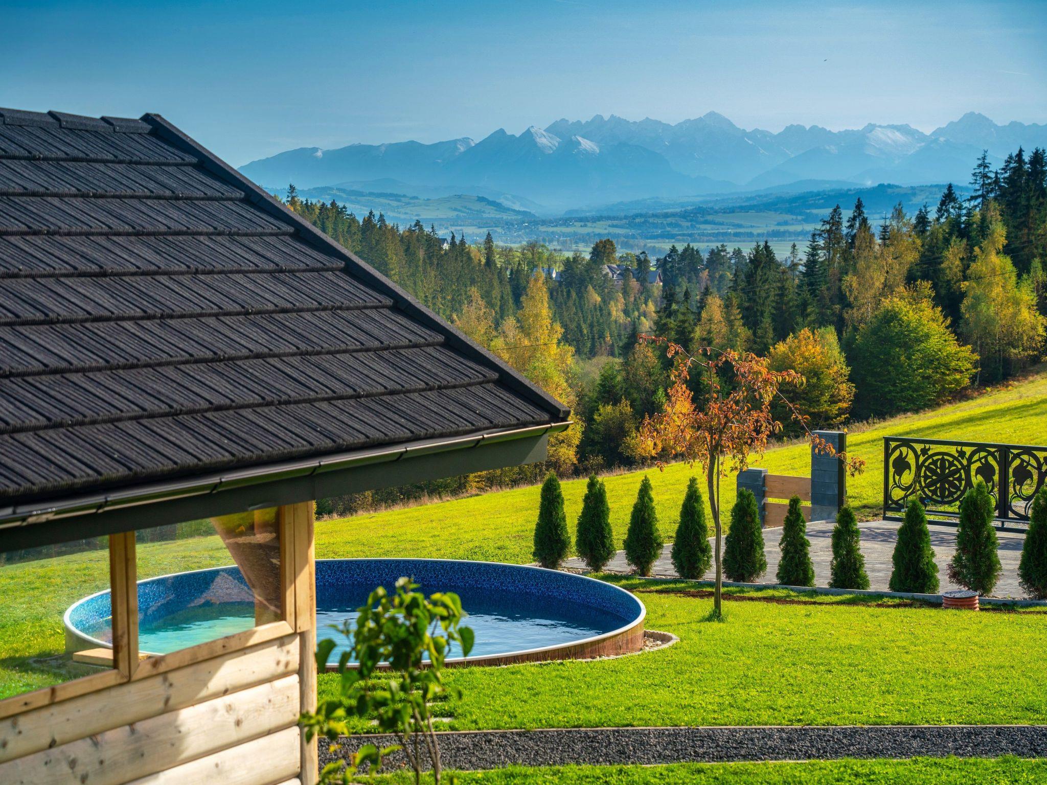 Im Erdgeschoss befindet sich ein offenes Wohnzimmer mit Küchenzeile, ein kleines Badezimmer (WC + Waschbecken) und ein direkter Zugang zur Terrasse, von der aus Sie den Blick auf die Tatra, das Gorce-Gebirge und einen großen Garten mit Swimmingpool, Whirlpool und Pavillon für abendliche Feste genießen können.