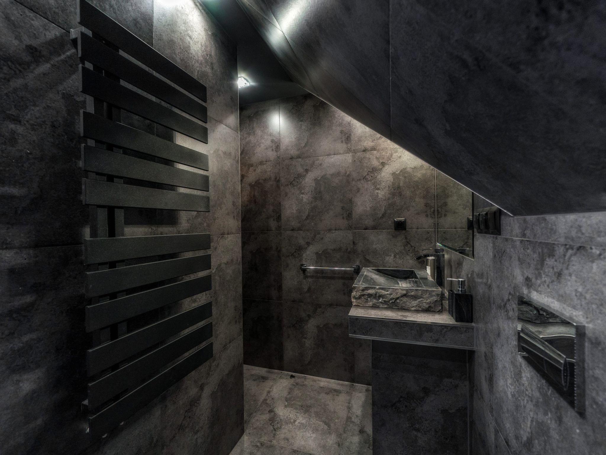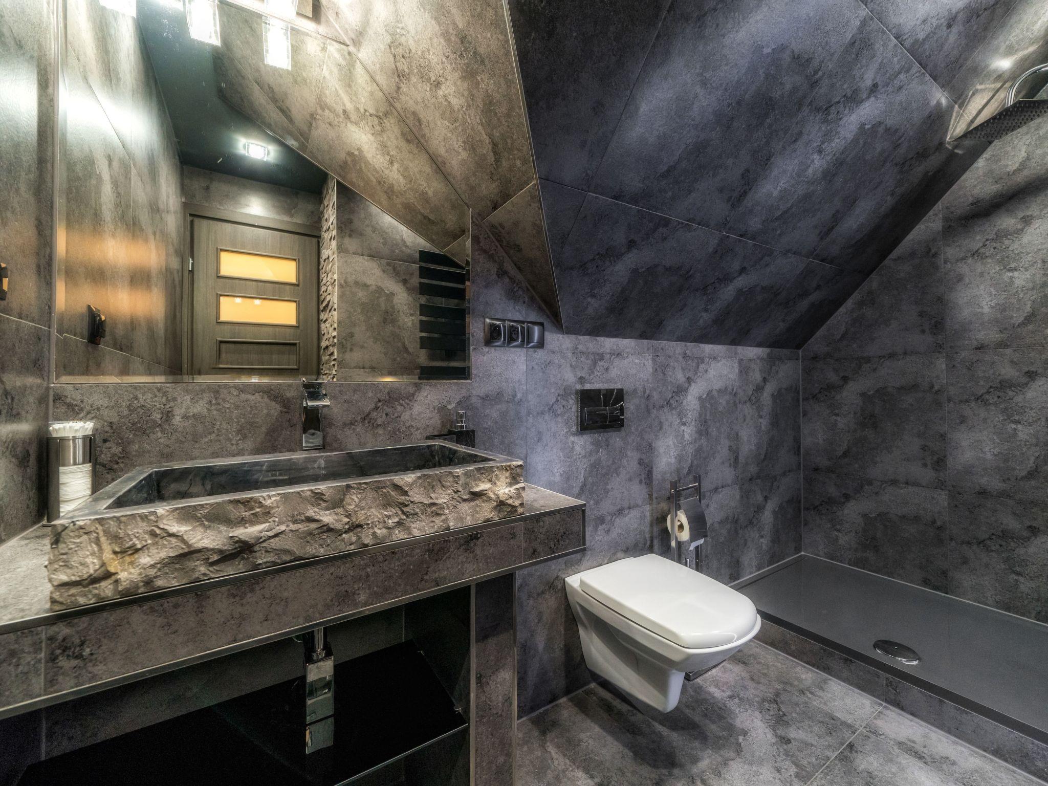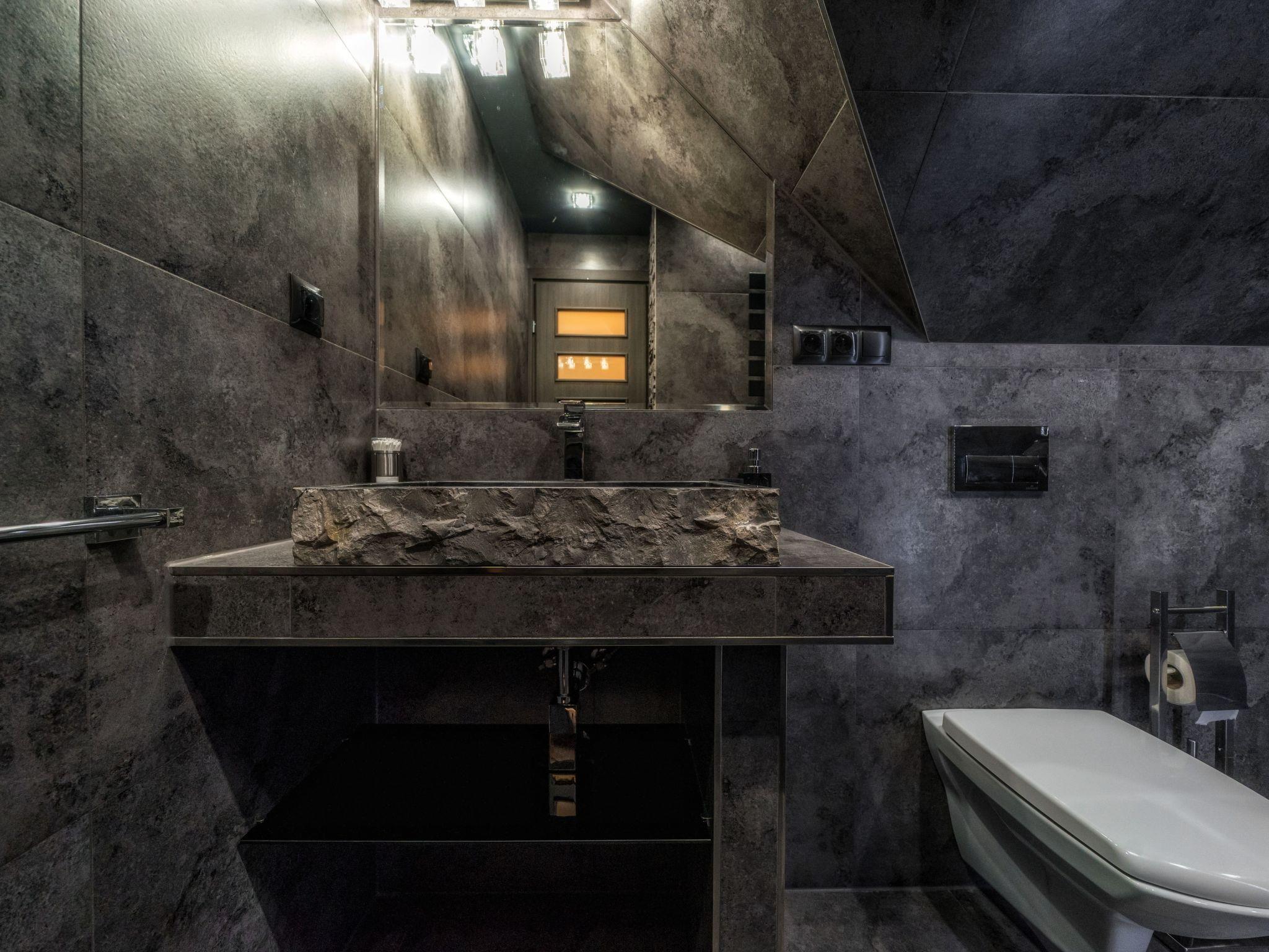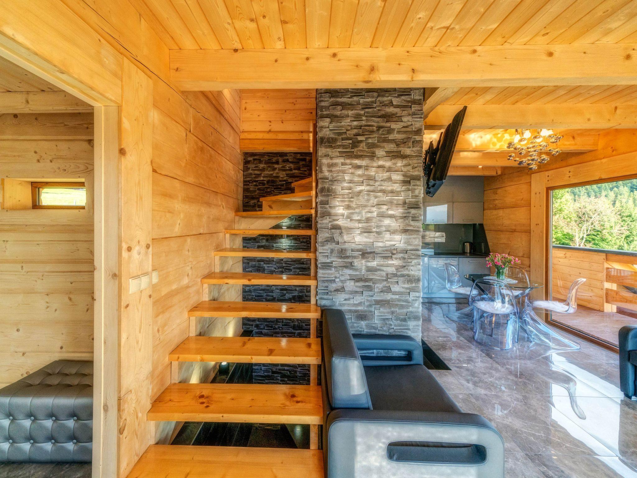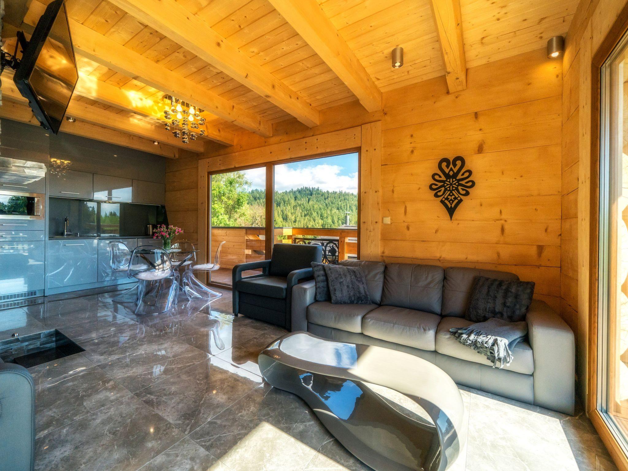 Im Erdgeschoss befindet sich ein offenes Wohnzimmer mit Küchenzeile, ein kleines Badezimmer (WC + Waschbecken) und ein direkter Zugang zur Terrasse, von der aus Sie den Blick auf die Tatra, das Gorce-Gebirge und einen großen Garten mit Swimmingpool, Whirlpool und Pavillon für abendliche Feste genießen können.