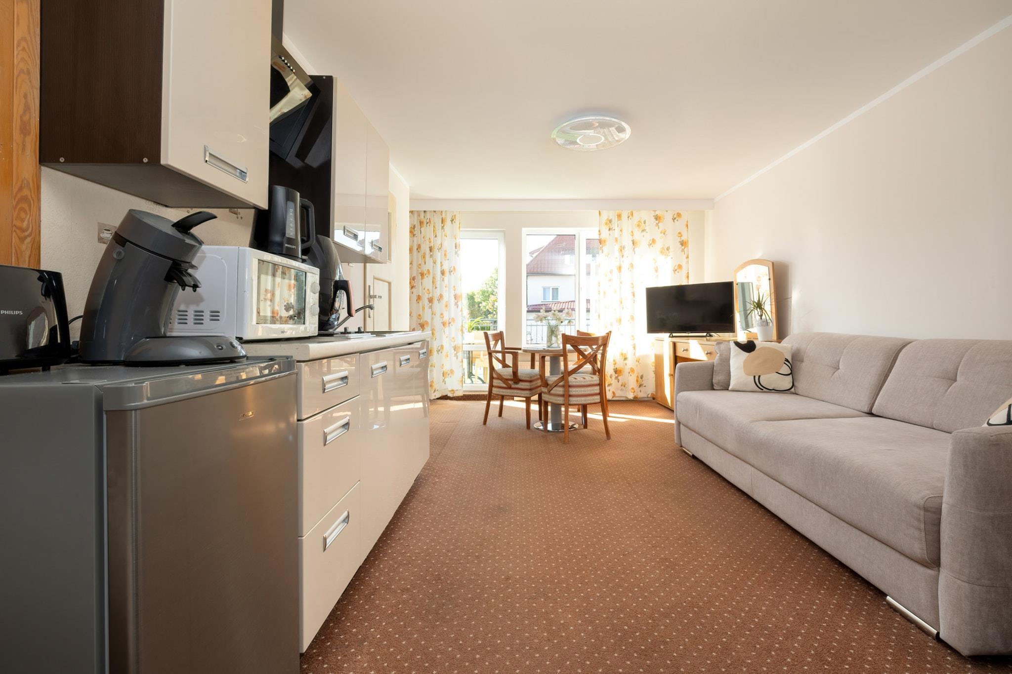 Ein gemütliches Apartmentgebäude in einer ruhigen Gegend im Zentrum des Resorts. 300 m zum Strand. Restaurants, Cafés, Geschäfte und alle Attraktionen des Resorts sind nur wenige Schritte entfernt. Studio-Apartment im ersten Stock. Es verfügt über eine große, eingezäunte Terrasse mit Gartenmöbeln. Den Gästen steht ein offener Raum zur Verfügung, bestehend aus einem Wohnbereich (TV, Doppelschlafsofa, Tisch), einer gut ausgestatteten Küche und einem separaten Schlafbereich mit einem bequemen Doppelbett. Badezimmer mit Dusche. Zentralheizung. WLAN ist verfügbar. Auf dem umzäunten Gelände neben dem Gebäude befinden sich ein Parkplatz, ein Gartenpavillon und ein öffentlicher Grill. Im Erdgeschoss gibt es ein gemütliches Restaurant/Bar. Frühstück und Abendessen werden hier in Form eines schwedischen Buffets serviert. Auch Mittagsgerichte können bestellt werden (täglich mehrere attraktive Angebote). Im Preis Ihres Aufenthalts inbegriffen: Bettwäsche, Handtücher, Strom- und Wasserverbrauch, Internet, Parkplatz, Endreinigung. Babybett und Hochstuhl auf Anfrage verfügbar. Rewal ist ein charmanter Badeort. Es bietet Touristen einen sauberen Strand und eine unvergessliche Aussicht von den Klippen am Meer. Hier befindet sich eine Fischerbasis, perfekt als Hintergrund für Erinnerungsfotos. Das Wahrzeichen der Stadt müssen Sie unbedingt sehen: die mächtigen Rewal-Wale auf der Promenade, nahe der Aussichtsplattform. Kinder werden von einem Besuch im Walpark mit echten Meeresriesen begeistert sein. Ein Ausflug in den großen Aquapark Sandra im benachbarten Pogorzelica bietet fantastische Unterhaltung für die ganze Familie. Der Stolz der Stadt ist die renovierte Schmalspurbahn, mit der reizvolle Ausflüge in die benachbarten Ferienorte unternommen werden können.