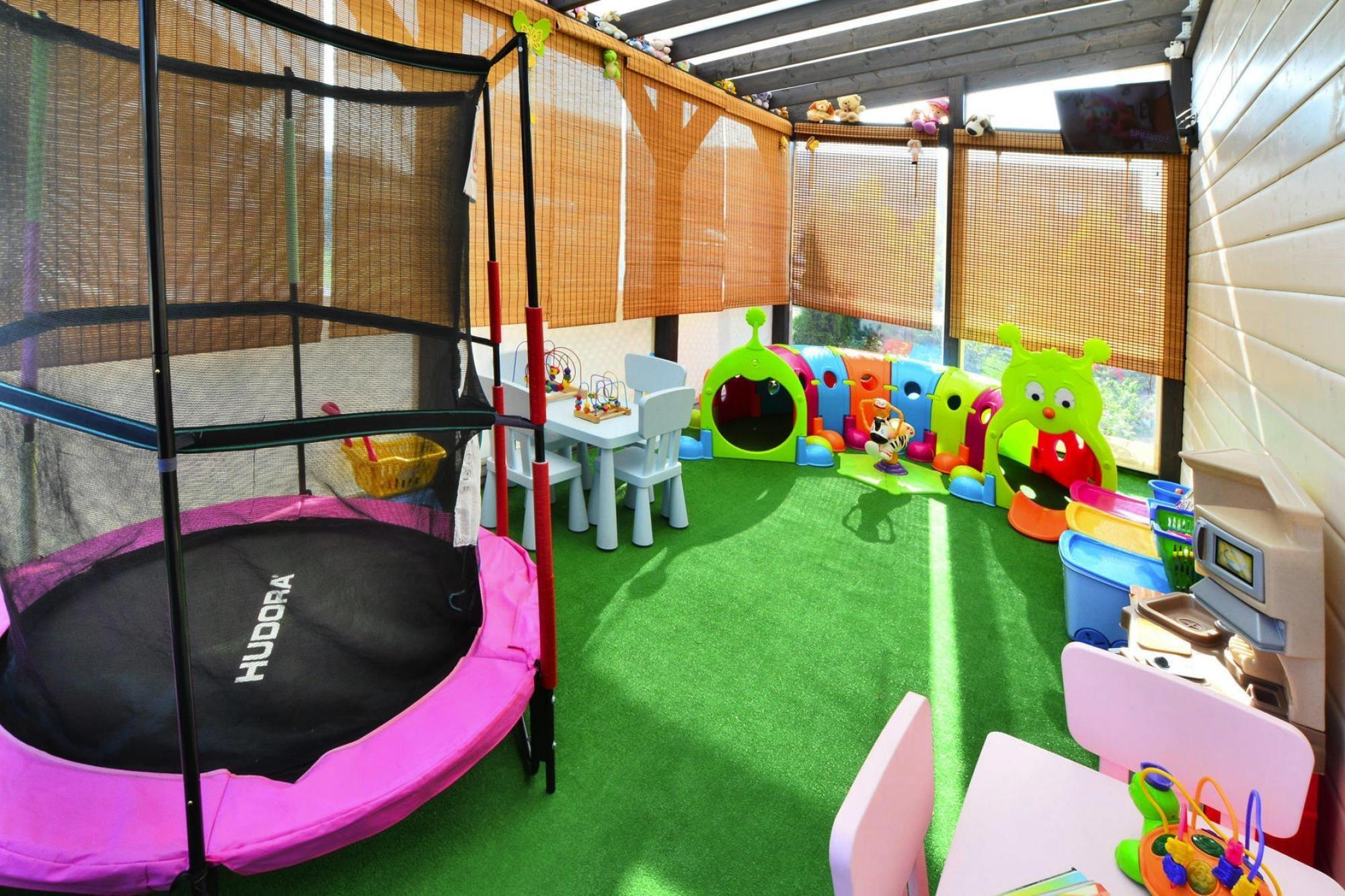 Parterre: (offene Küche(Kochplatte(2 Kochplatten, Induktion), Wasserkocher, Toaster, Kaffeemaschine, Mikrowelle, Spülmaschine, Kühl-/Gefrierkombination, Waschmaschine), Wohn/Esszimmer(Doppelschlafcouch, TV(Flatscreen, Satellit, Deutsch Fernsehsender), Esstisch(6 Personen)), Badezimmer(Dusche, Waschbecken, Toilette, Föhn)) In der 1. Etage: (Schlafzimmer(Doppelbett, Etagenbett), Schlafzimmer(Doppelbett, Etagenbett)) Rezeption, Internet, Parkplatz, Tischfußball, Tischtennis, Fahrradverleih, Tischtennisplatte, Indoor Spielraum, Spielplatz, Liegewiese, Babybadewanne, Whirlwanne(im Garten, gegen Gebühr), Sauna(gegen Gebühr, 4 Personen), Heizung(elektrisch, durch Klimaanlagen), Klimaanlage, Terrasse(überdacht), Garten(Gemeinschaftliche Nutzung mit anderen Gästen, umzäunt, 1000 m2), Gartenmöbel, Liegen, Grill(Holzkohle), Trampolin(Gemeinschaftliche Nutzung mit anderen Gästen), Sandkasten(Gemeinschaftliche Nutzung mit anderen Gästen), Spielgeräte(Gemeinschaftliche Nutzung mit anderen Gästen), Rutsche(Gemeinschaftliche Nutzung mit anderen Gästen), Fahrräder verfügbar(gegen Gebühr), Hochstuhl, Bügelbrett, Bügeleisen, Spielzeug, Sonnenschirm, Schaukel, Babybett (kostenlos)