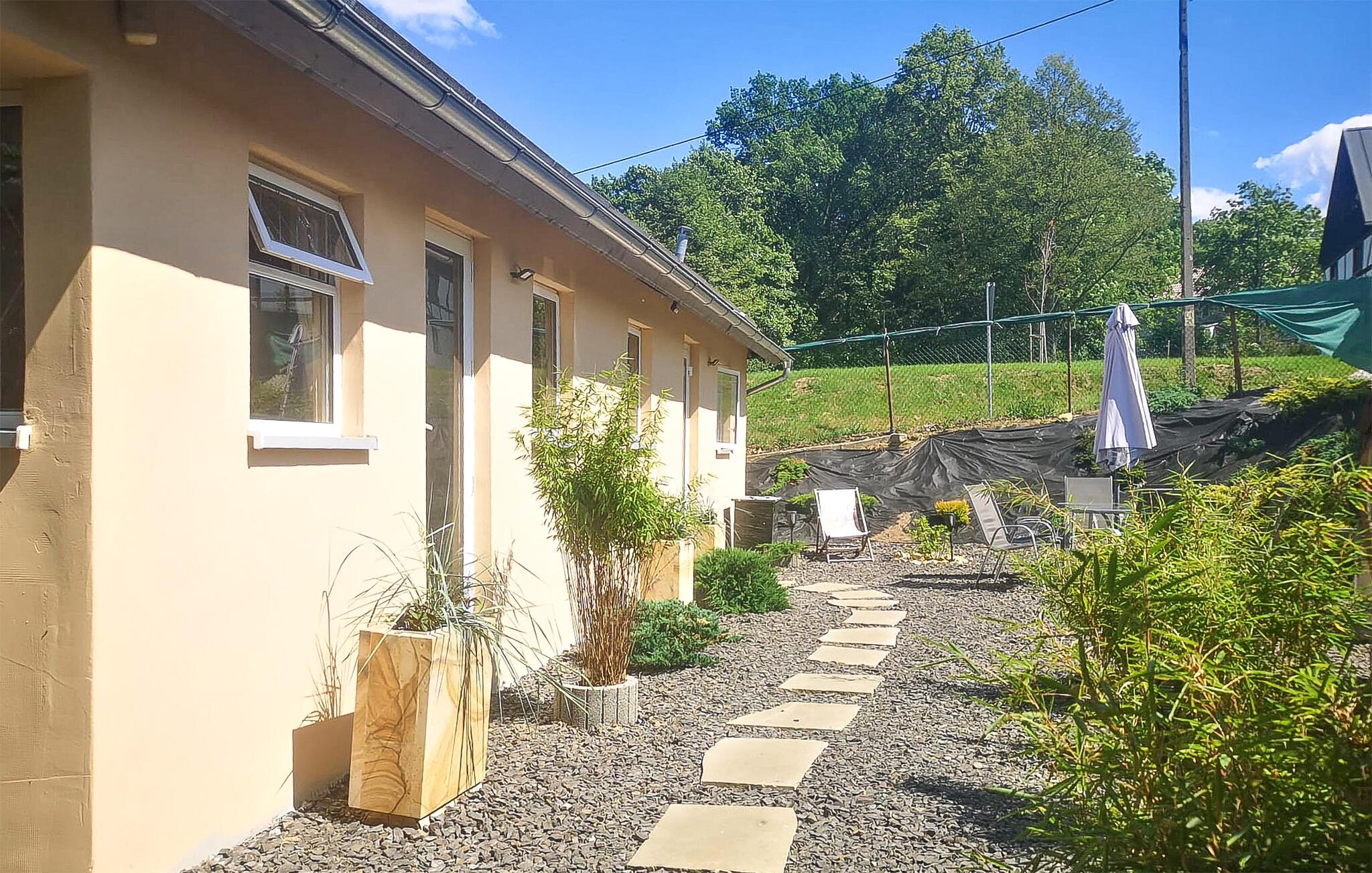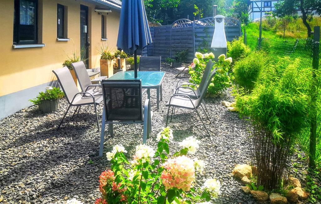 Treten Sie nach draußen und entspannen Sie auf der gepflegten Terrasse mit Gartenmöbeln und Grill. Lassen Sie den Blick über das Grundstück schweifen oder genießen Sie Ihre freie Zeit im Wellnessbereich. Schwitzen Sie in der gemeinschaftlich genutzten Sauna oder gönnen Sie sich eine Pause im gemütlichen Finnischen Holzbad.
