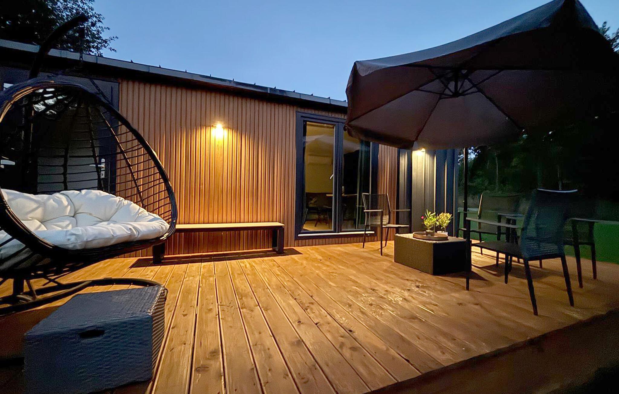 Gehen Sie hinaus auf die Sonnenterrasse und lassen Sie die Seele baumeln. Setzen Sie sich in die Loungemöbel unter schattigen Bäumen oder verweilen Sie am kleinen Steg mit gemütlicher Sitzbank direkt am Wasser. Abends schafft die Feuerstelle im Garten eine besonders stimmungsvolle Atmosphäre.