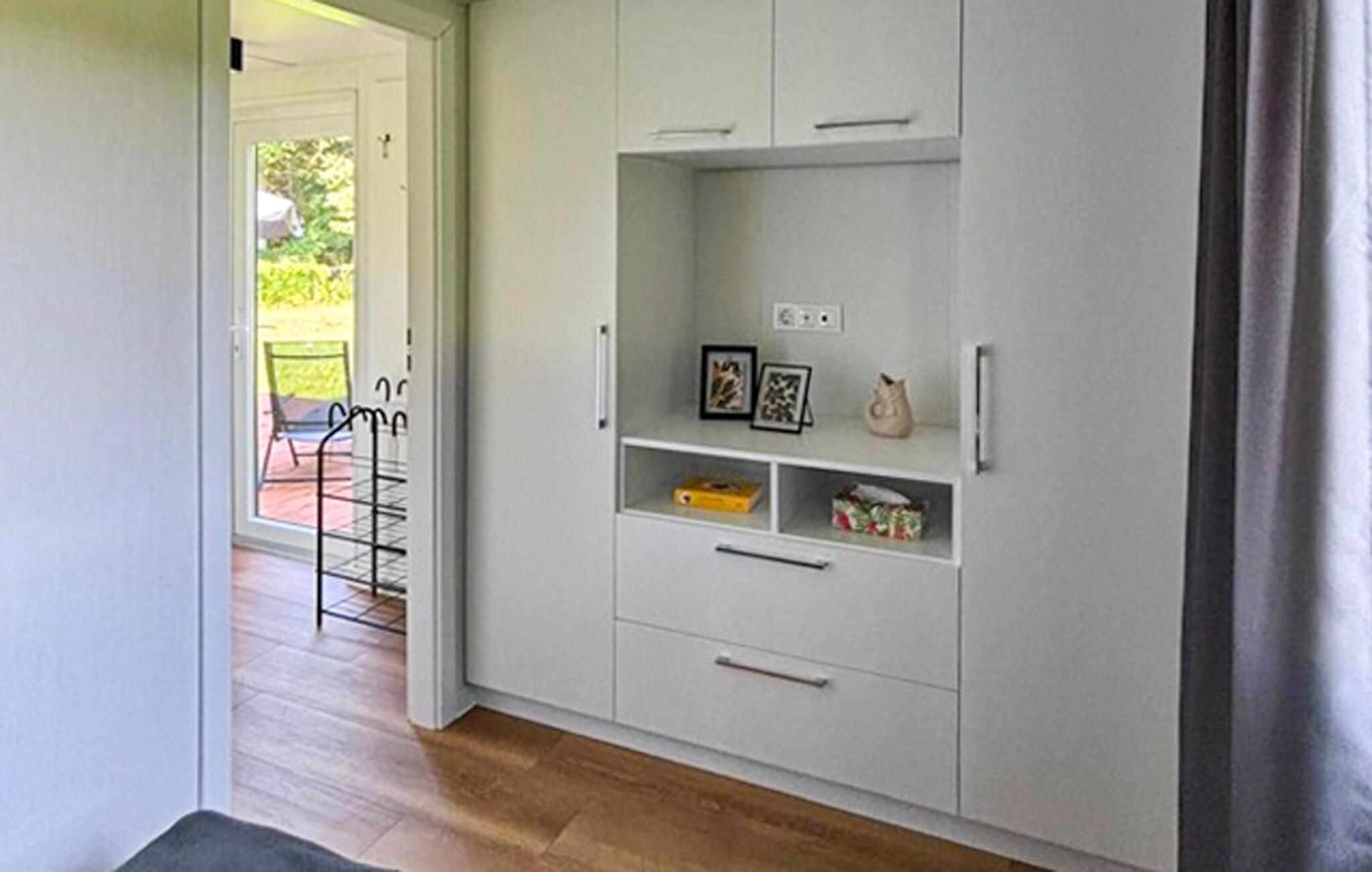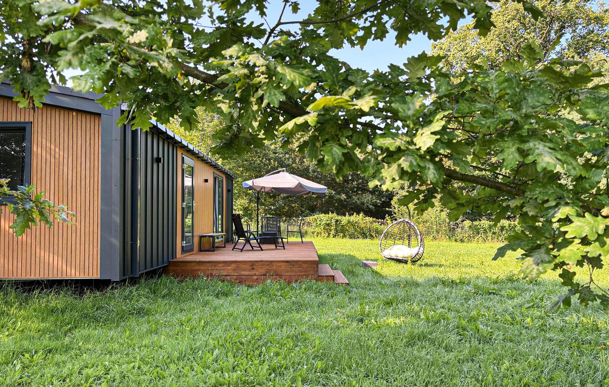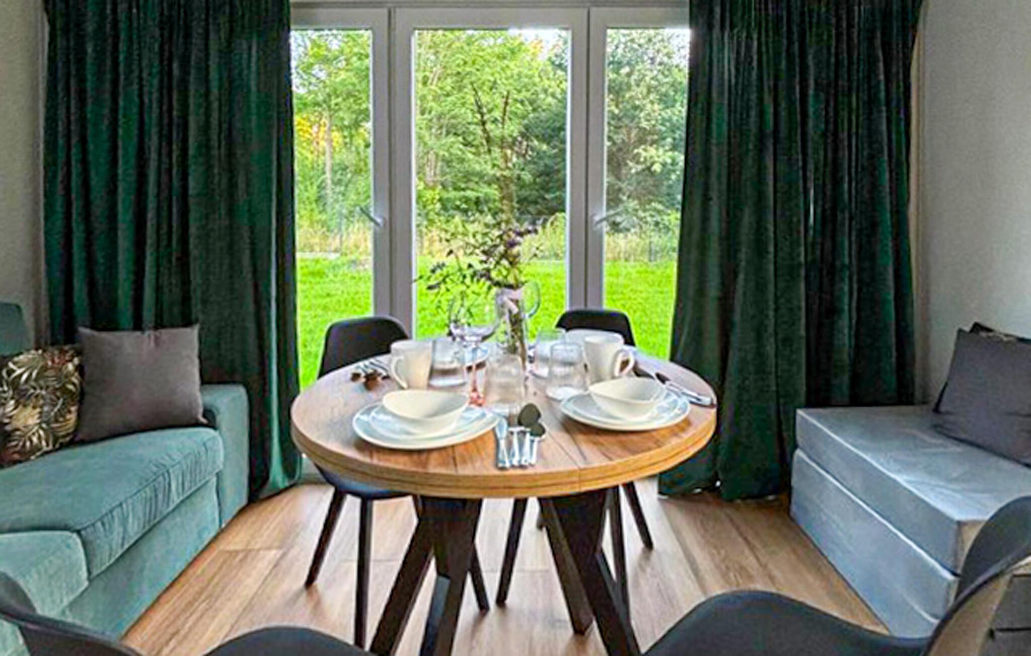 Genießen Sie entspannte Tage in diesem stilvollen Ferienhaus, das modernen Komfort mit naturnaher Lage verbindet. Ob als Paar oder mit Familie – hier finden Sie die ideale Mischung aus Erholung, Aktivität und Gemütlichkeit. Betreten Sie den hellen Wohnbereich und fühlen Sie sich sofort wohl. Nutzen Sie die kleine Küche, um gemeinsame Mahlzeiten zuzubereiten, und speisen Sie am Esstisch mit Blick in den grünen Garten. Machen Sie es sich auf dem Sofa gemütlich und genießen Sie die ruhige Atmosphäre.