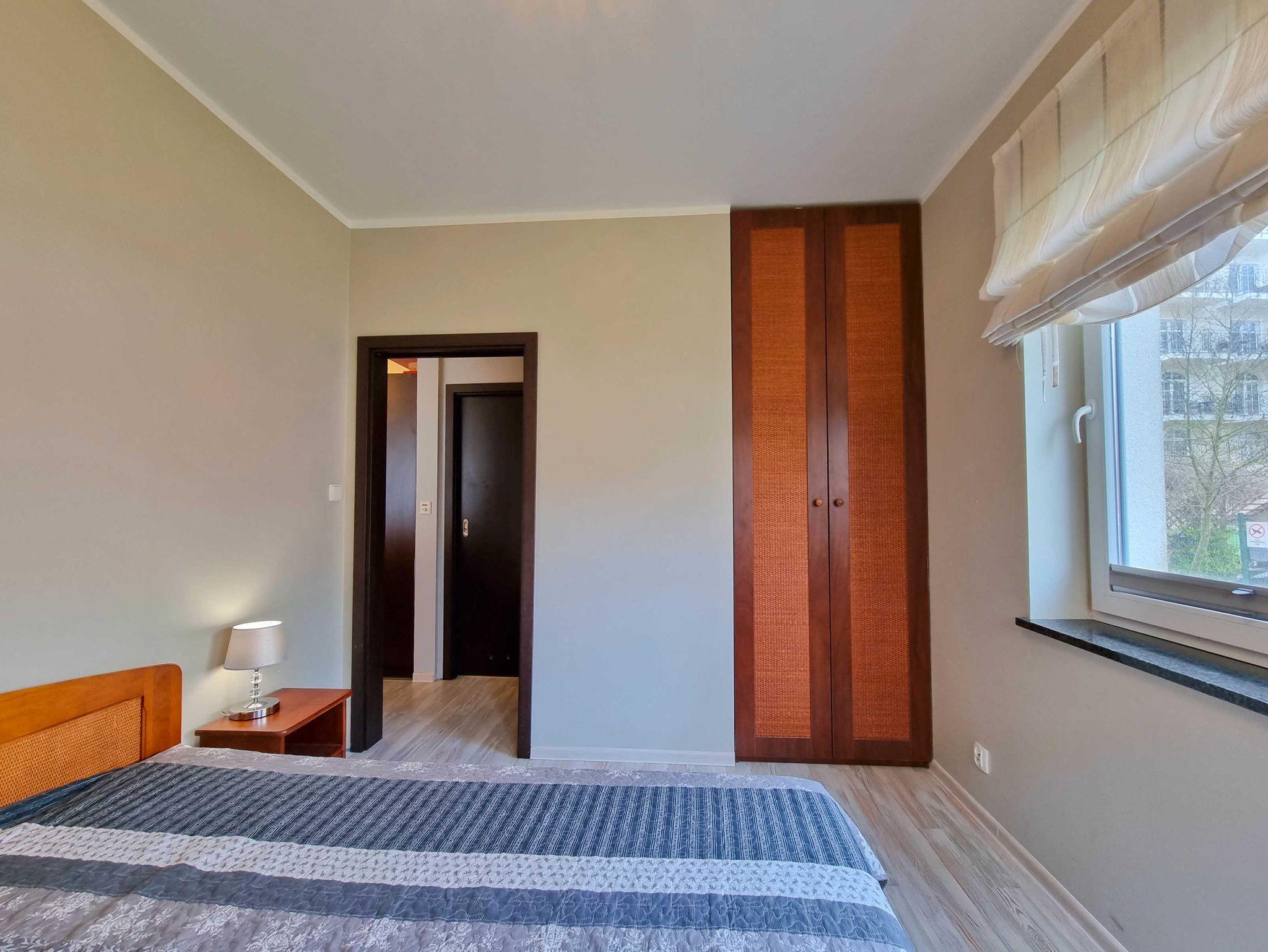 Wohnung mit Wohnzimmer mit Anhang und Schlafzimmer von 47m2 befindet sich im Erdgeschoss eines Gebäudes mit Aufzug. Das Schlafzimmer ist mit einem Doppelbett (140cmx 200cm), Nachttischen und Lampen ausgestattet. Das Wohnzimmer hat ein Schlafsofa, einen Couchtisch, einen LCD-Fernseher und eine Essecke mit Hockern. Vom Wohnzimmer aus gelangt man auf eine Terrasse mit einem Tisch und vier Korbstühlen. Die Küchenzeile ist mit den wichtigsten Utensilien für die Zubereitung und den Verzehr von Mahlzeiten ausgestattet und verfügt über einen 4-Flammen-Elektroherd, einen Backofen, einen Kühlschrank, einen Wasserkocher, eine Kaffeemaschine, einen Toaster, Teller und Besteck. In der Diele befindet sich ein großer Kleiderschrank. Badezimmer mit WC, Waschbecken, Bidet und bodengleicher Dusche.