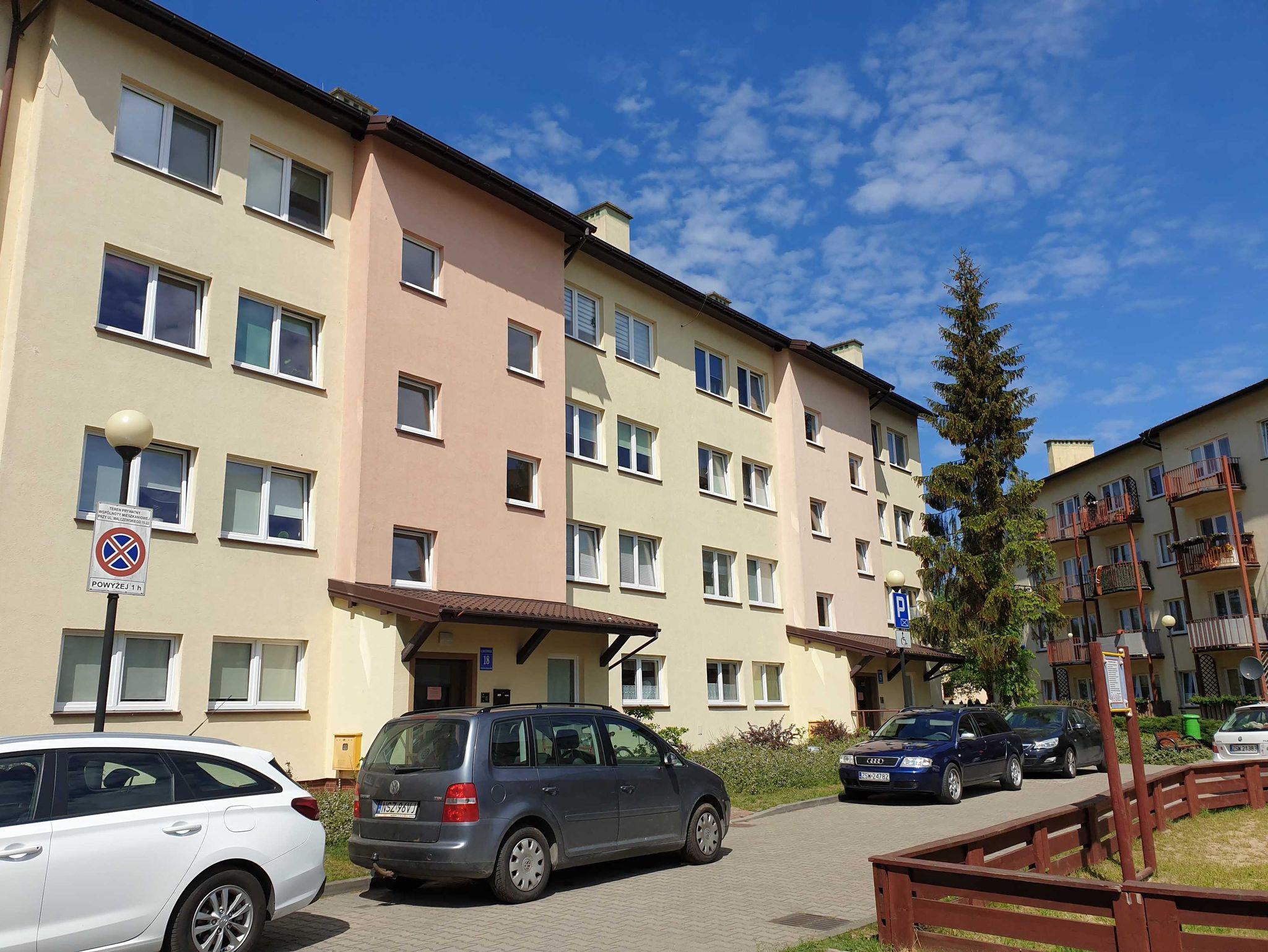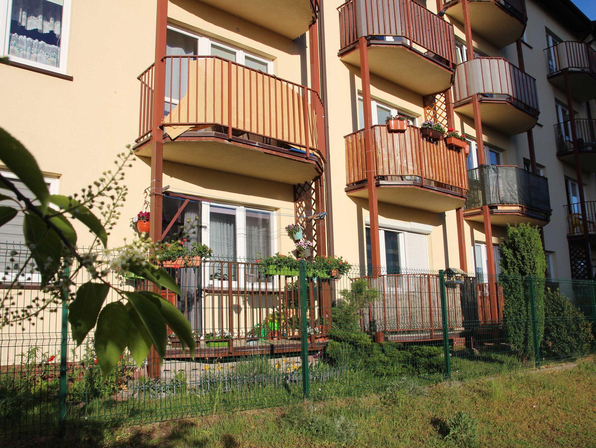 Eine 2-Zimmer-Wohnung mit Balkon befindet sich im Erdgeschoss eines Mehrfamilienhauses. Es besteht aus einem Wohnzimmer, einem Schlafzimmer, einer separaten Küche und einem Badezimmer.