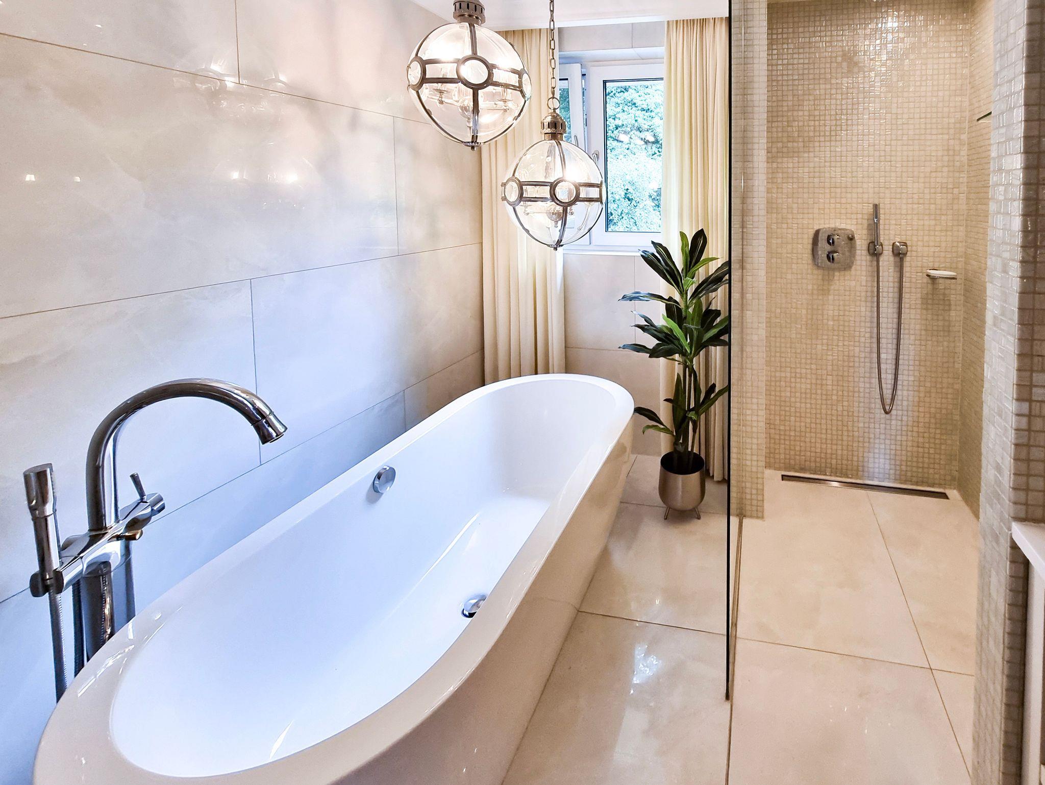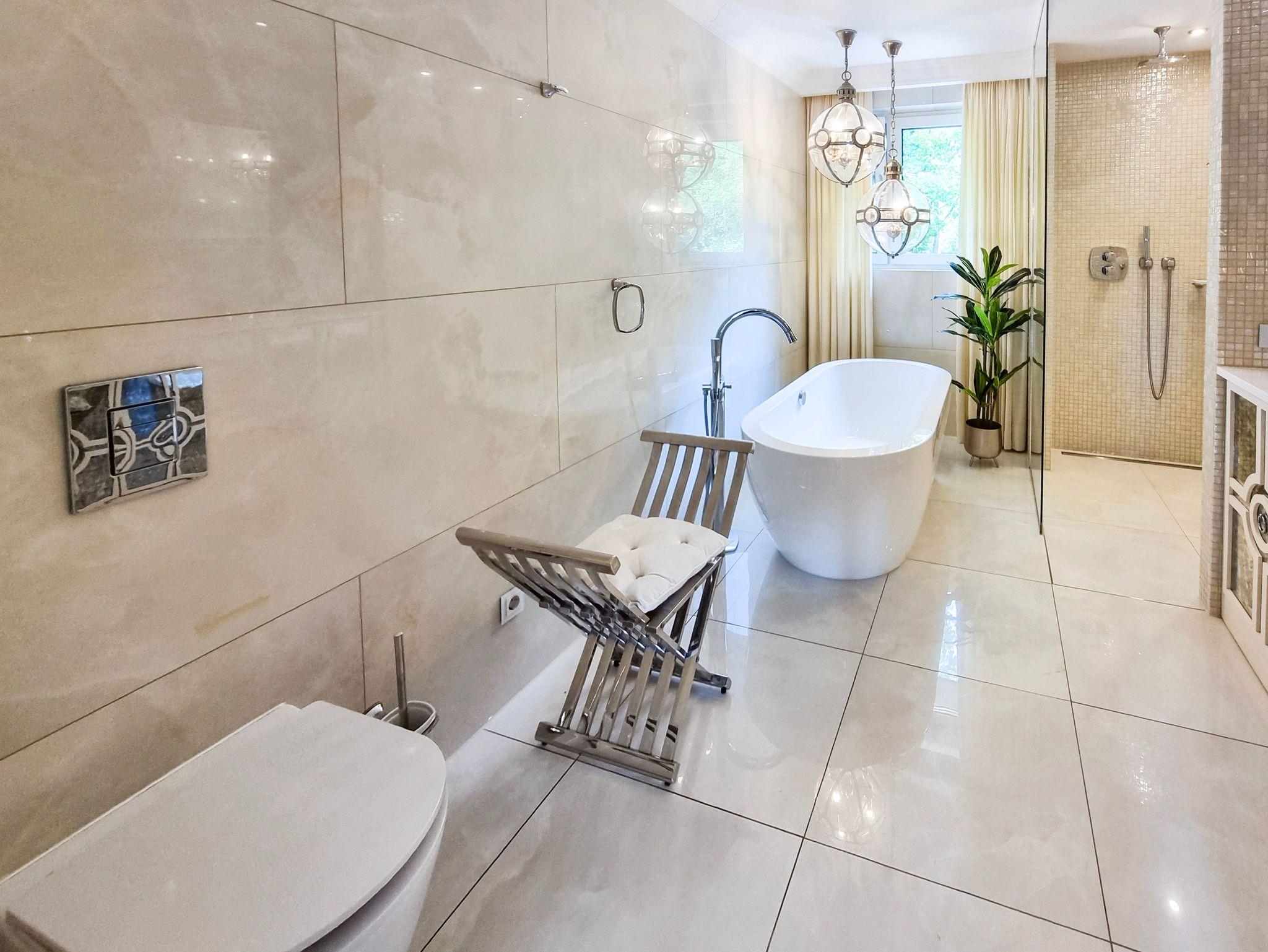 Großes Bad mit Badewanne und Dusche und Toilette.