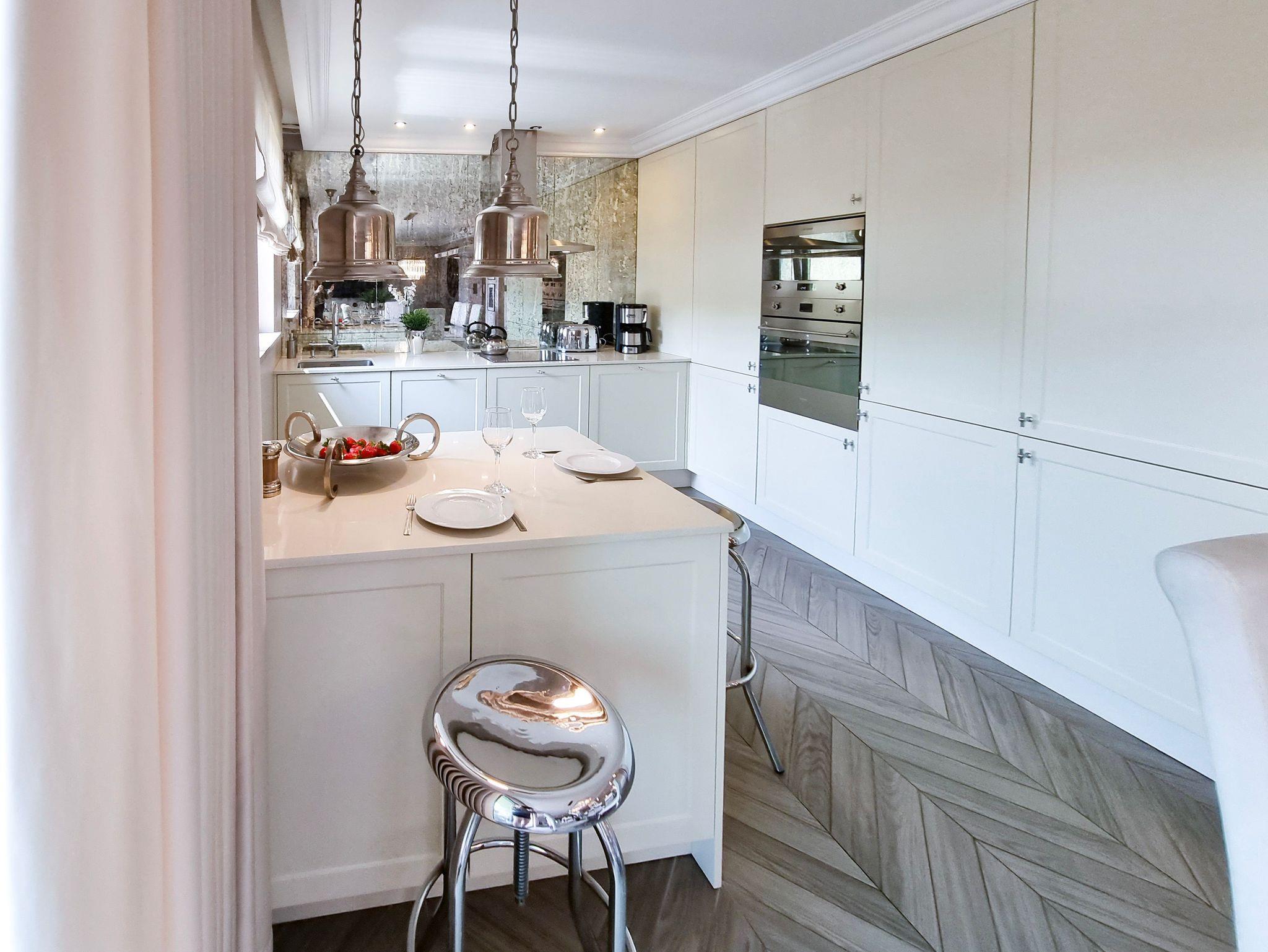 Voll ausgestattete Küchenzeile (Backofen, Mikrowelle, 4-Flammen-Herd, großer Kühlschrank, Gefrierschrank, Toaster, Transfermaschine, Geschirr, Töpfe, Besteck).