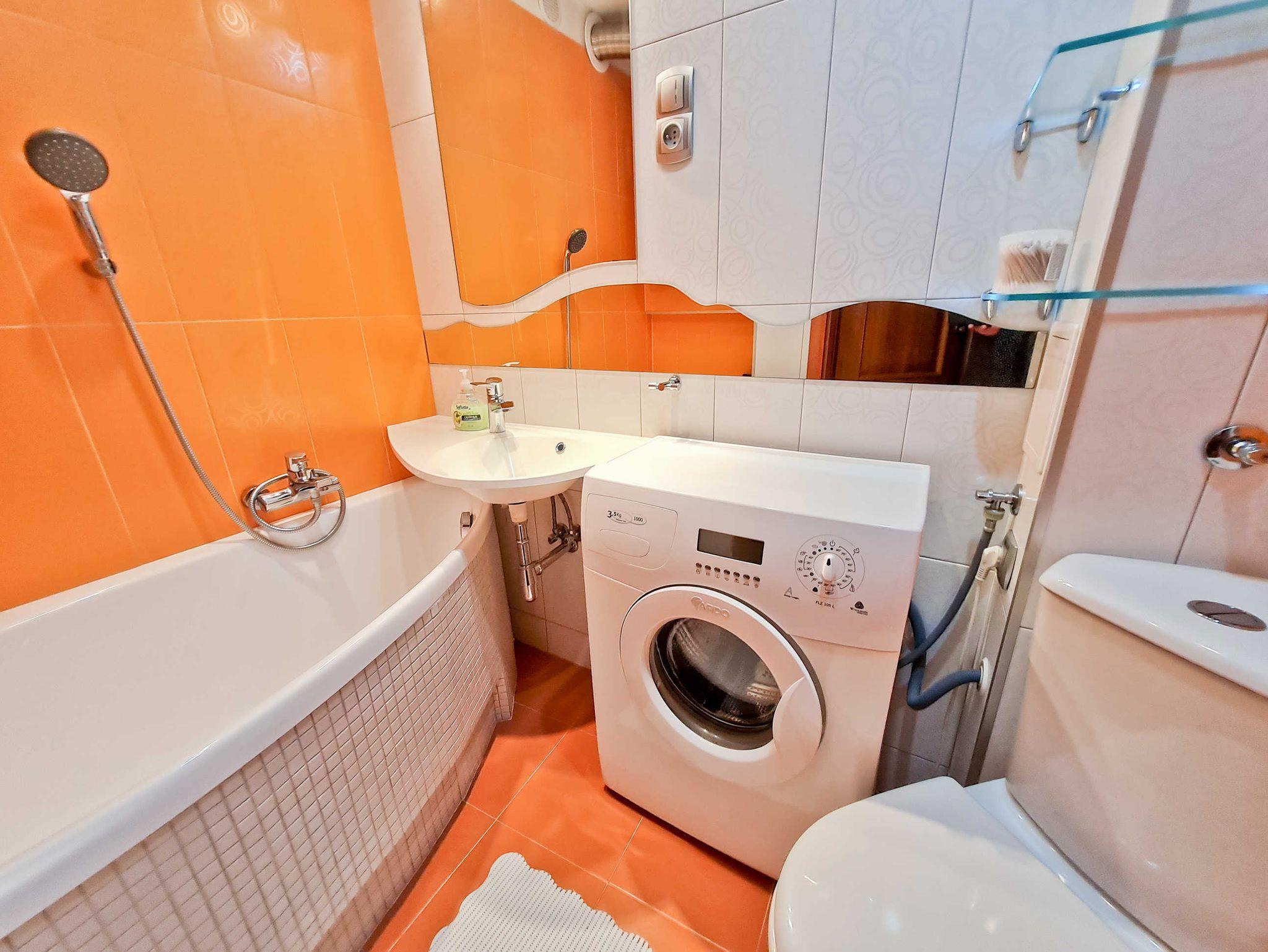 Badezimmer mit Badewanne, Waschbecken, WC und Waschmaschine.