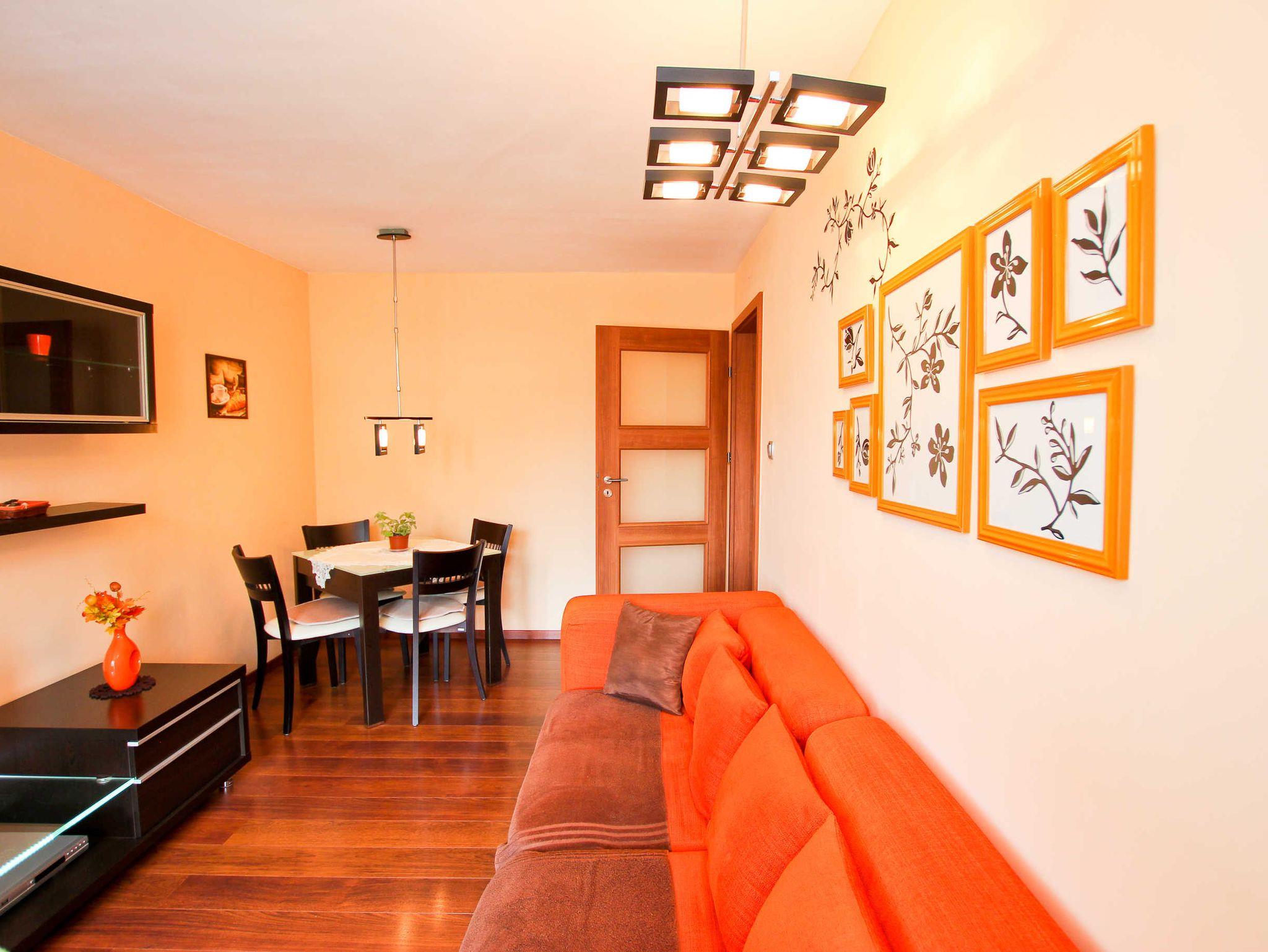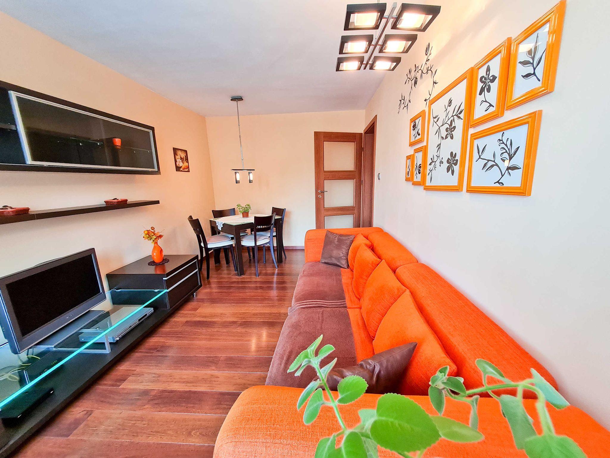 Im Wohnzimmer befindet sich der Ausgang auf einen kleinen Balkon, ebenfalls eine ausziehbare Couch, Kommode, Fernseher und ein Tisch mit 4 Stühlen.