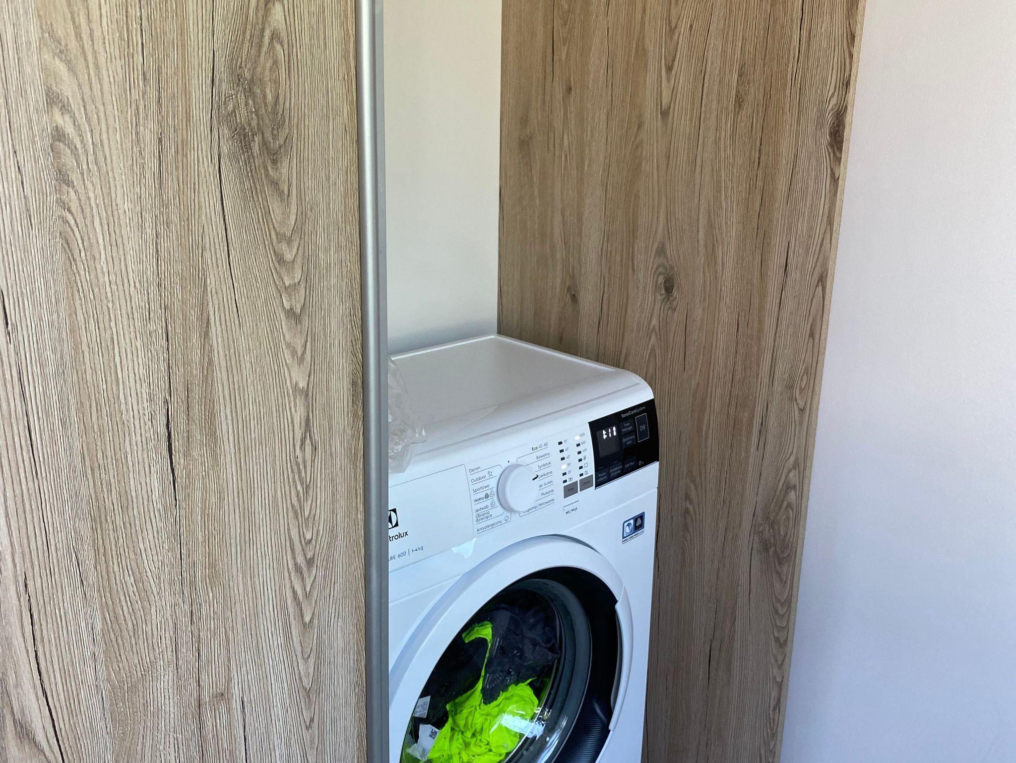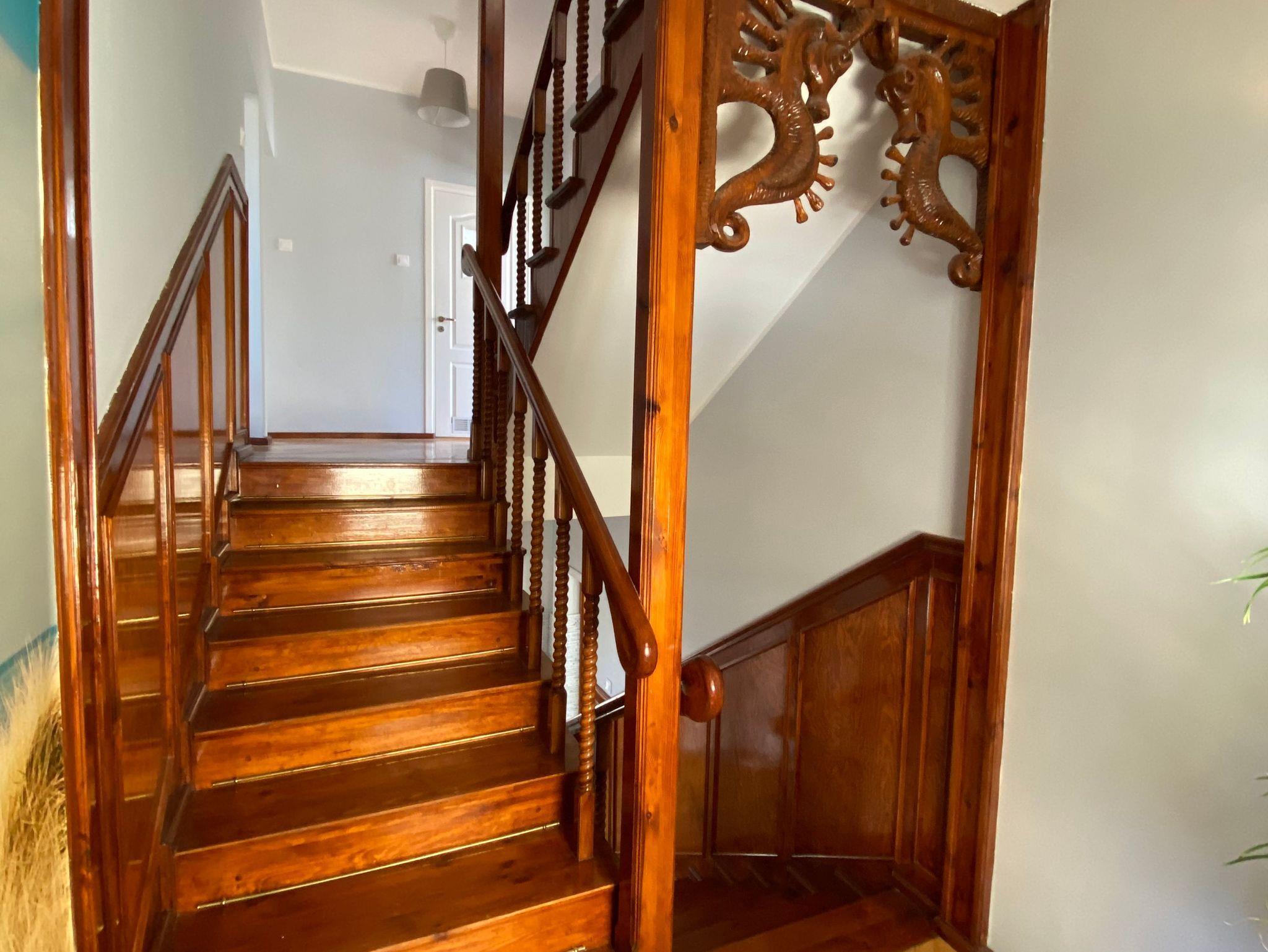 Auf der hohen Erdgeschoss gibt es ein geräumiges Wohnzimmer (mit nicht klappbaren Ecke), Esszimmer, separate Küche, Hauswirtschaftsraum mit Waschmaschine, großes Bad mit Dusche und WC, Balkon mit Blick auf die Straße und einen zweiten Balkon mit Strandkorb und Zugang zum großen Garten.