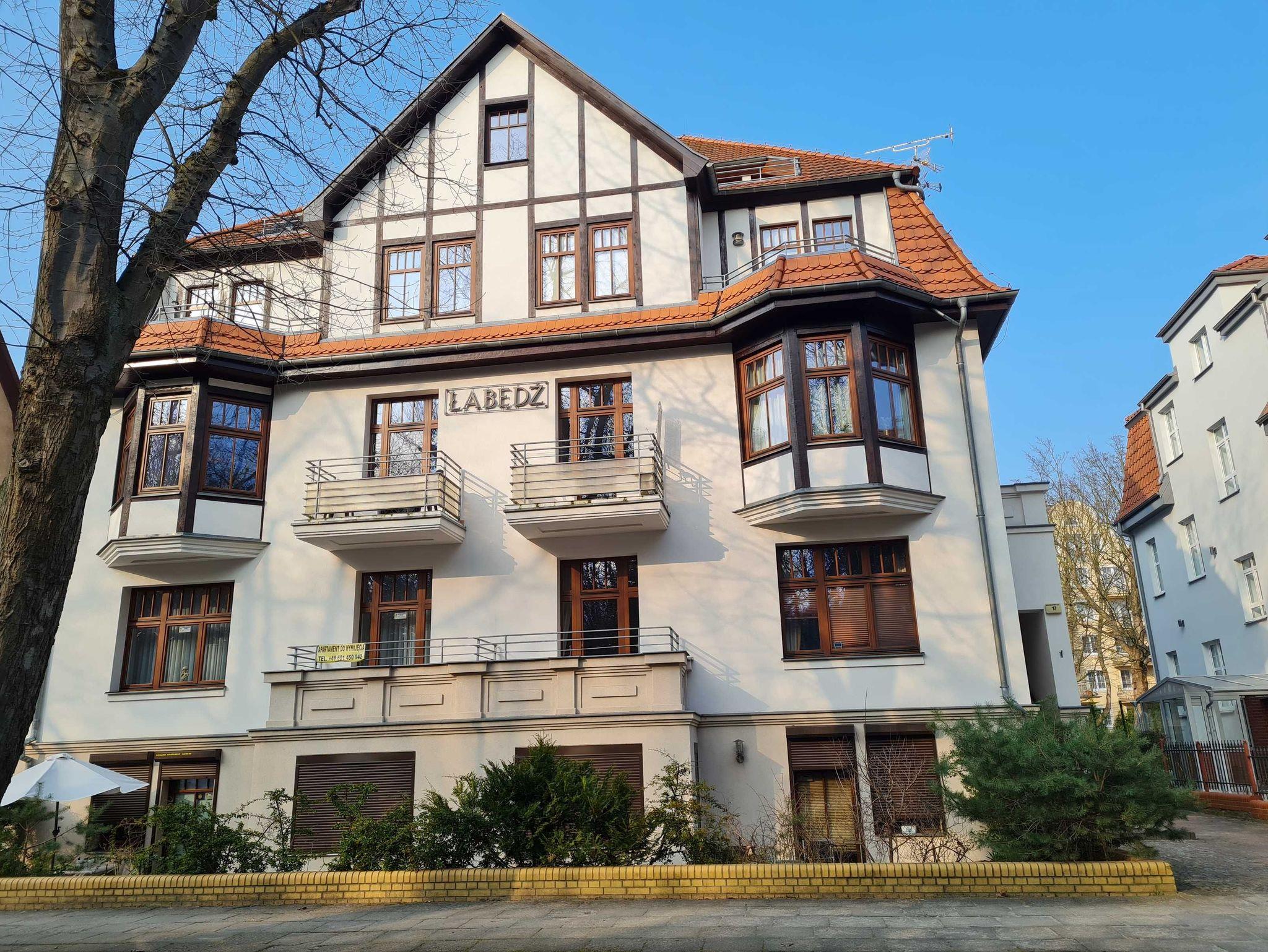 Das Appartementhaus ?Labedz befindet sich in dem ?Kurviertel der Stadt Swinemünde in der Sienkiewicza Strasse 17 und ist nur 100m von der Promenade und 200m vom Strand entfernt. Im Rahmen eines komplexen Ausbaus und Modernisierung des Gebäudes ist es gelungen, die schönen Züge der Architektur der 20er Jahre sowohl außen als auch im Innern des Gebäudes beizubehalten. Das Haus hat vier Stockwerke mit ausgebautem Dachgeschoss. Zu Ihrer Verfügung stehen sehr individuell eingerichtete 2 Zimmer Appartements mit Bad, Küchenzeile und Fernsehen. Auf dem Gründstück befindet sich ein Grill- und Erholungsplatz. Darüber hinaus haben Sie die Möglichkeit auf dem Hof einen Parkplatz (B) zu mieten.